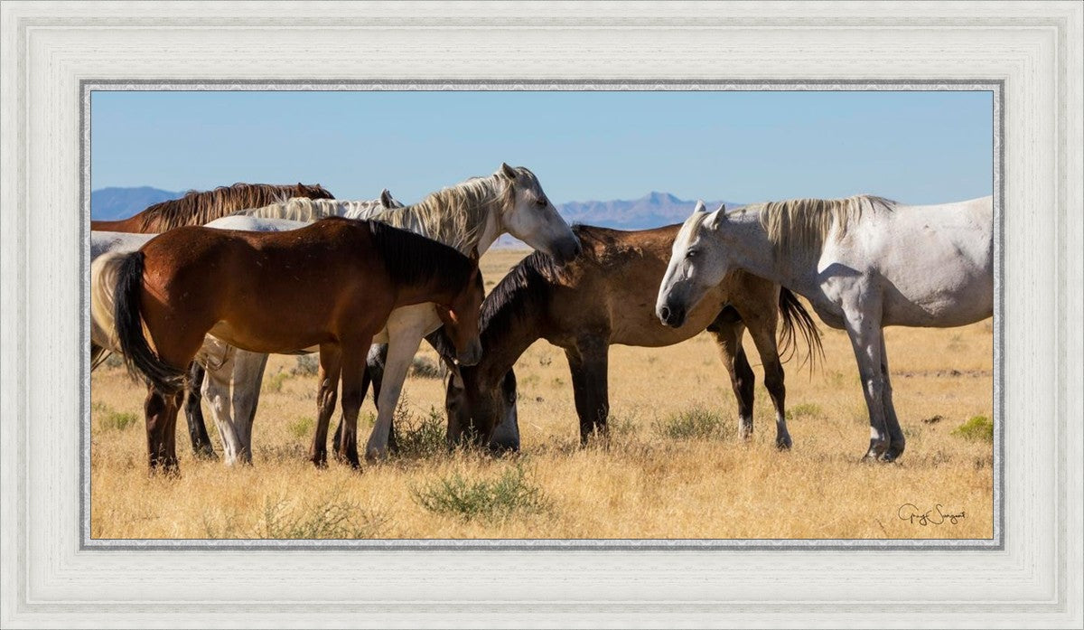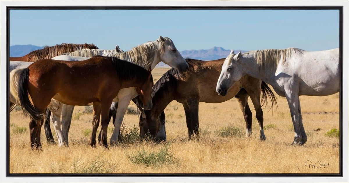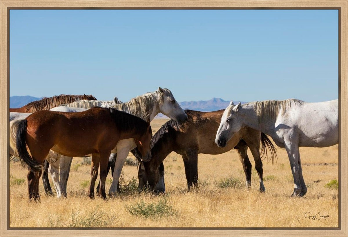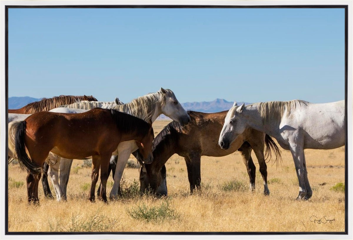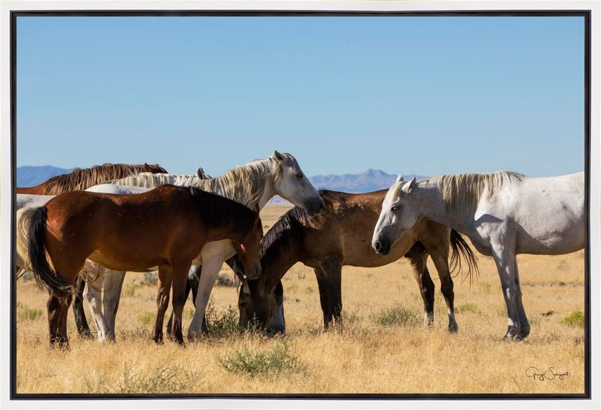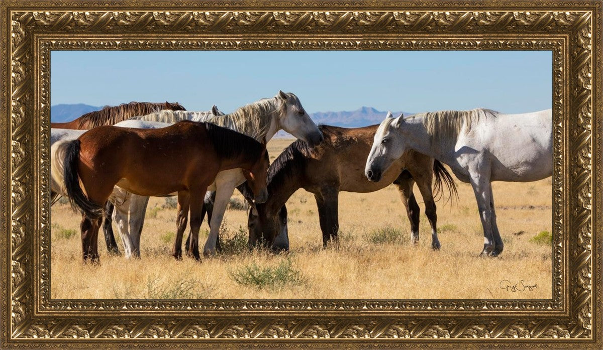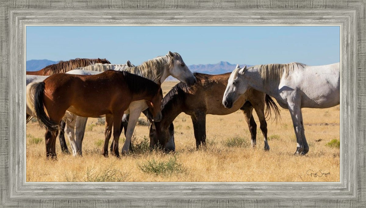 Wild horses gather in a group under the hot sun of the western desert.