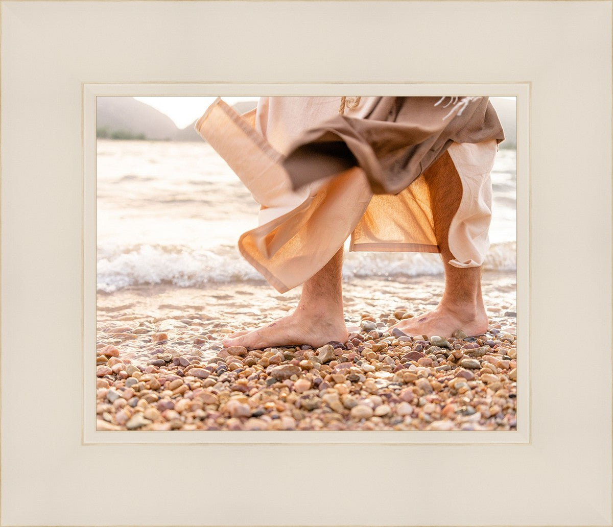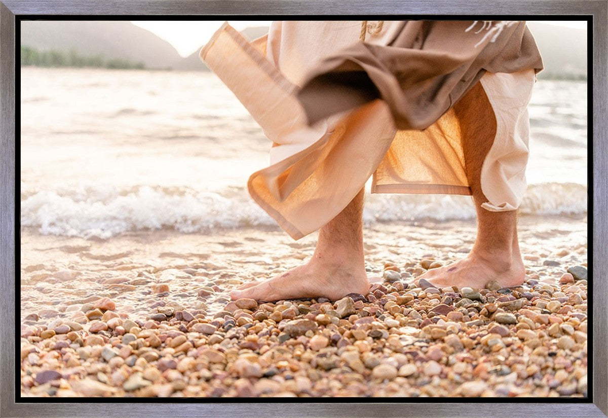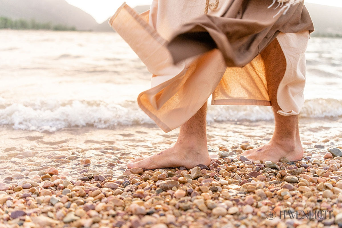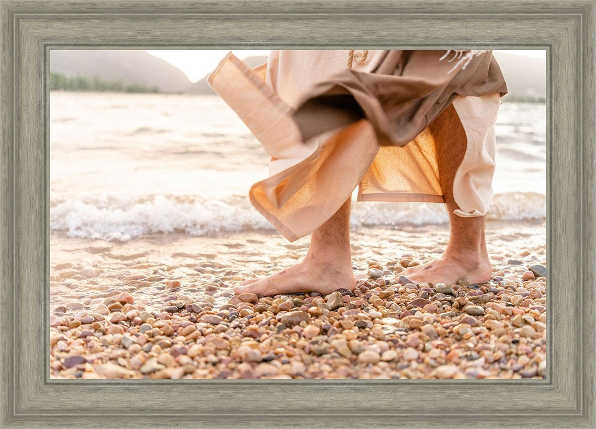 A photograph of a resurrected Jesus Christ walking along the shores of the Galilee Sea.