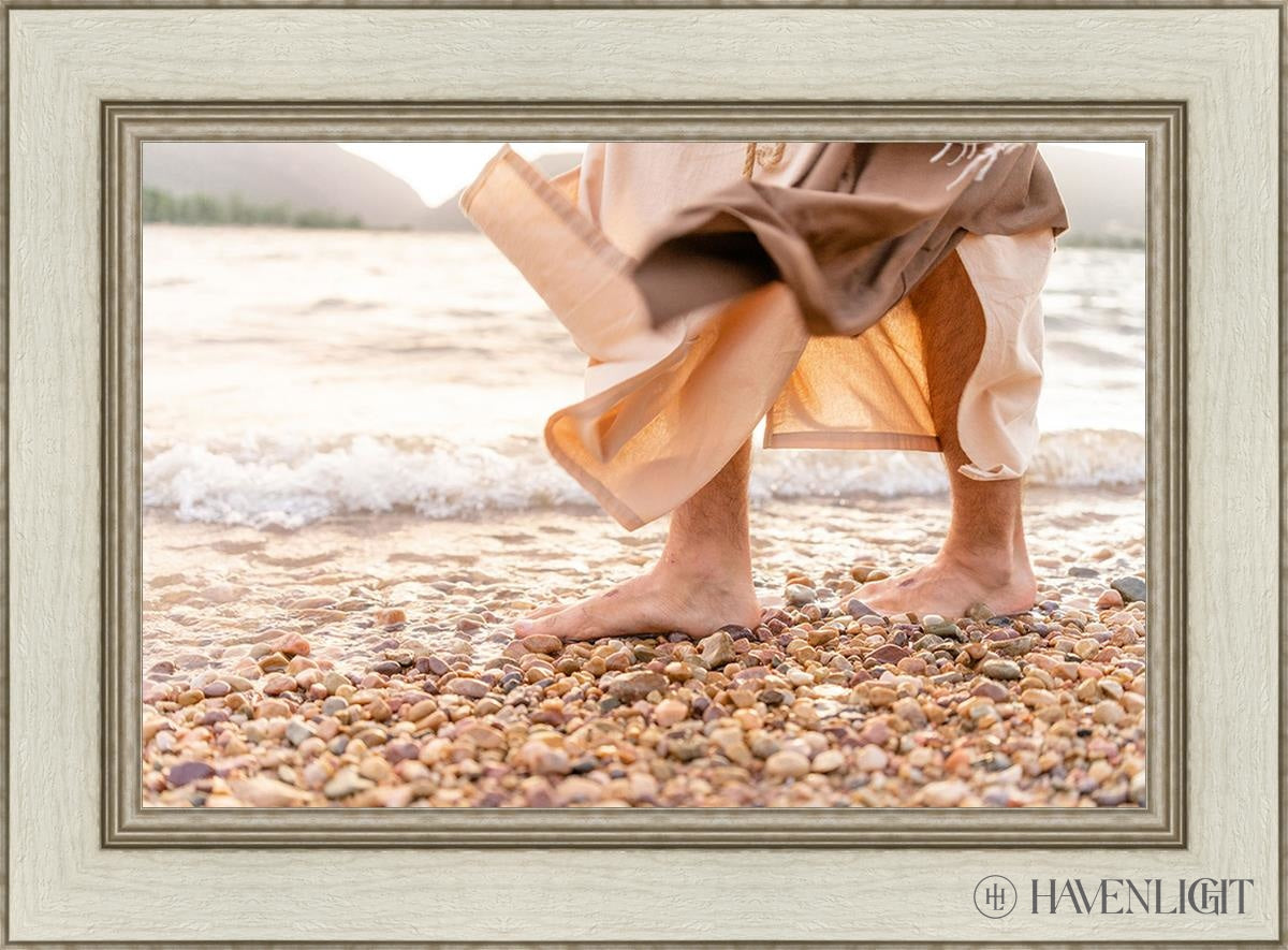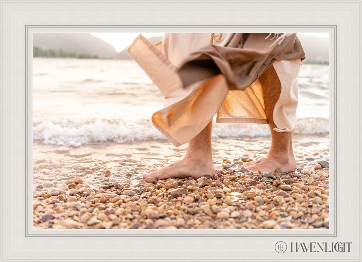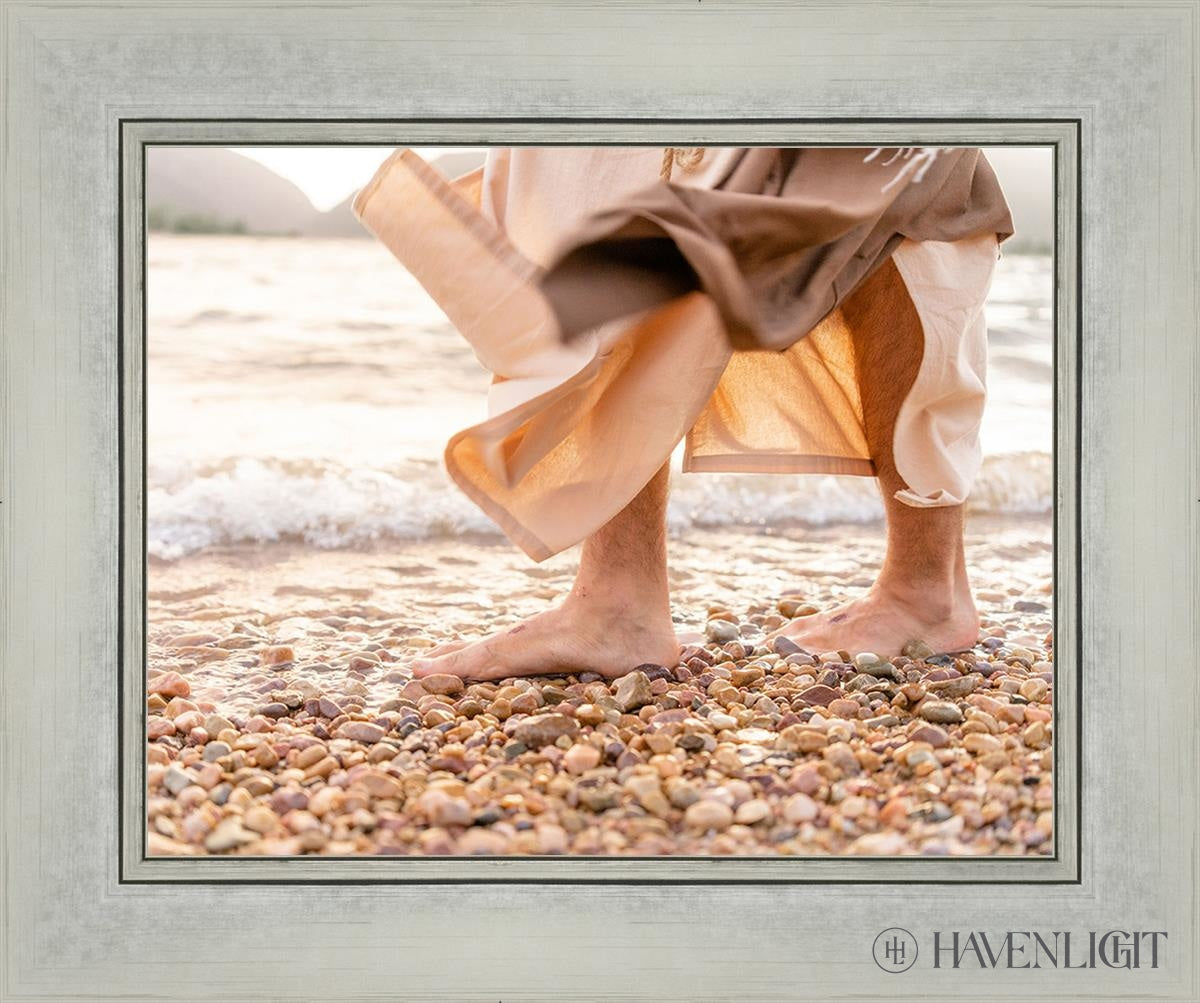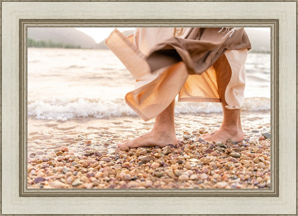 A photograph of a resurrected Jesus Christ walking along the shores of the Galilee Sea.
