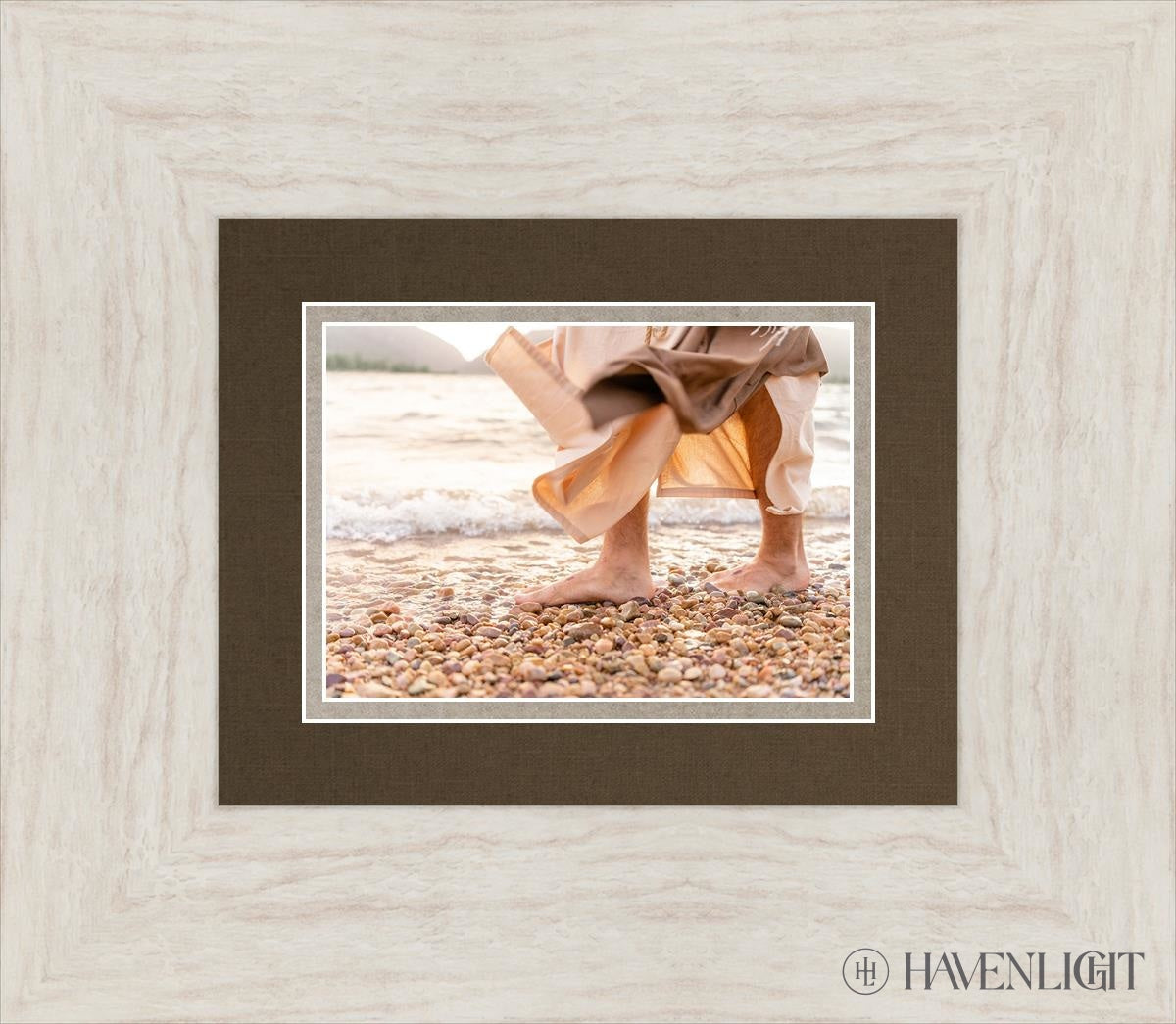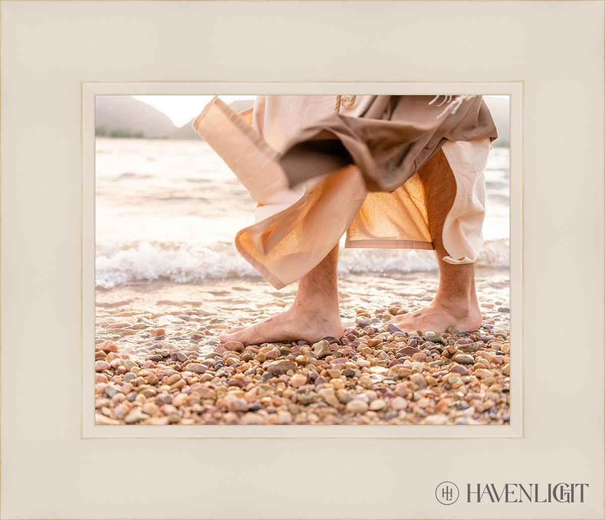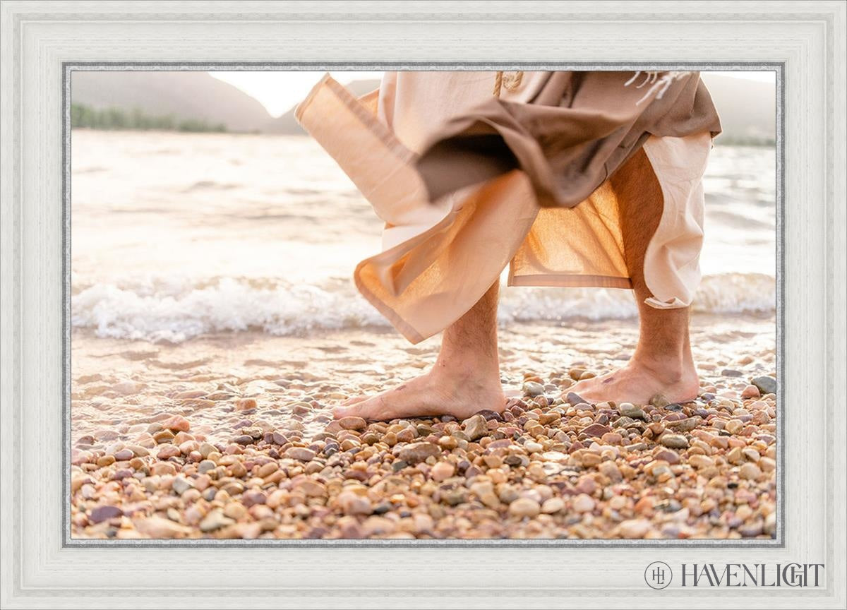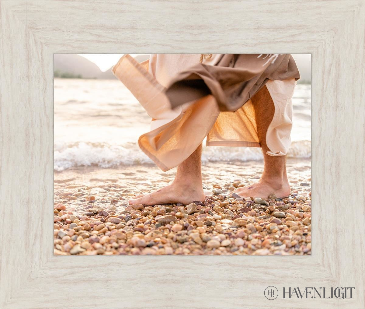 A photograph of a resurrected Jesus Christ walking along the shores of the Galilee Sea.