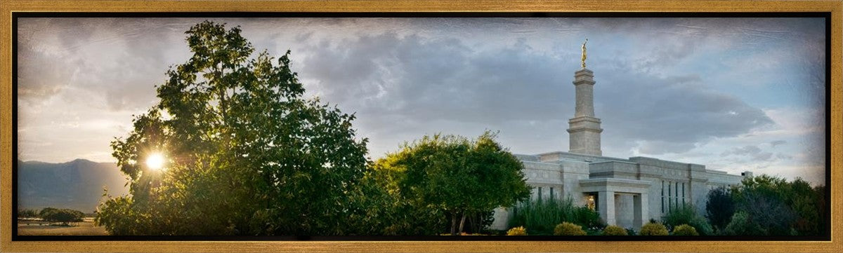 Since 1999 Landon has worked as an artisan in nearly 40 temples doing the decorative paint and gold leaf. He continues to do so as well as wood repair and graining. He was married in 2001 to Jacey Thomas in the Manti Utah temple. When she couldn’t find an image of the temple that she liked enough to purchase for their home, he decided to take one himself. That desire to create something original and different inspired his current series of temple art. They are taken from a panoramic viewpoint and stylized with an artistic border that reflect his paintings. All modern structures apart from the temple have been omitted.