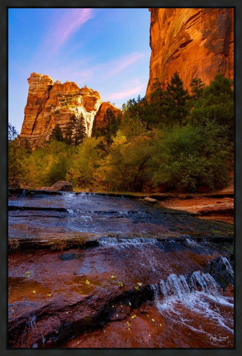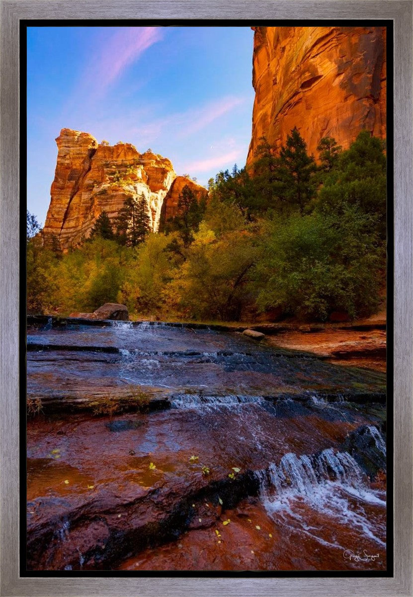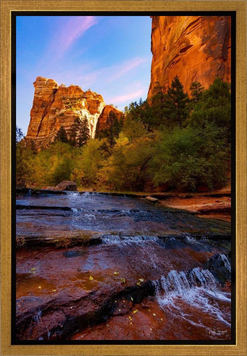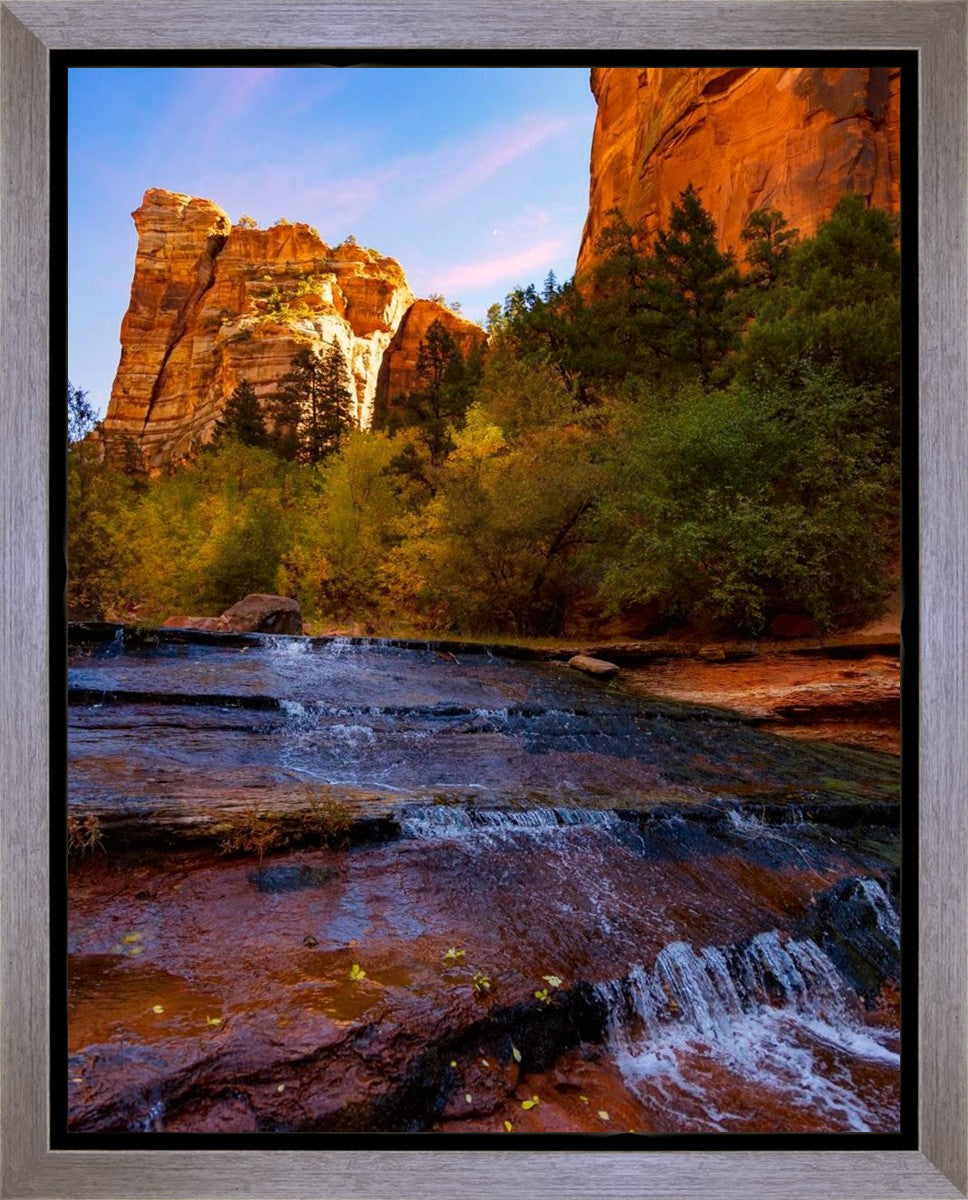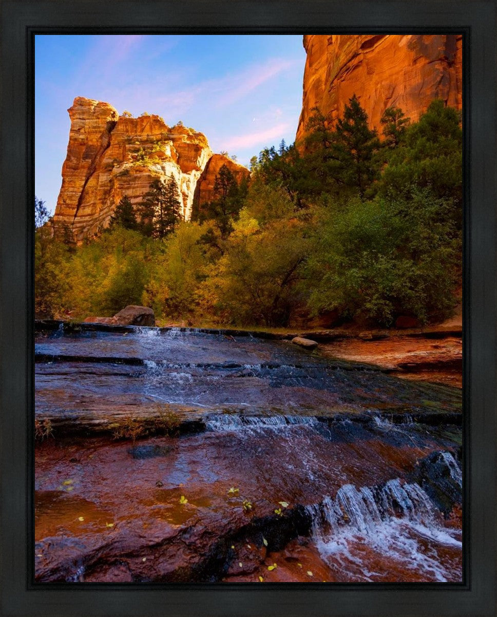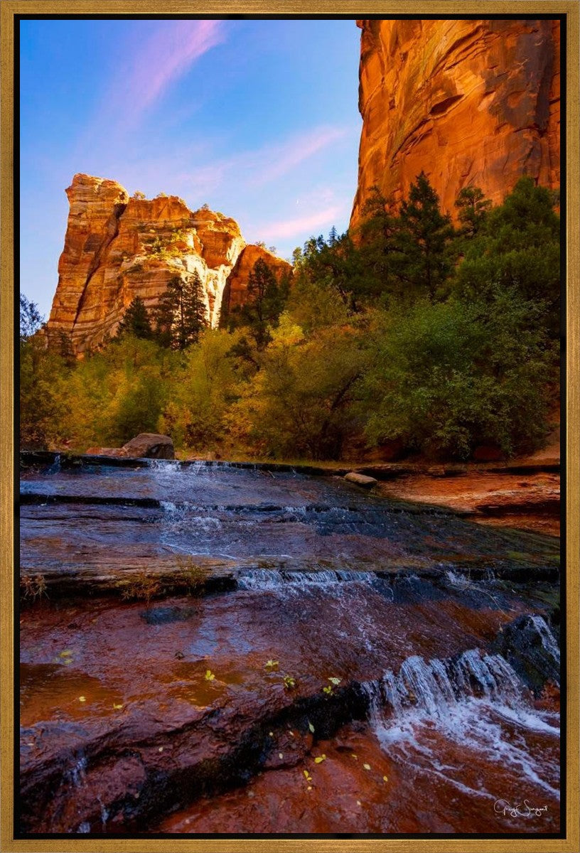 In the shadows, out of the morning sun the light crests a top the nearby cliffs as the water slowly flows over the beautiful red shale.