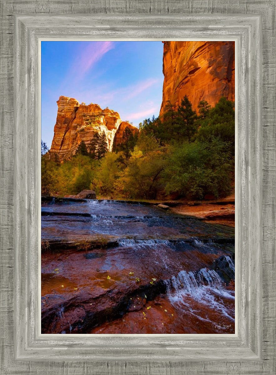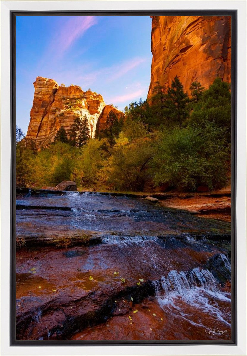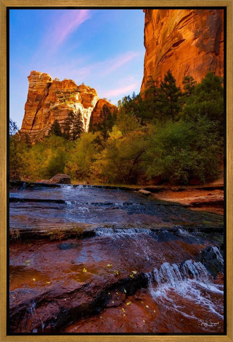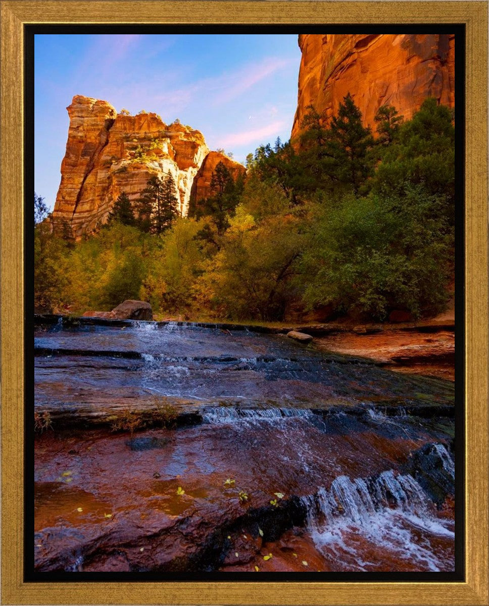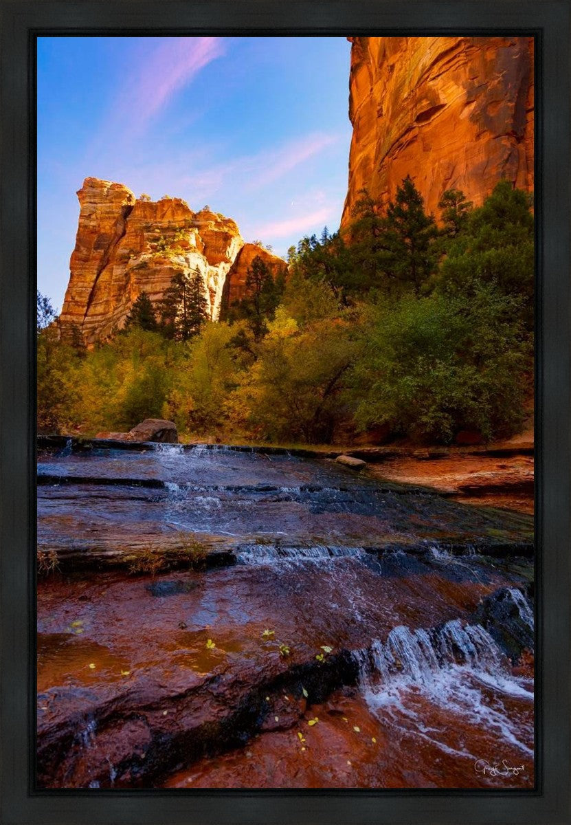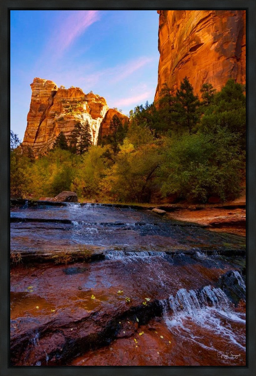 In the shadows, out of the morning sun the light crests a top the nearby cliffs as the water slowly flows over the beautiful red shale.