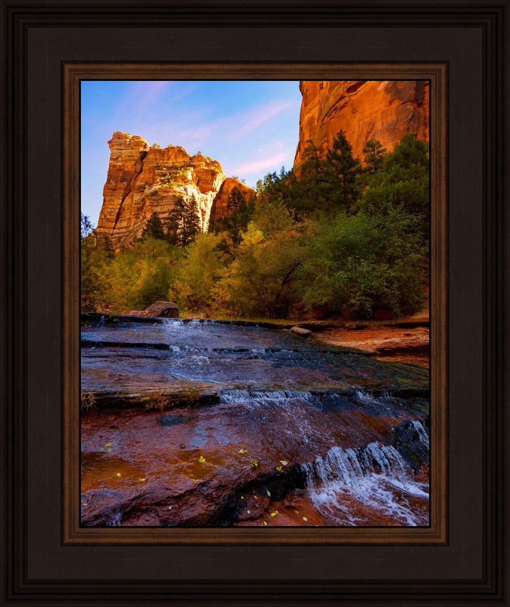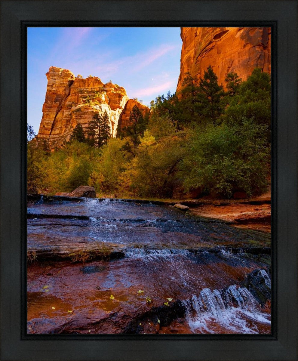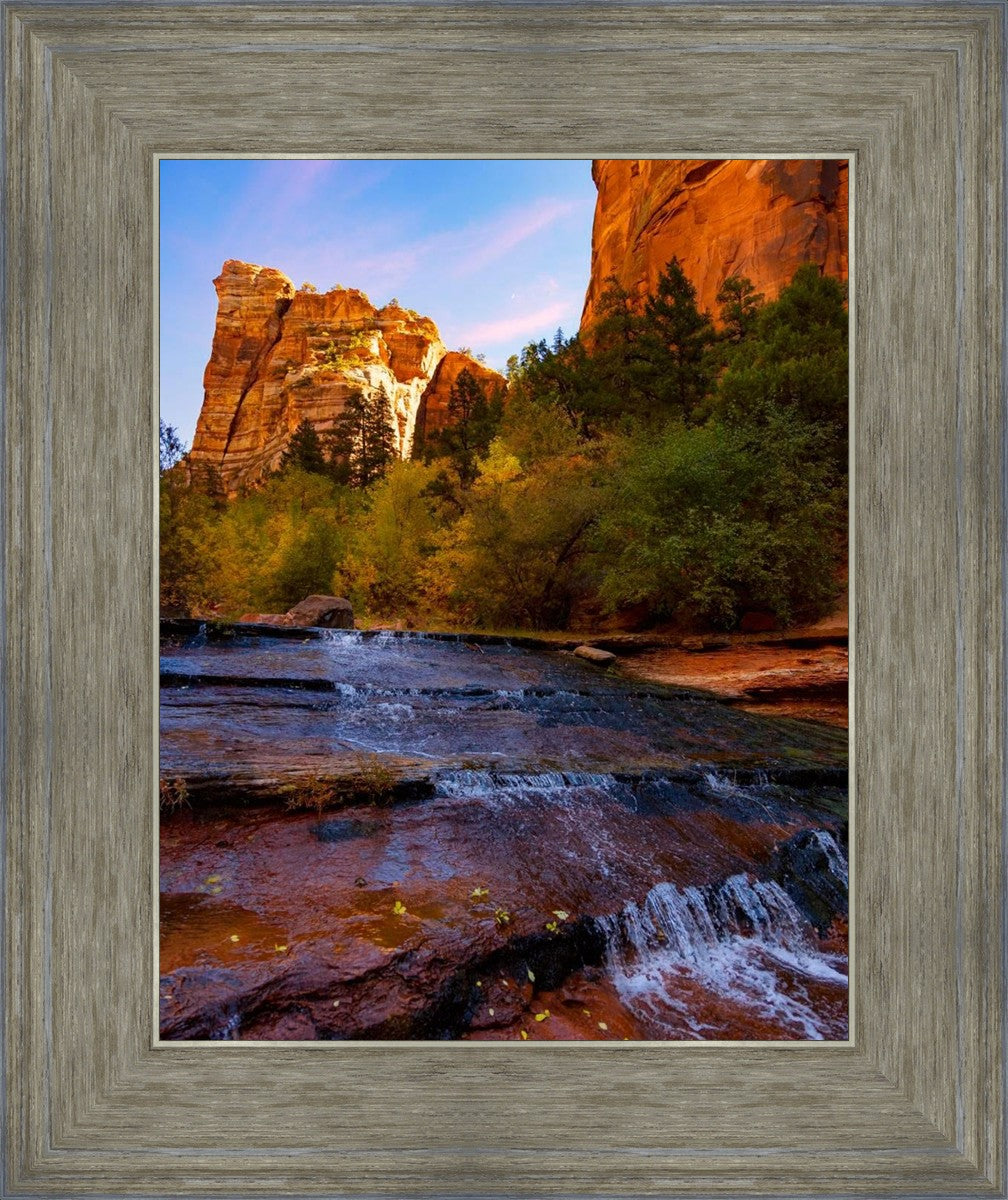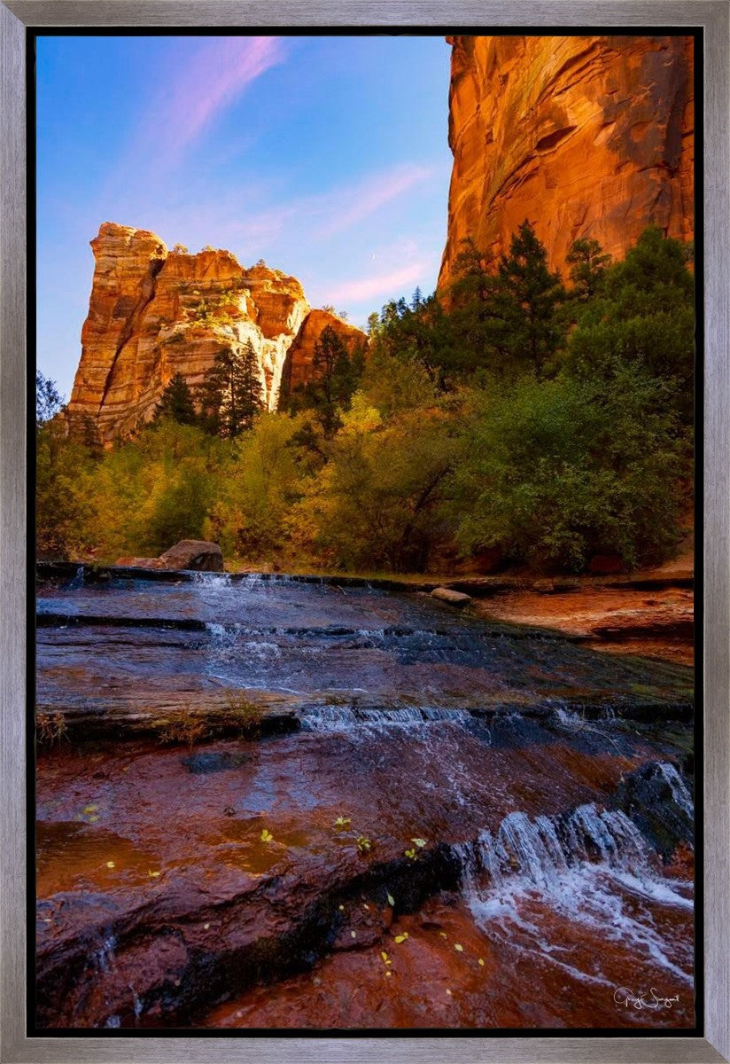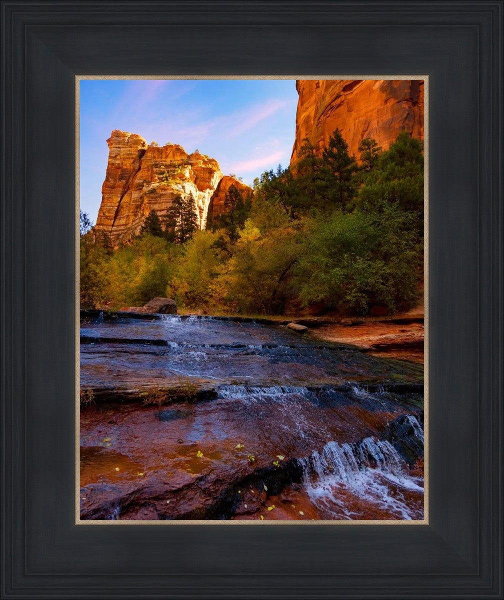 In the shadows, out of the morning sun the light crests a top the nearby cliffs as the water slowly flows over the beautiful red shale.