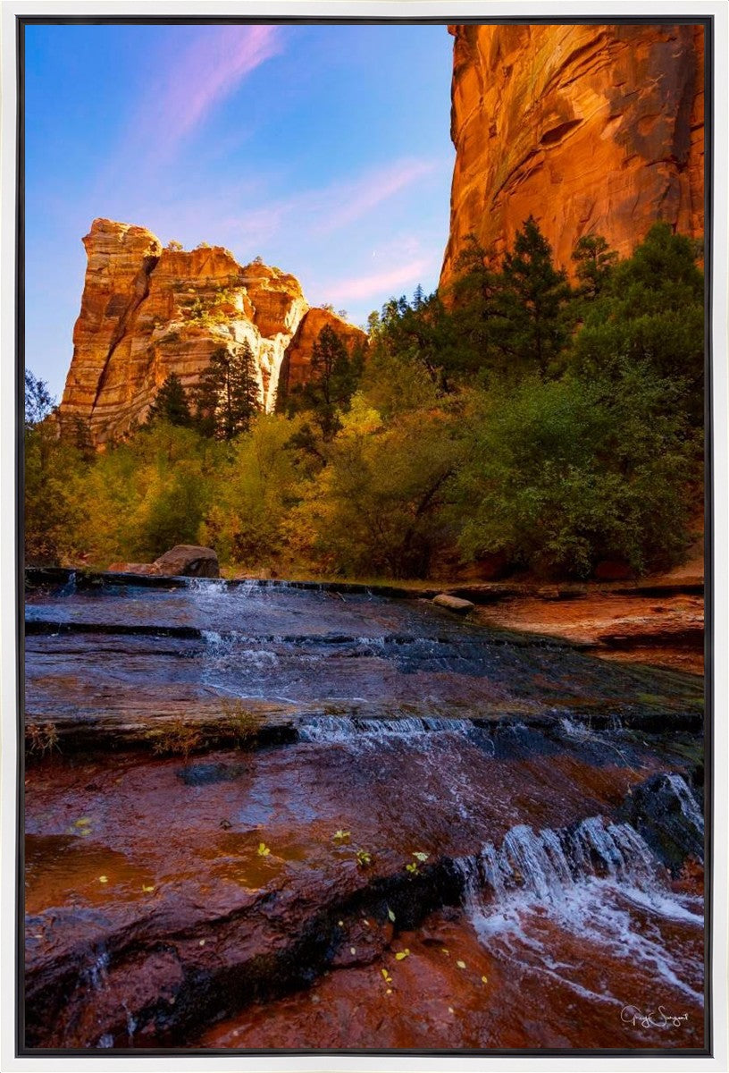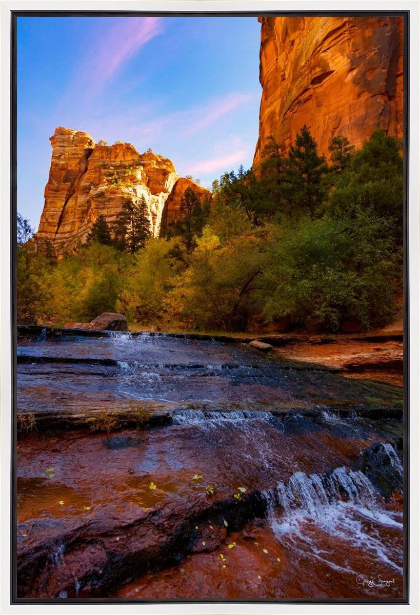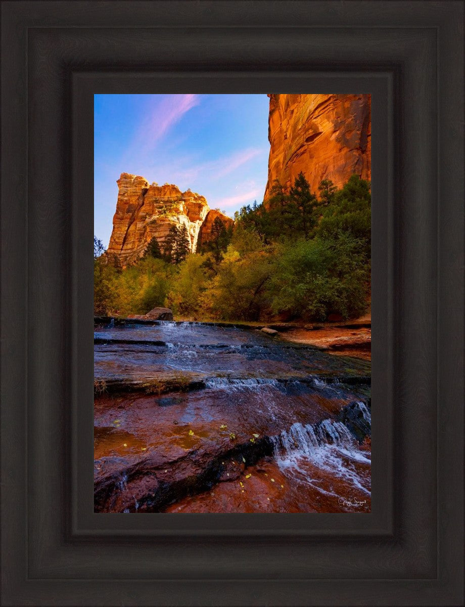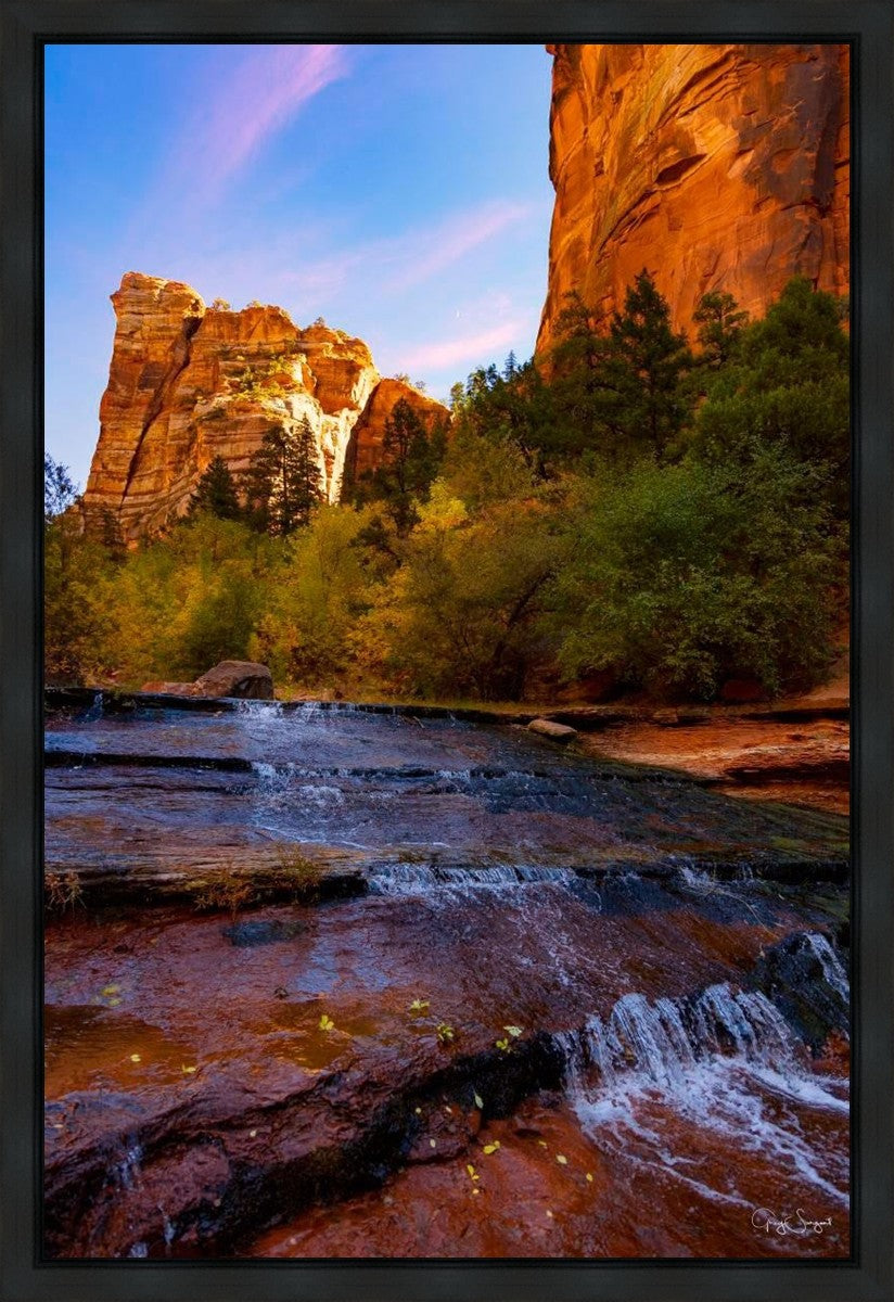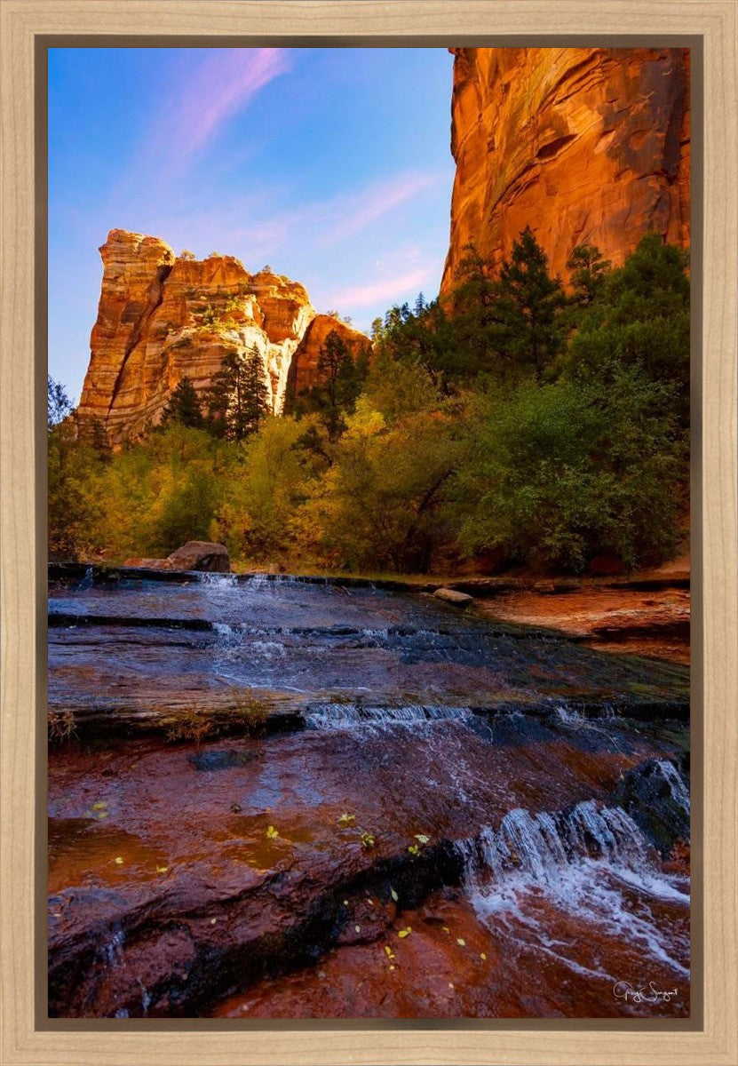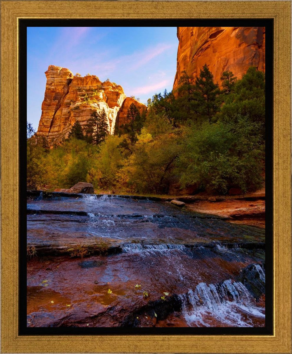 In the shadows, out of the morning sun the light crests a top the nearby cliffs as the water slowly flows over the beautiful red shale.