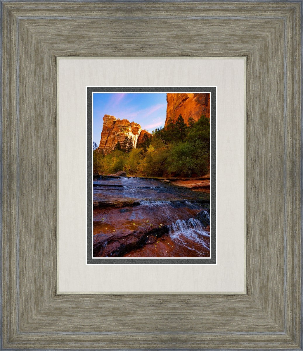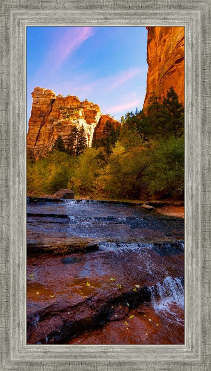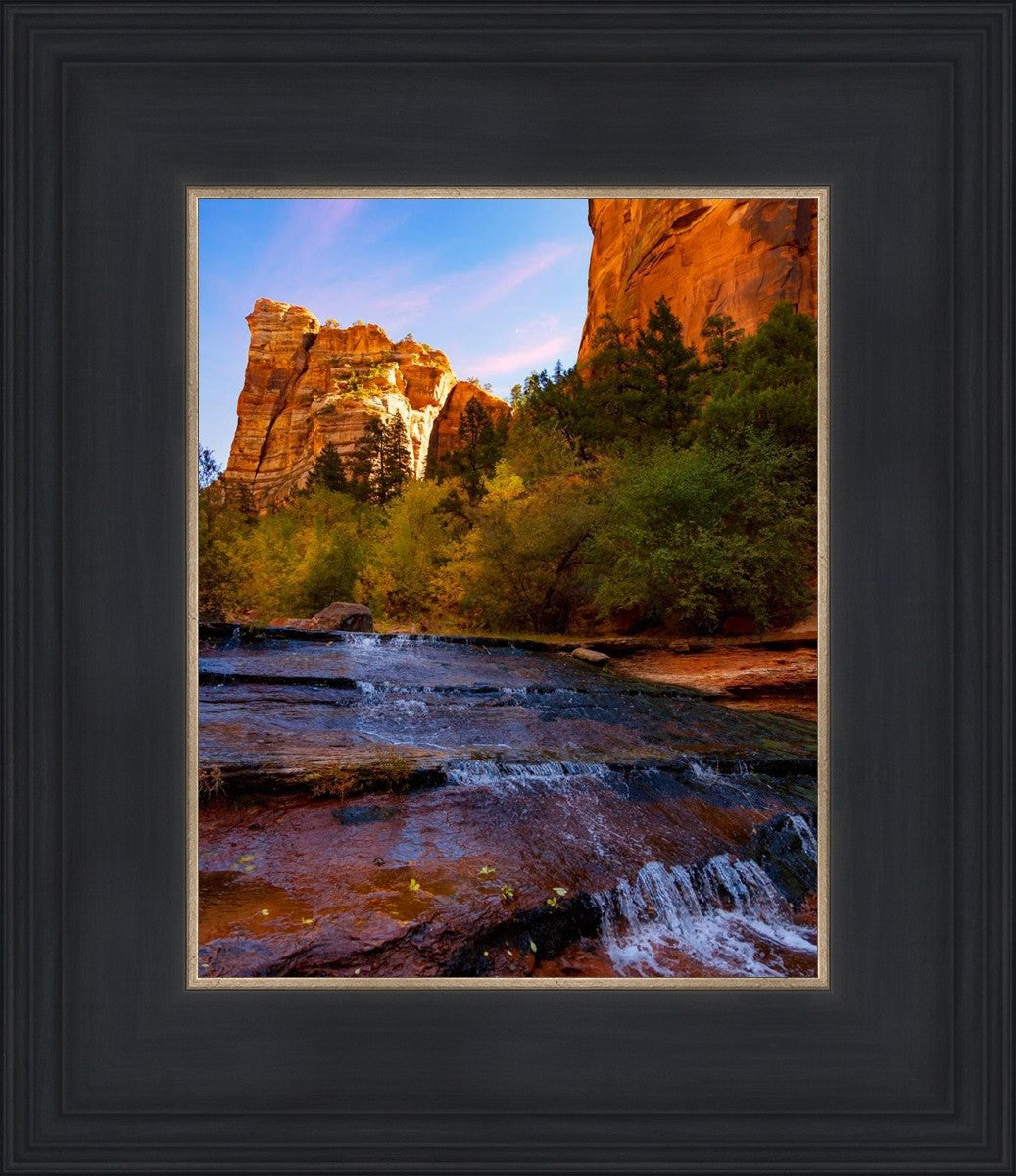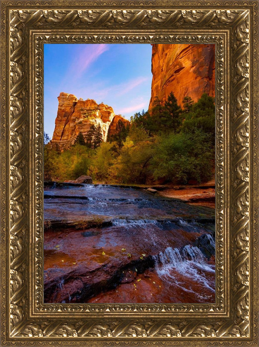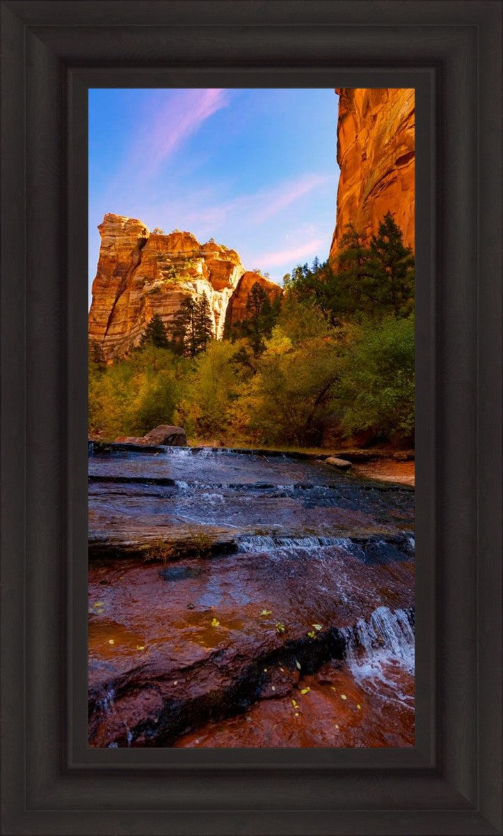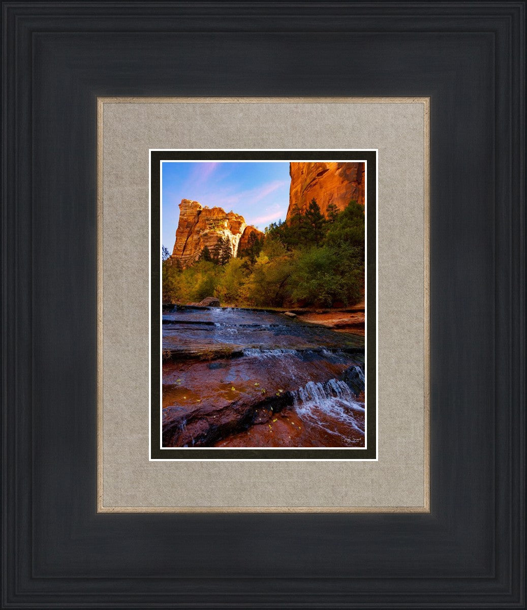 In the shadows, out of the morning sun the light crests a top the nearby cliffs as the water slowly flows over the beautiful red shale.