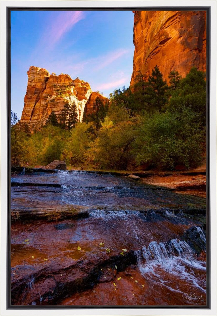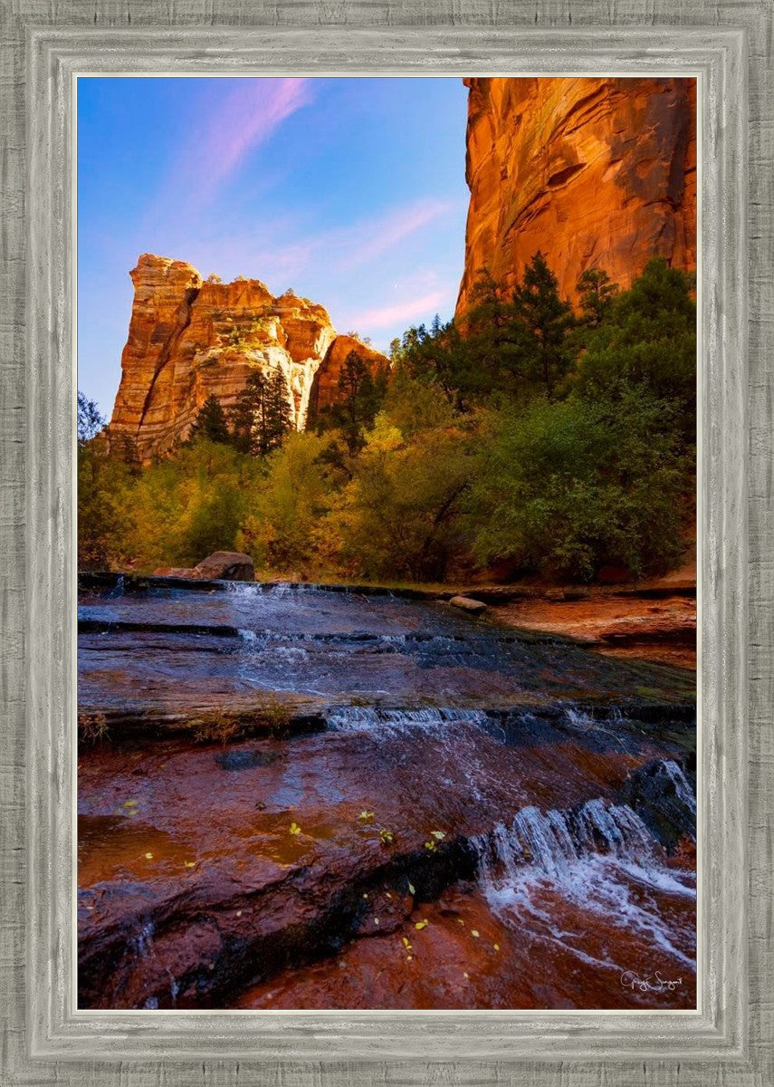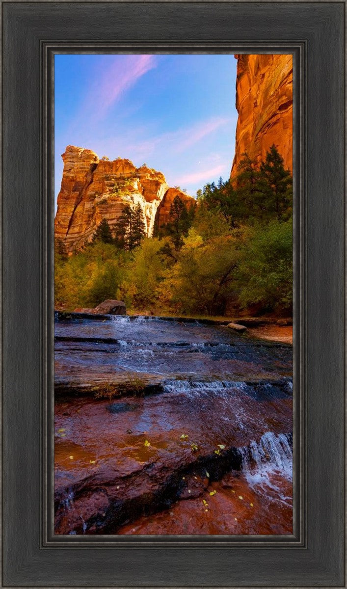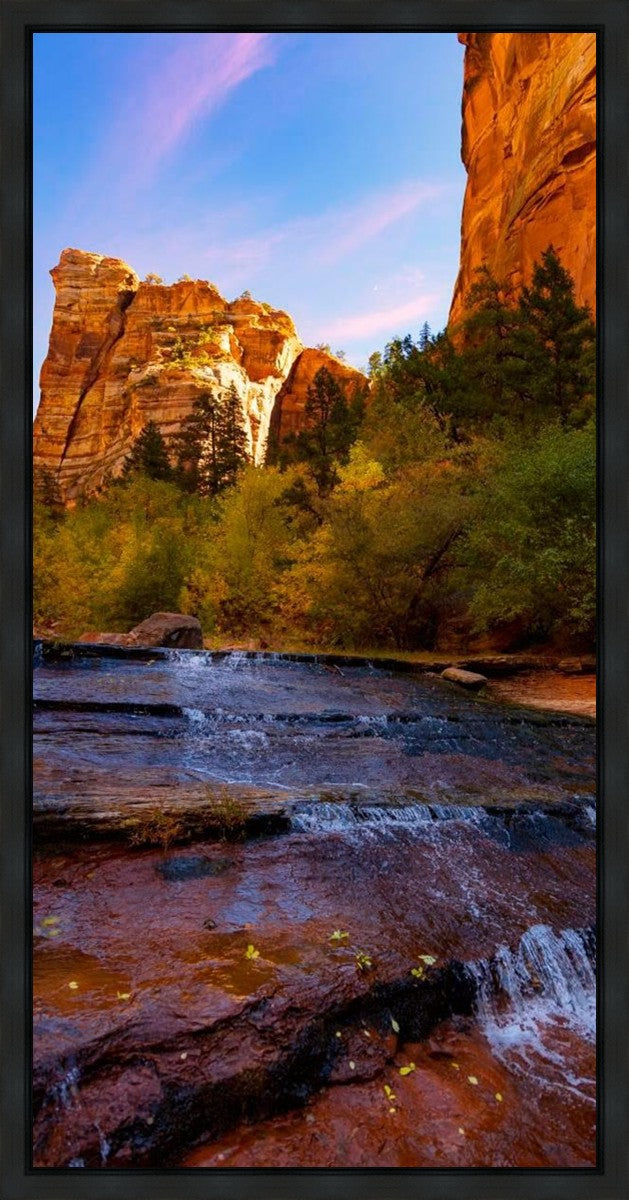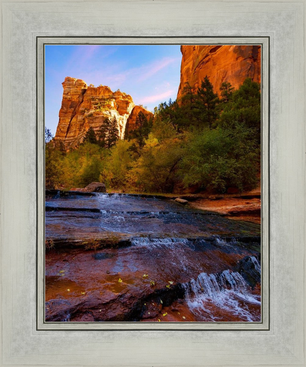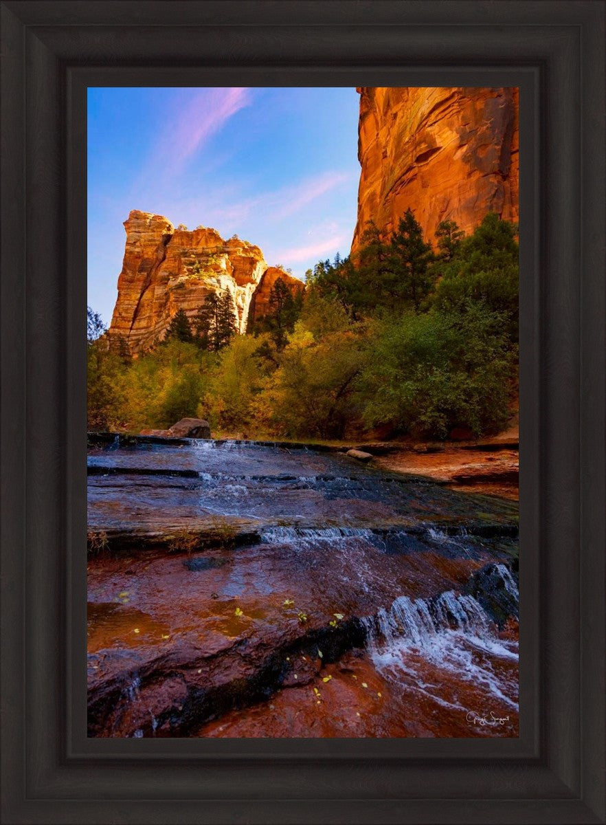 In the shadows, out of the morning sun the light crests a top the nearby cliffs as the water slowly flows over the beautiful red shale.