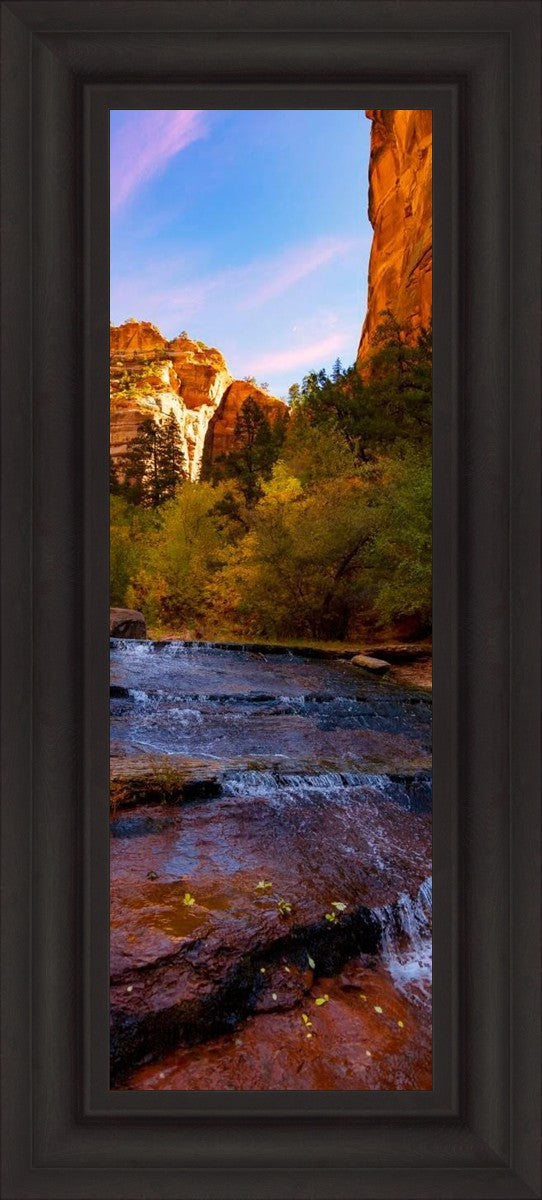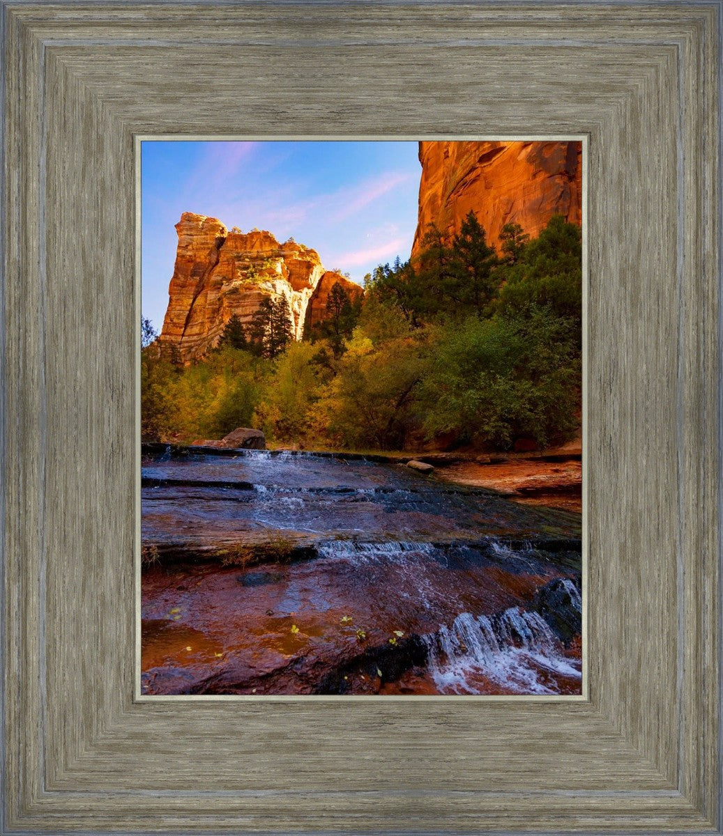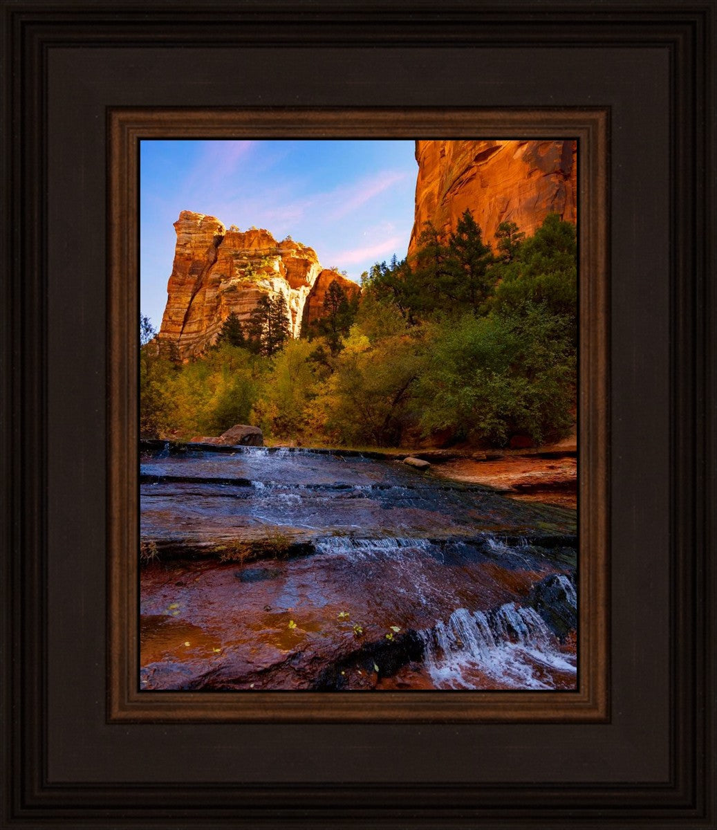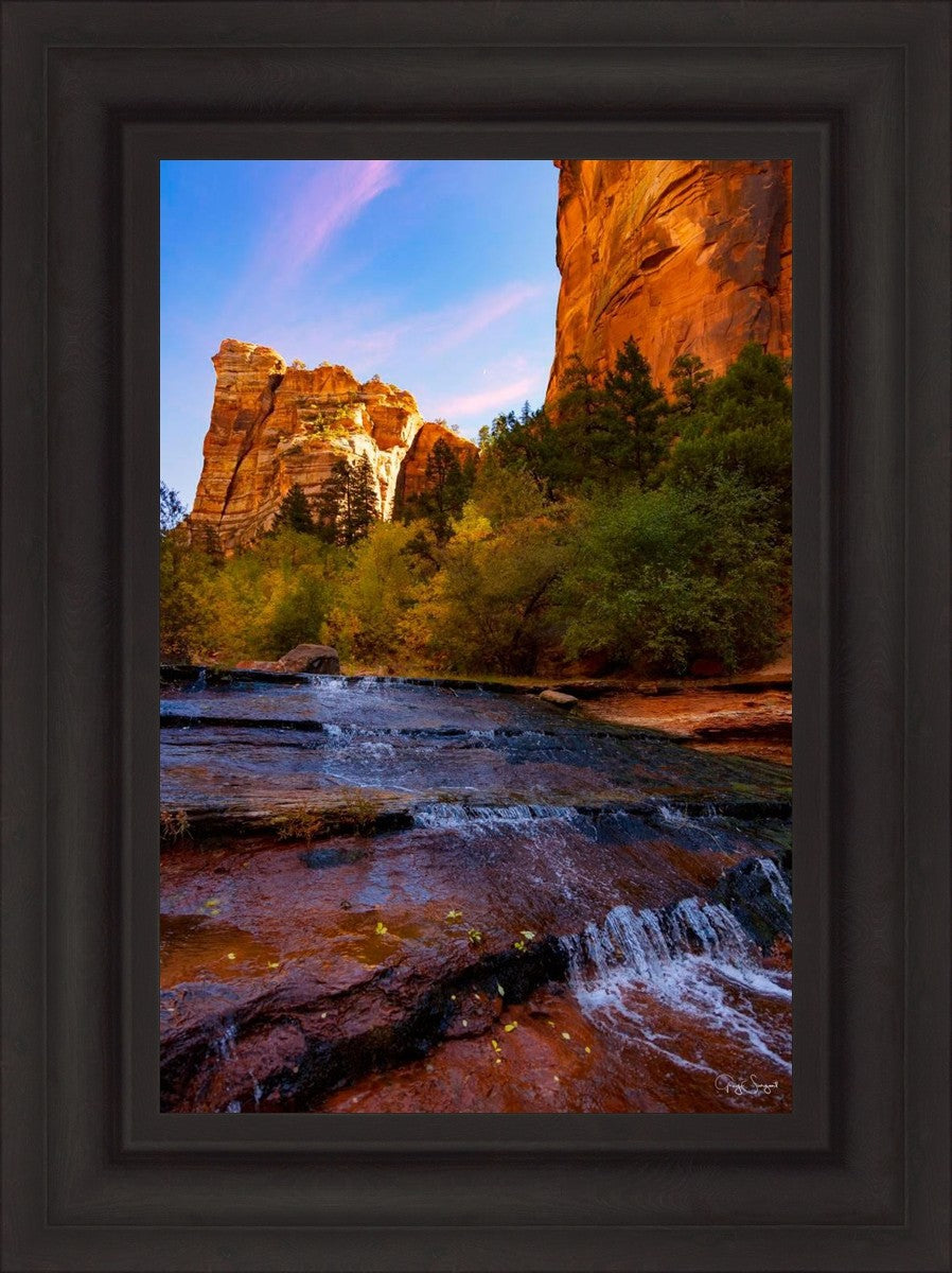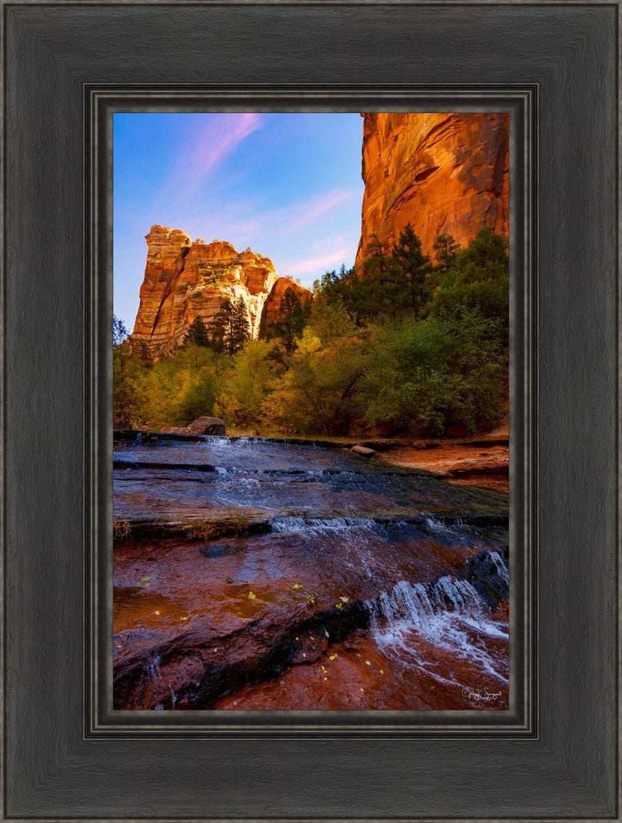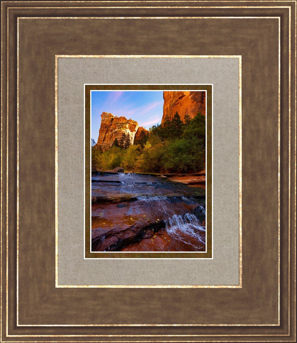 In the shadows, out of the morning sun the light crests a top the nearby cliffs as the water slowly flows over the beautiful red shale.