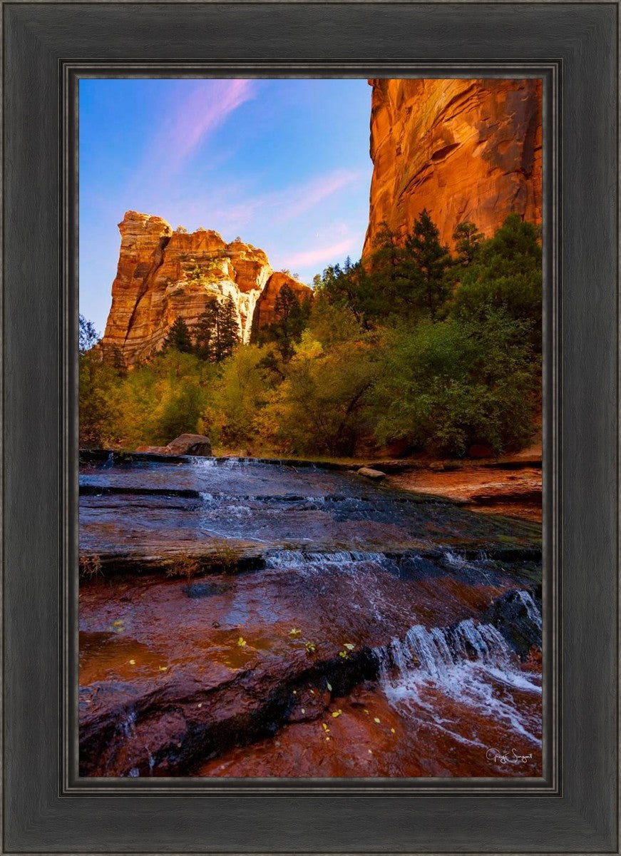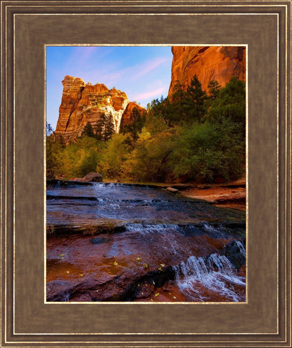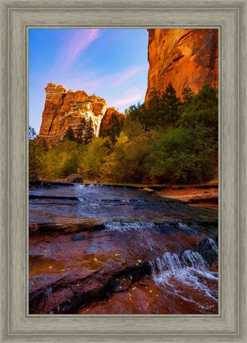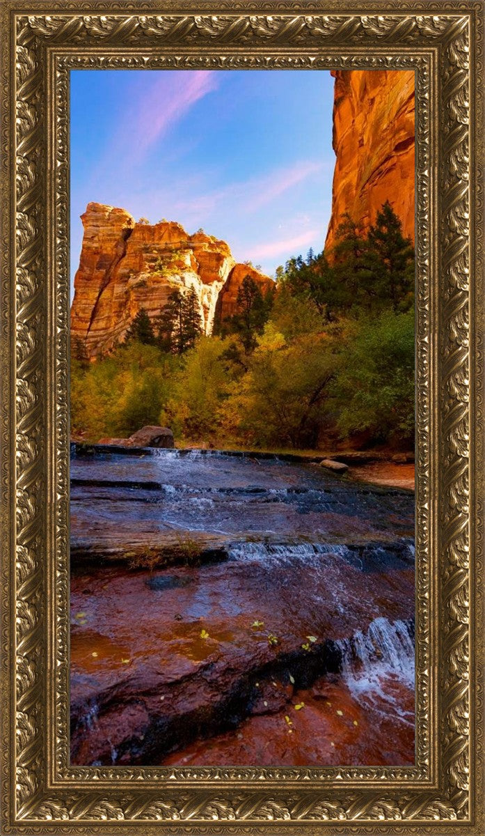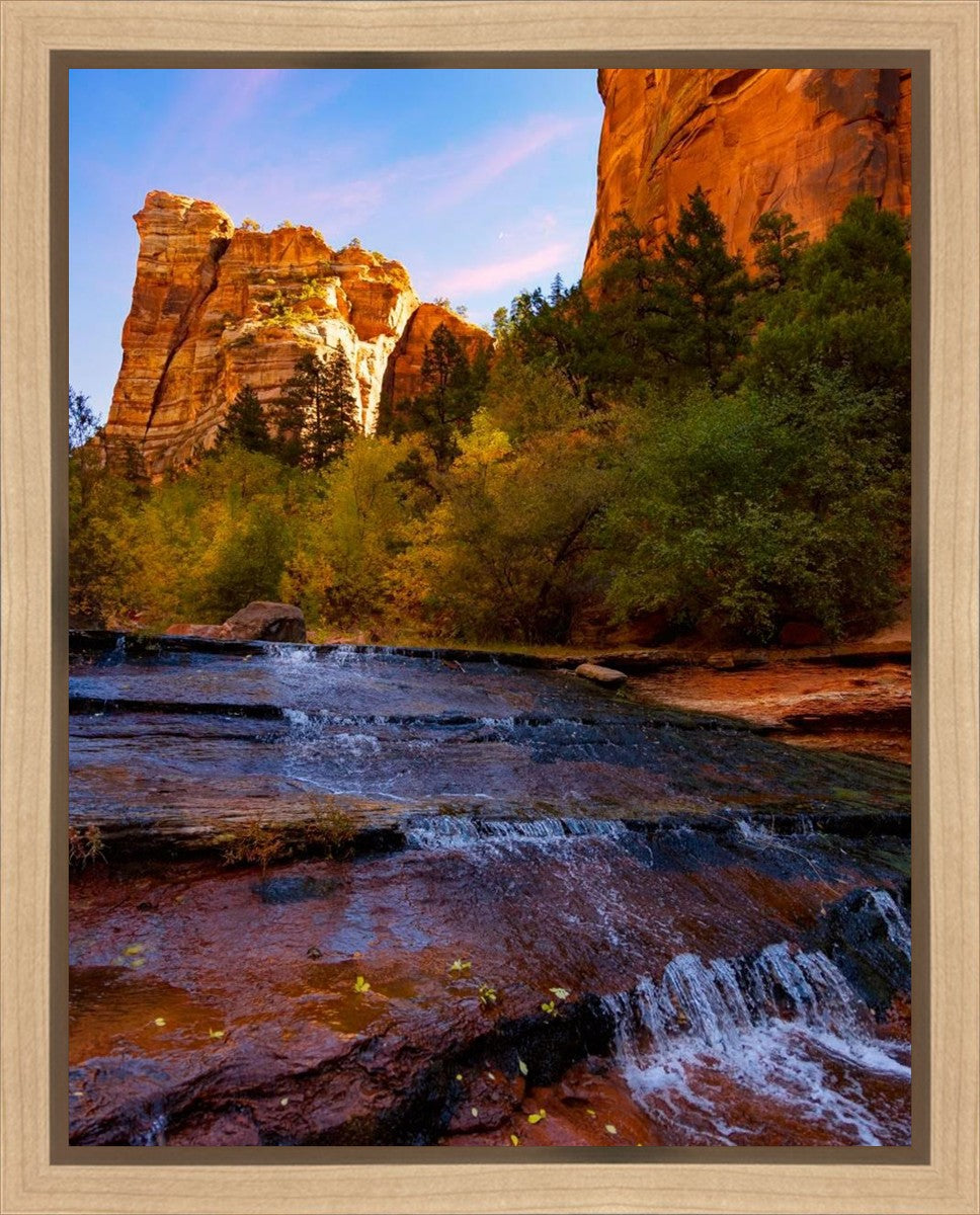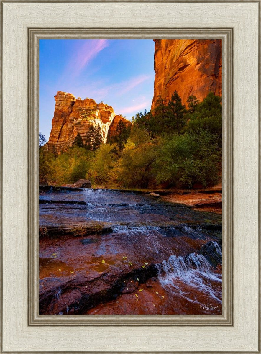 In the shadows, out of the morning sun the light crests a top the nearby cliffs as the water slowly flows over the beautiful red shale.
