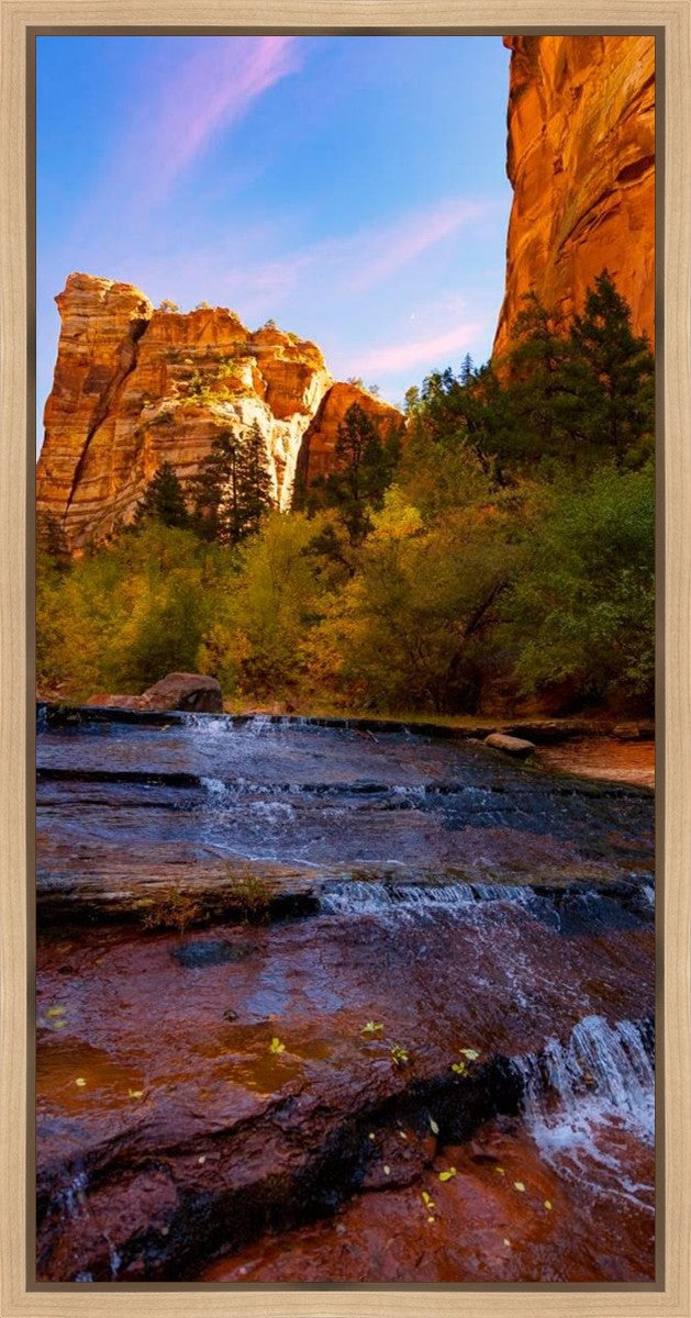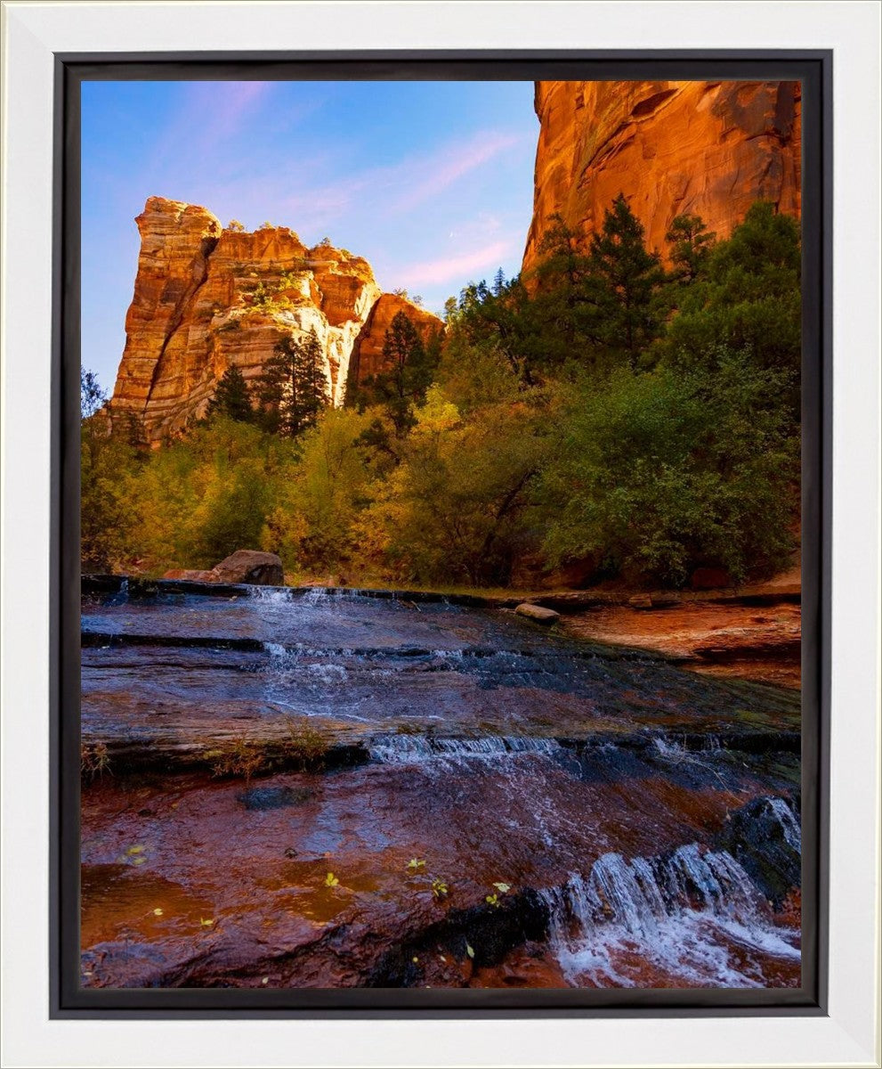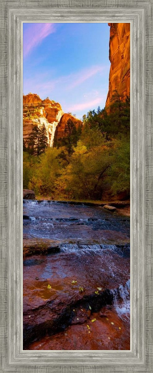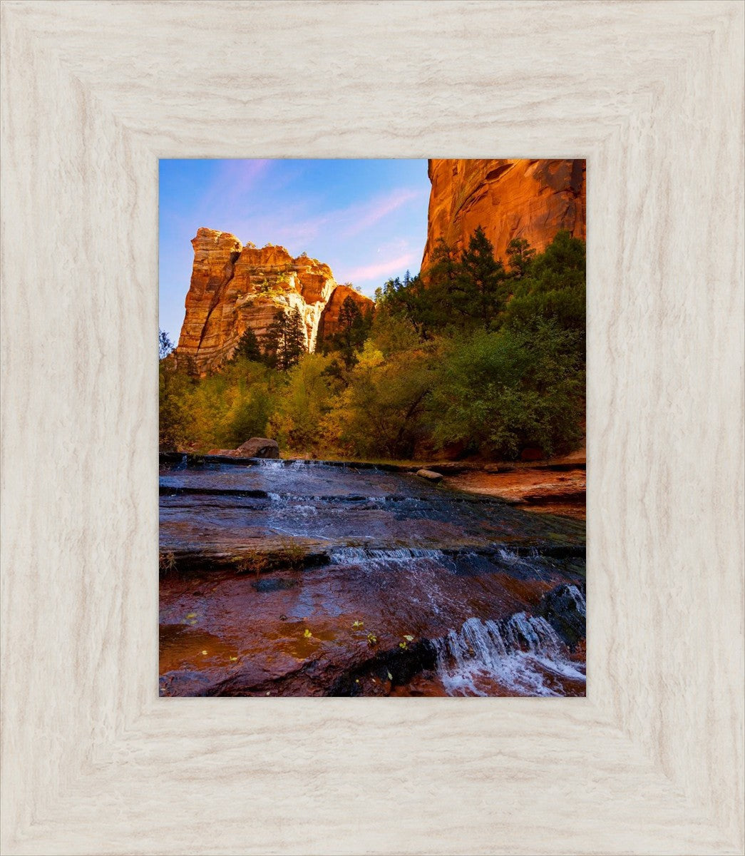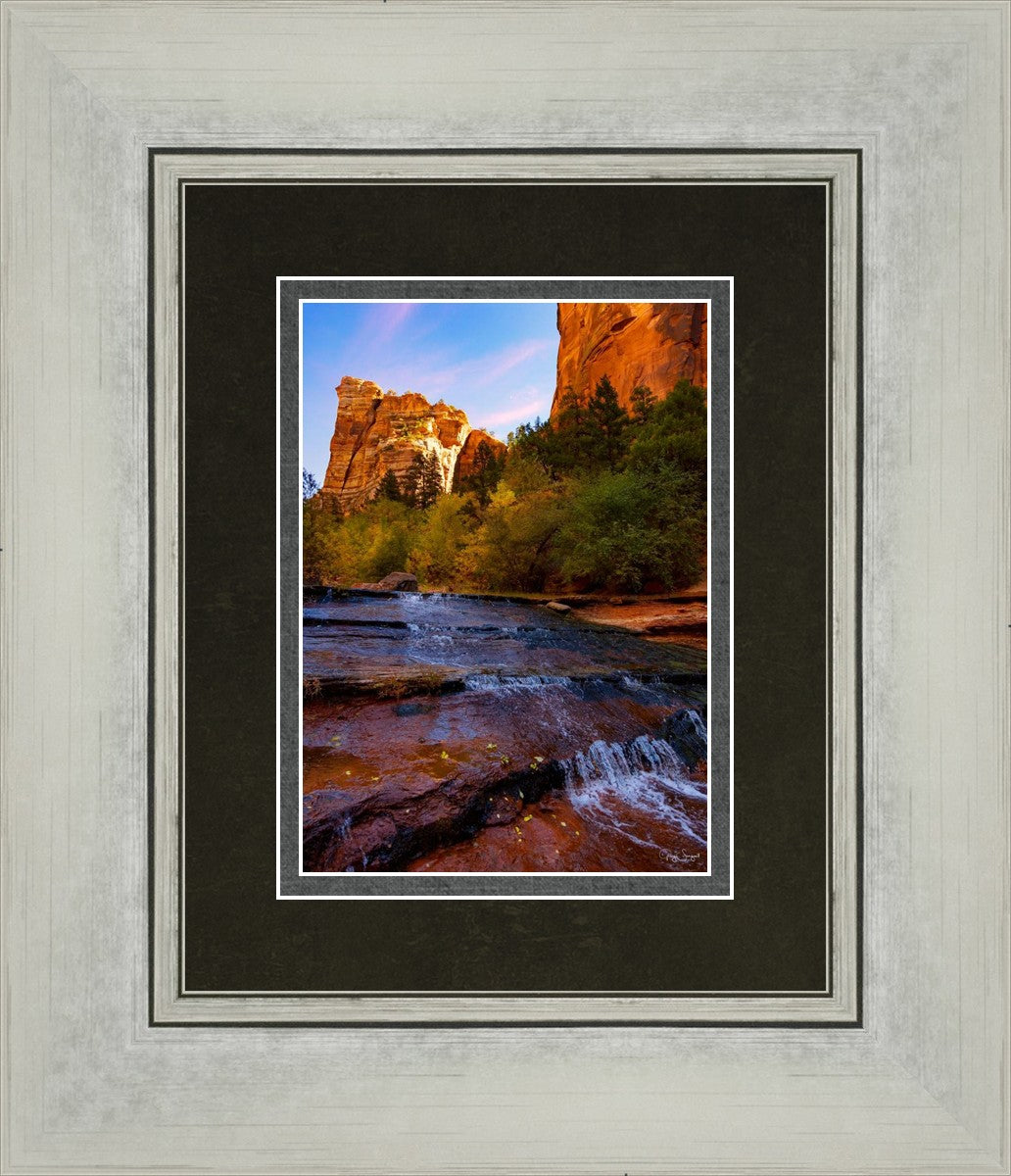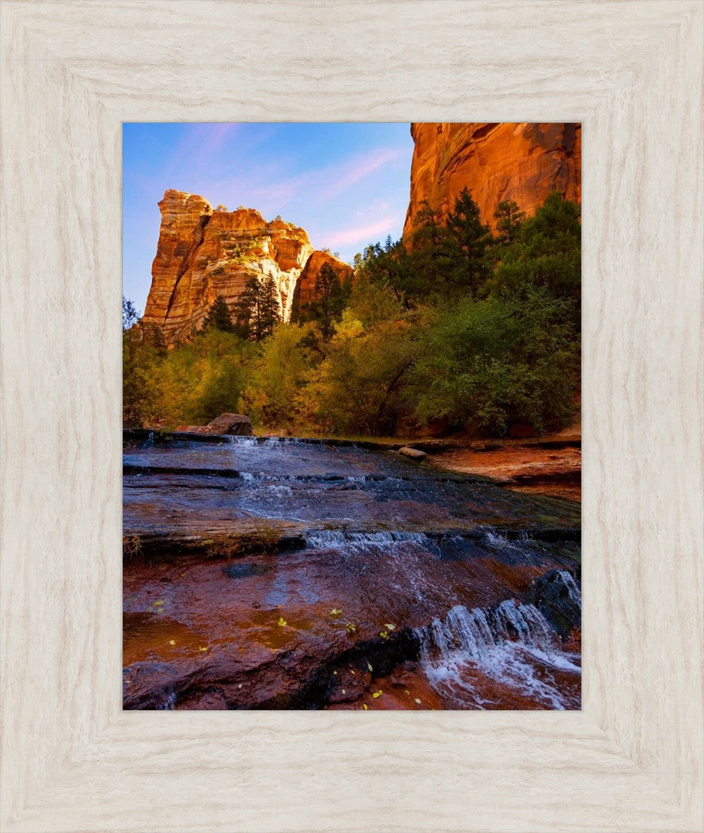 In the shadows, out of the morning sun the light crests a top the nearby cliffs as the water slowly flows over the beautiful red shale.