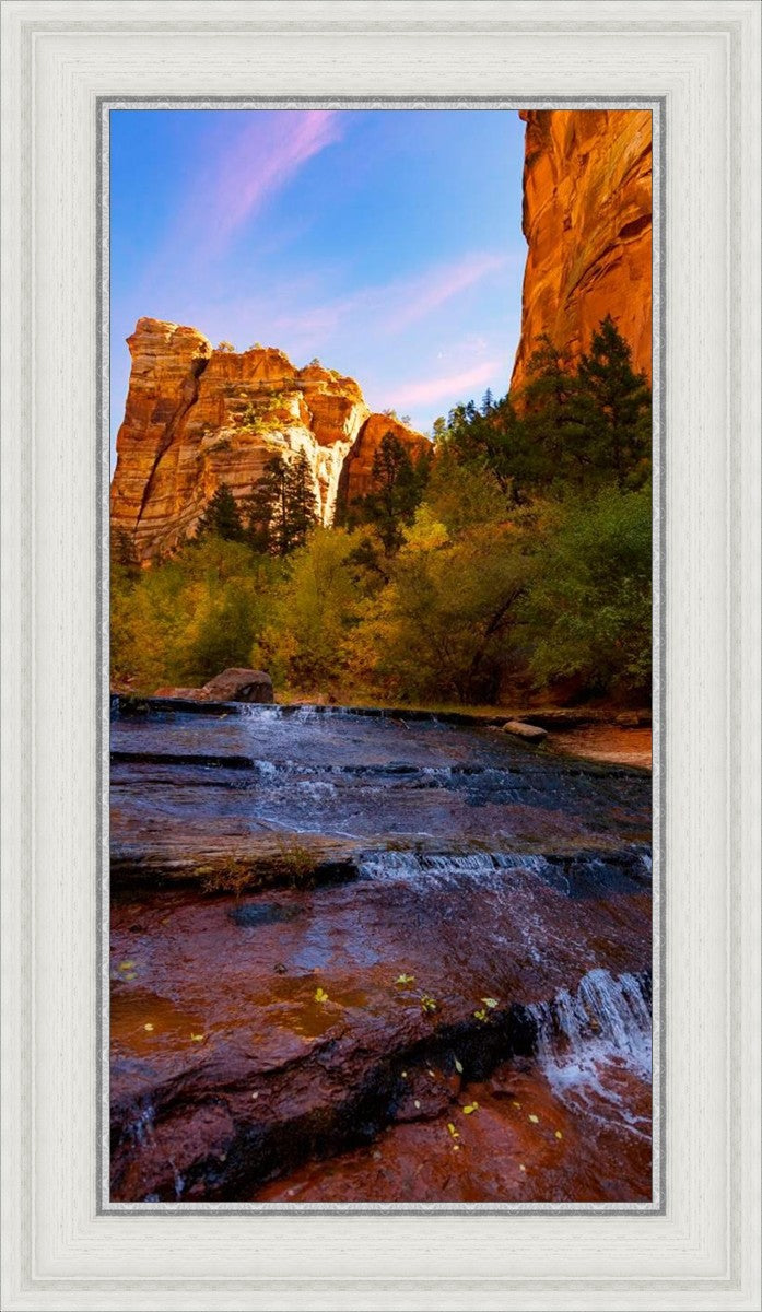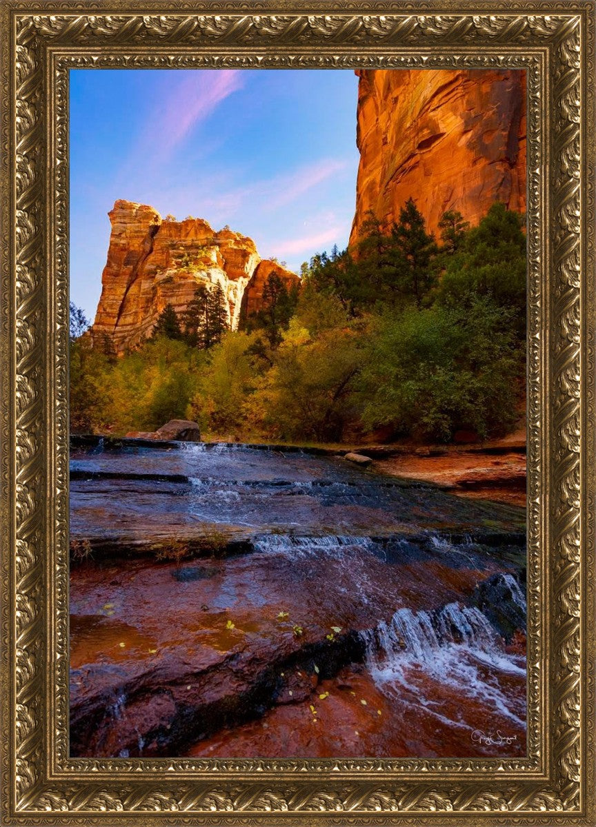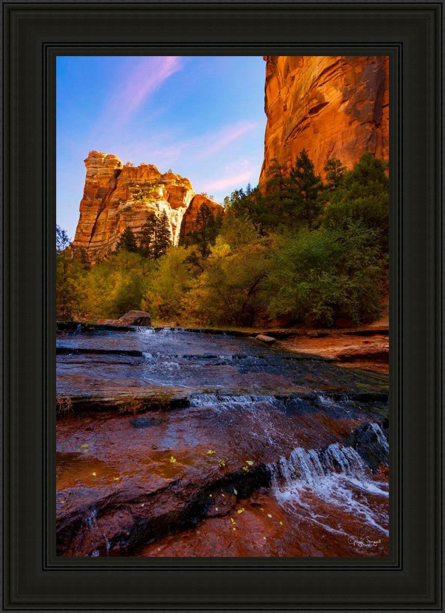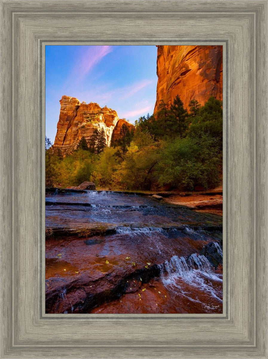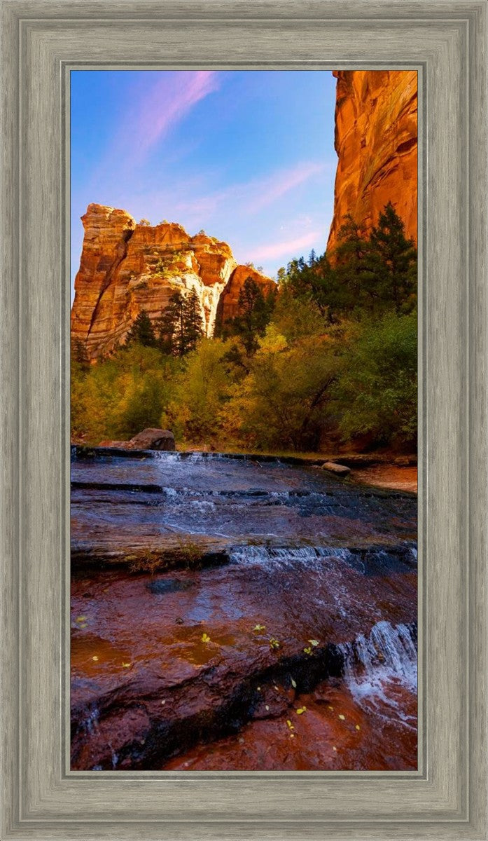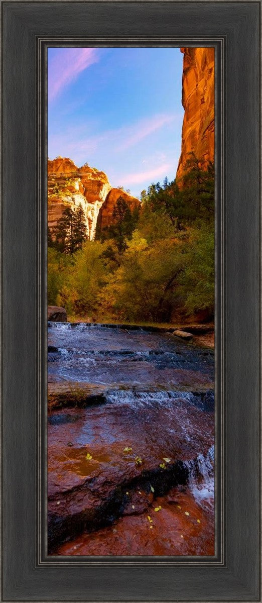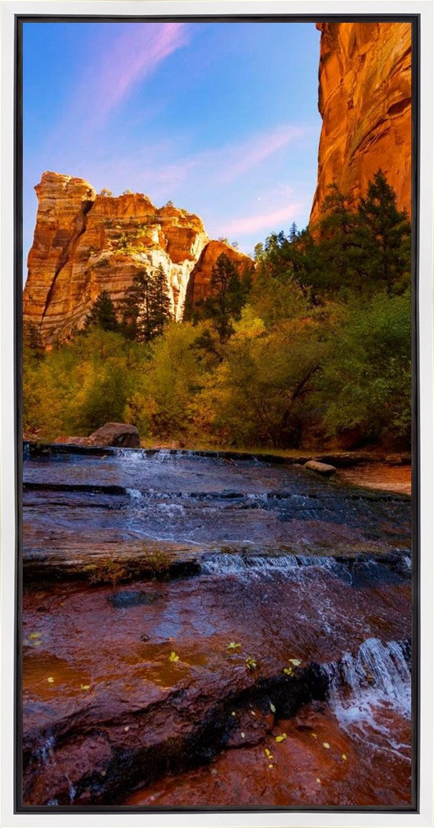 In the shadows, out of the morning sun the light crests a top the nearby cliffs as the water slowly flows over the beautiful red shale.
