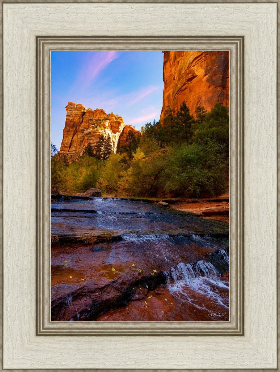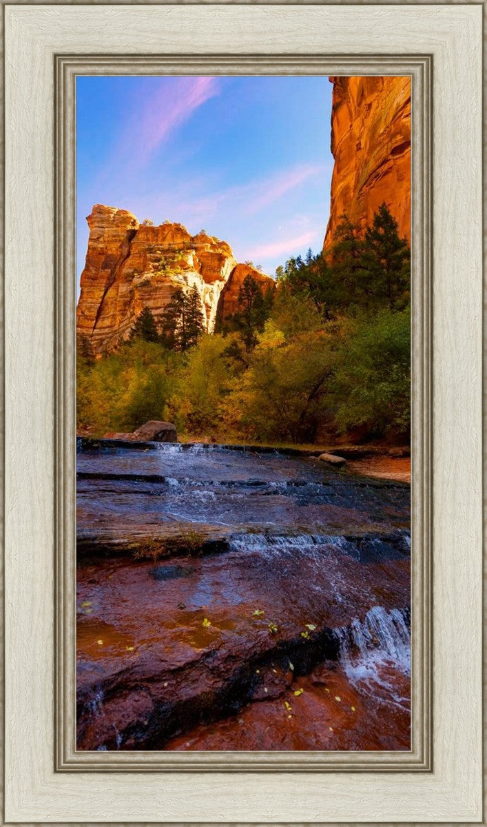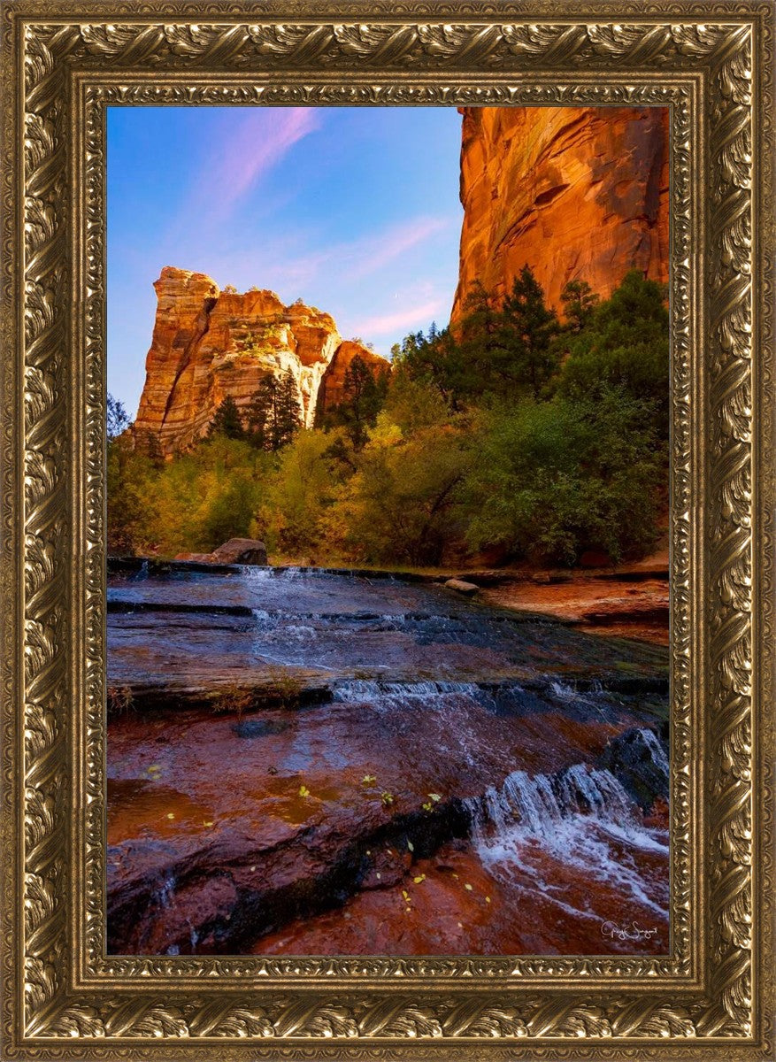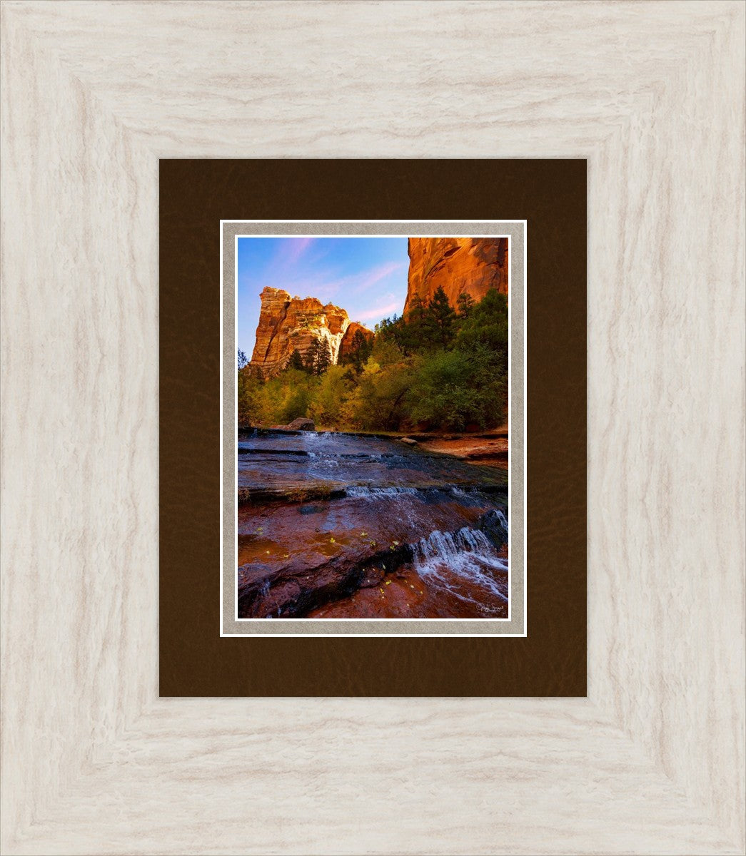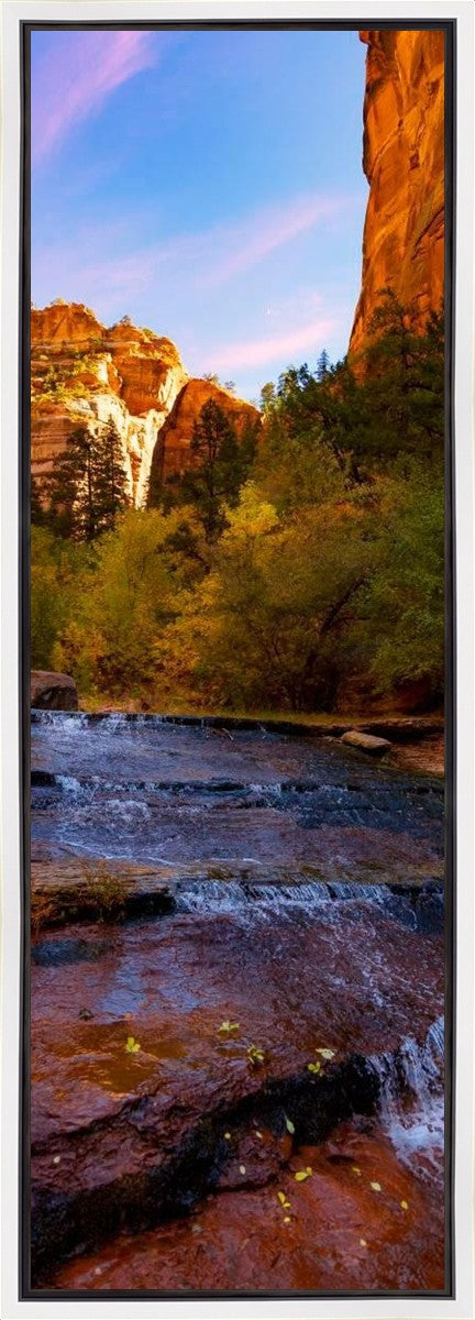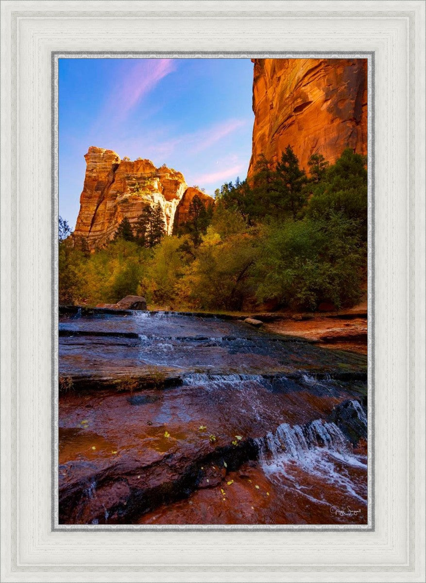 In the shadows, out of the morning sun the light crests a top the nearby cliffs as the water slowly flows over the beautiful red shale.