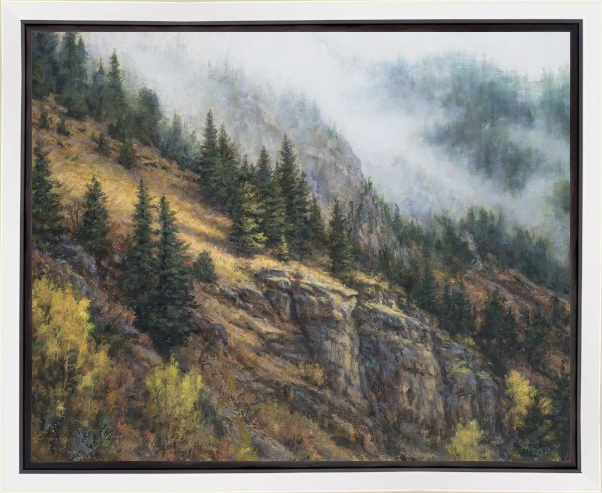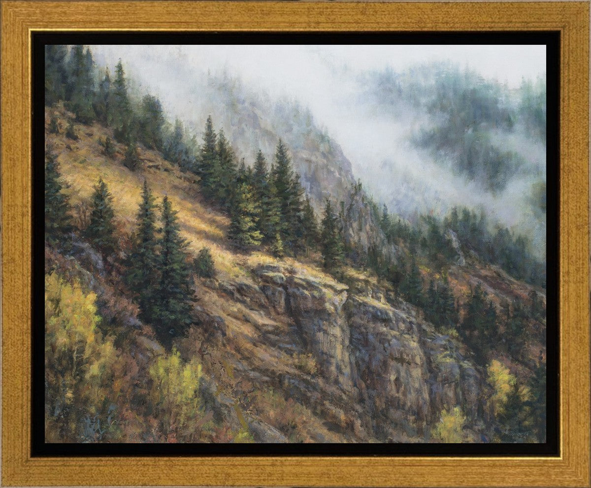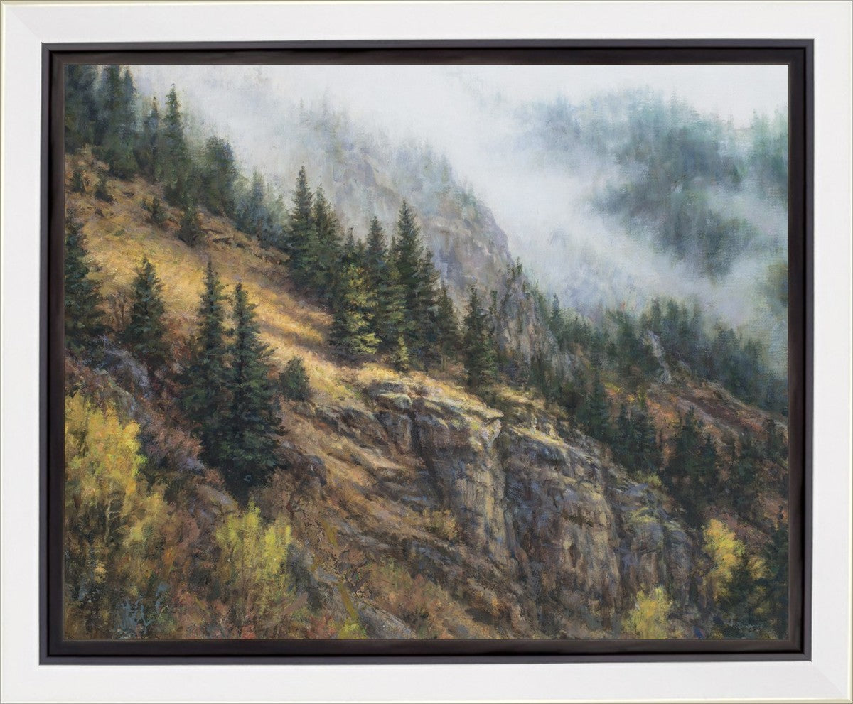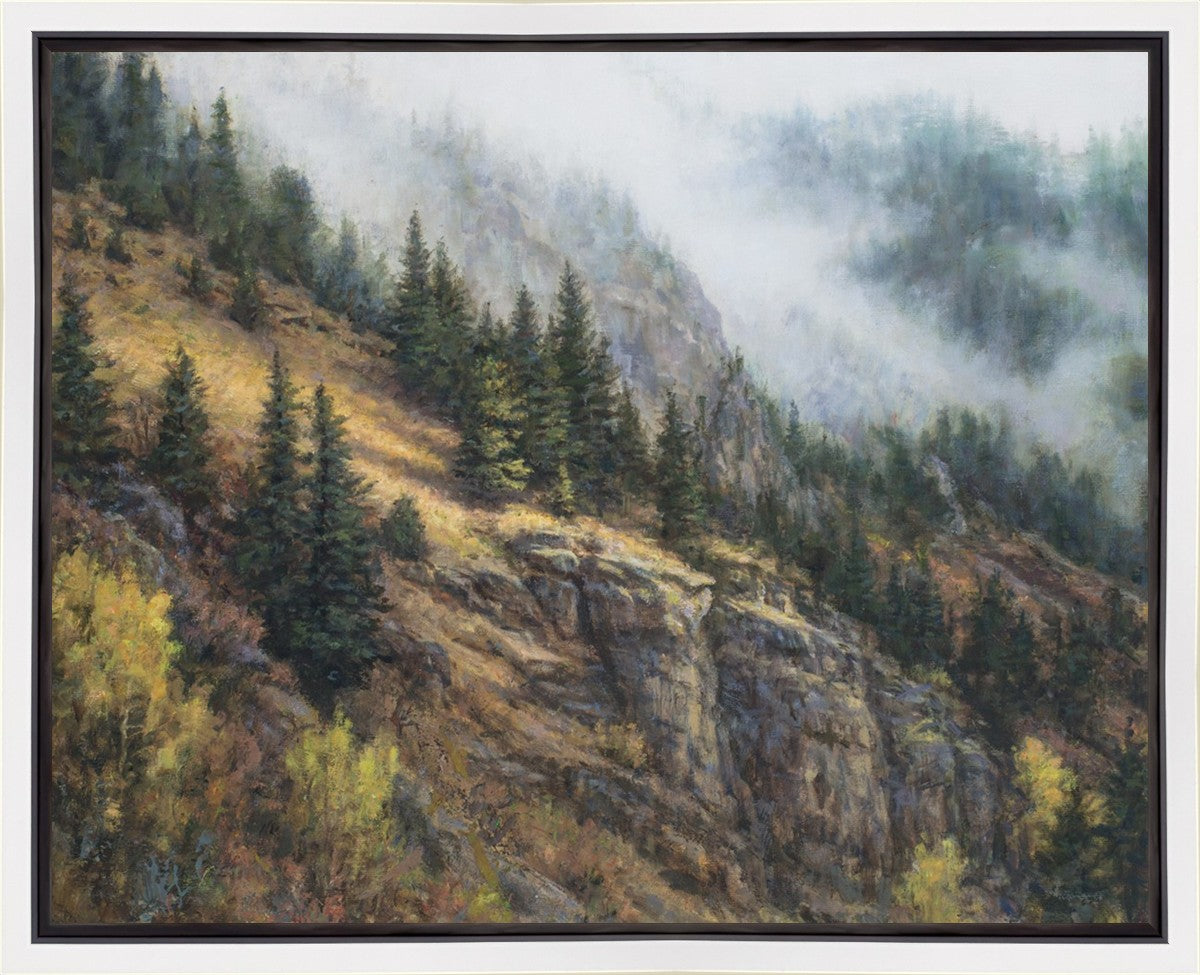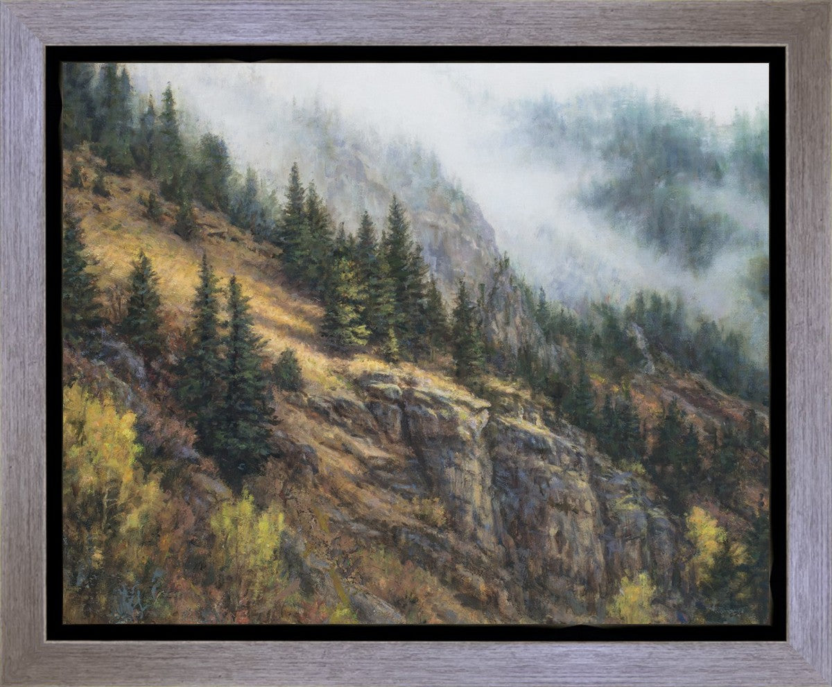 The reference for this painting came while I was taking a group of BYUI painting class students to visit Jackson Wyoming. The snow was too deep to go over the normal Jackson Pass route so we used the longer way through Palisades and the South Fork of the Snake River canyon. We stopped at a roadside turn out to take photos of some mountain goats. They were so high up that they appeared as just white dots. It started as a demo in class; totally fogged in as the photos, but latter in the studio I decided to open up the clouds and add a little spot of sunlight.