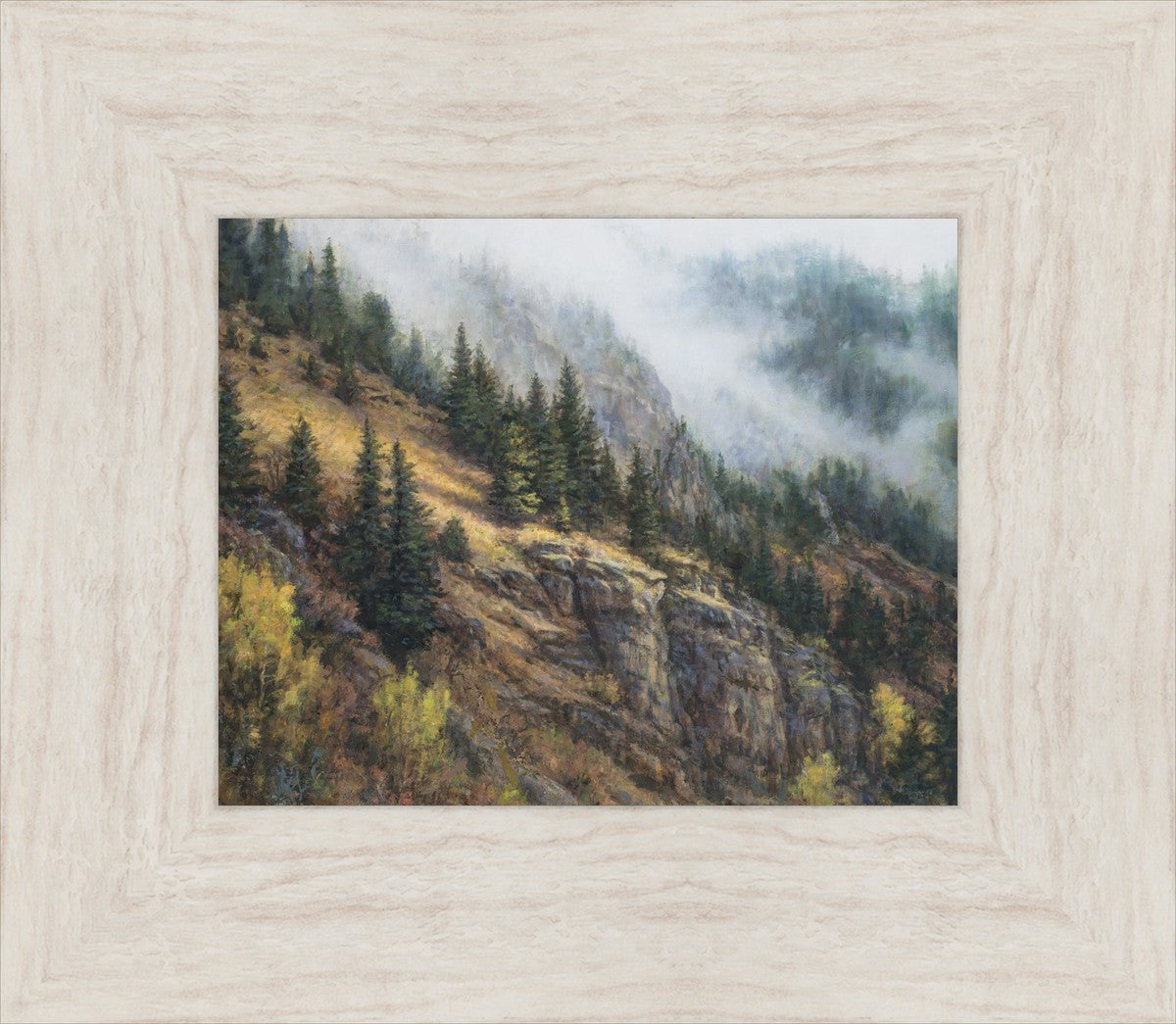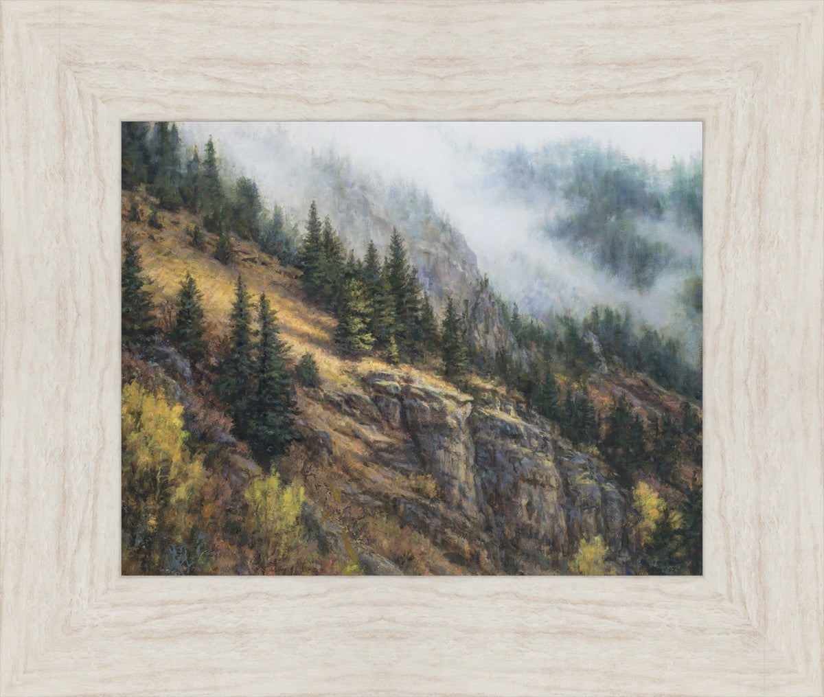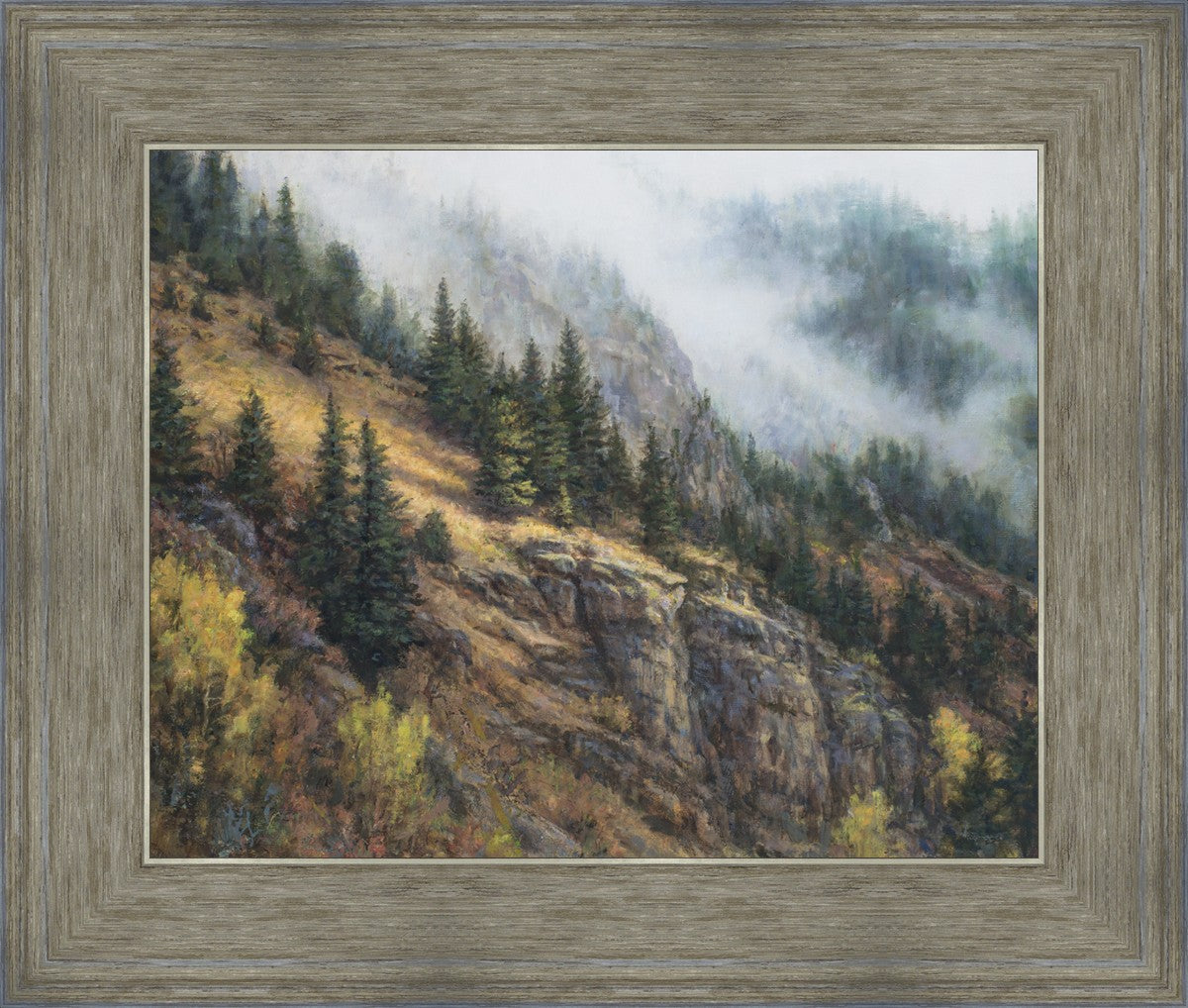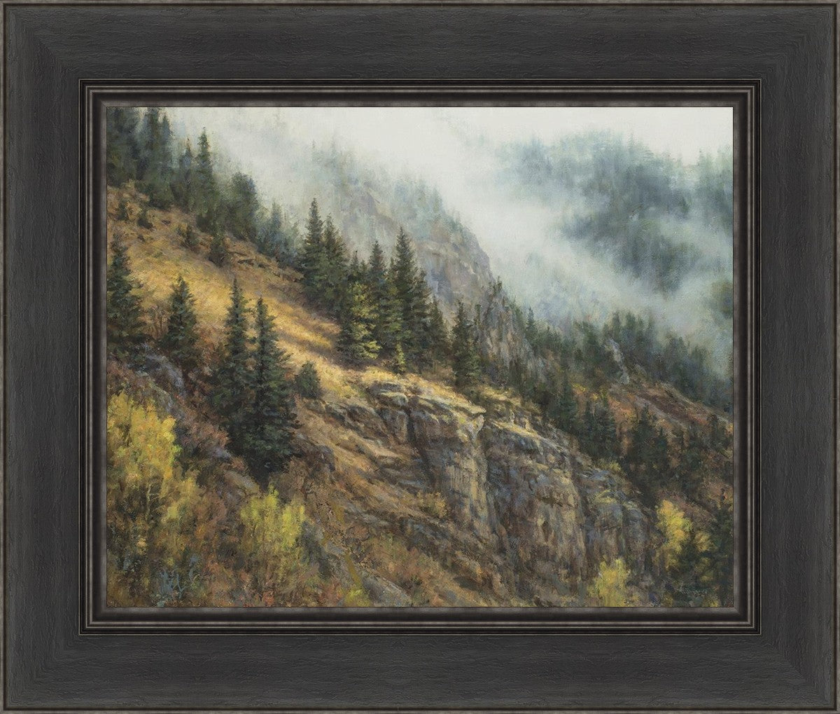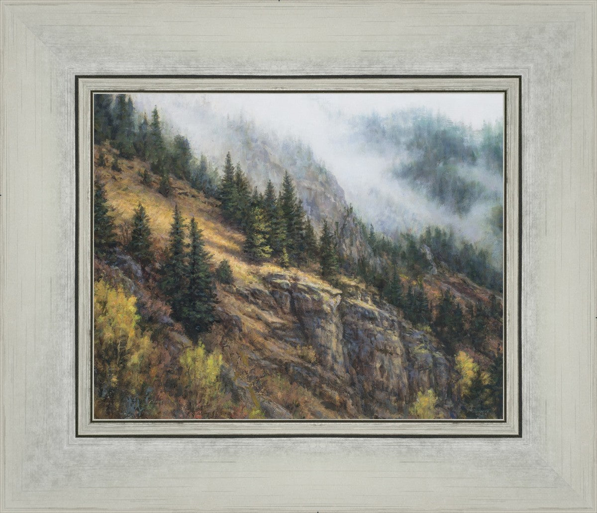 The reference for this painting came while I was taking a group of BYUI painting class students to visit Jackson Wyoming. The snow was too deep to go over the normal Jackson Pass route so we used the longer way through Palisades and the South Fork of the Snake River canyon. We stopped at a roadside turn out to take photos of some mountain goats. They were so high up that they appeared as just white dots. It started as a demo in class; totally fogged in as the photos, but latter in the studio I decided to open up the clouds and add a little spot of sunlight.