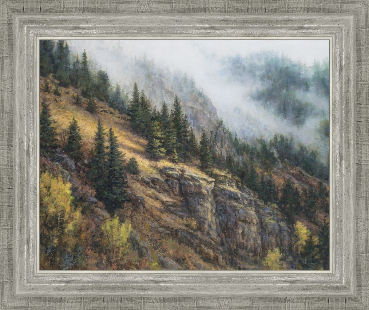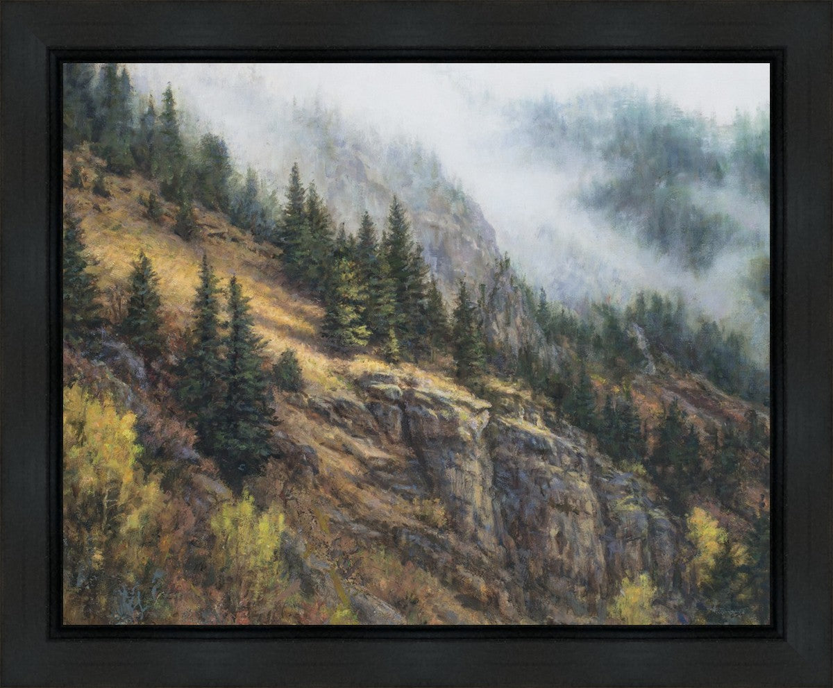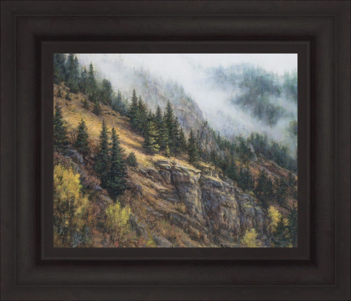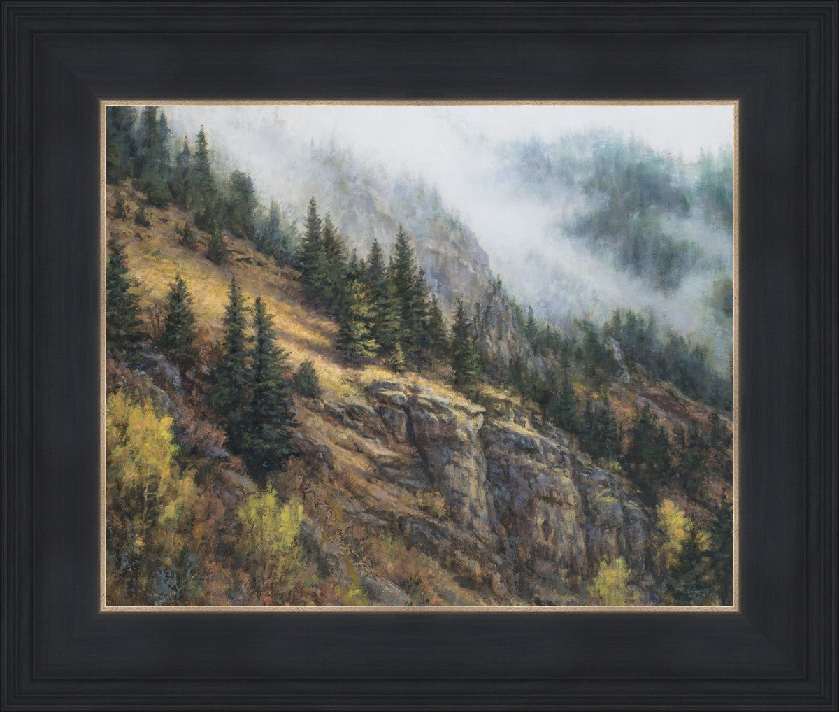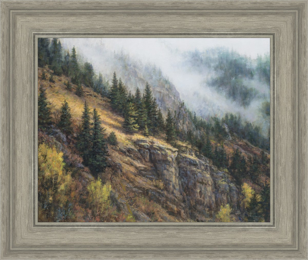 The reference for this painting came while I was taking a group of BYUI painting class students to visit Jackson Wyoming. The snow was too deep to go over the normal Jackson Pass route so we used the longer way through Palisades and the South Fork of the Snake River canyon. We stopped at a roadside turn out to take photos of some mountain goats. They were so high up that they appeared as just white dots. It started as a demo in class; totally fogged in as the photos, but latter in the studio I decided to open up the clouds and add a little spot of sunlight.