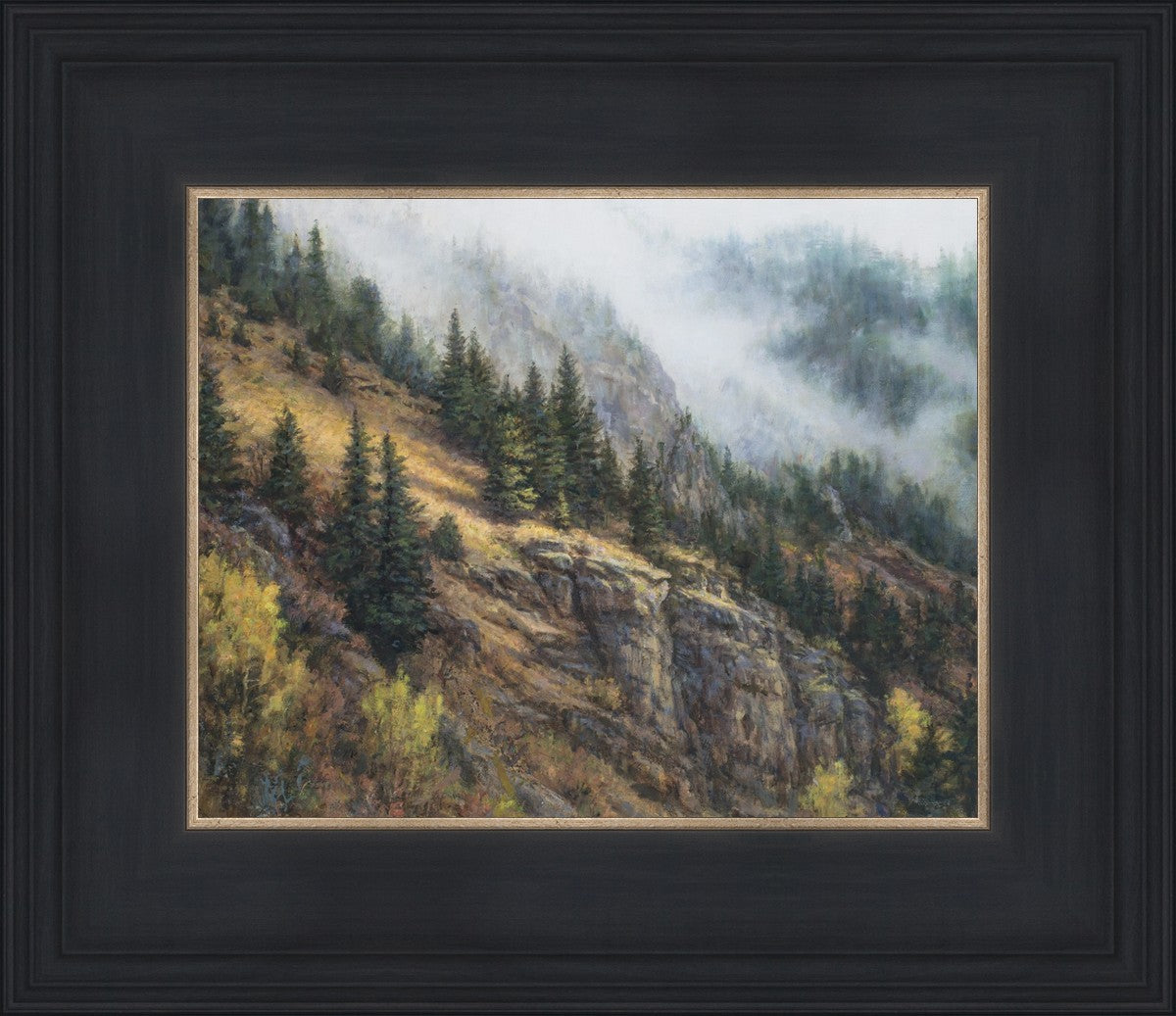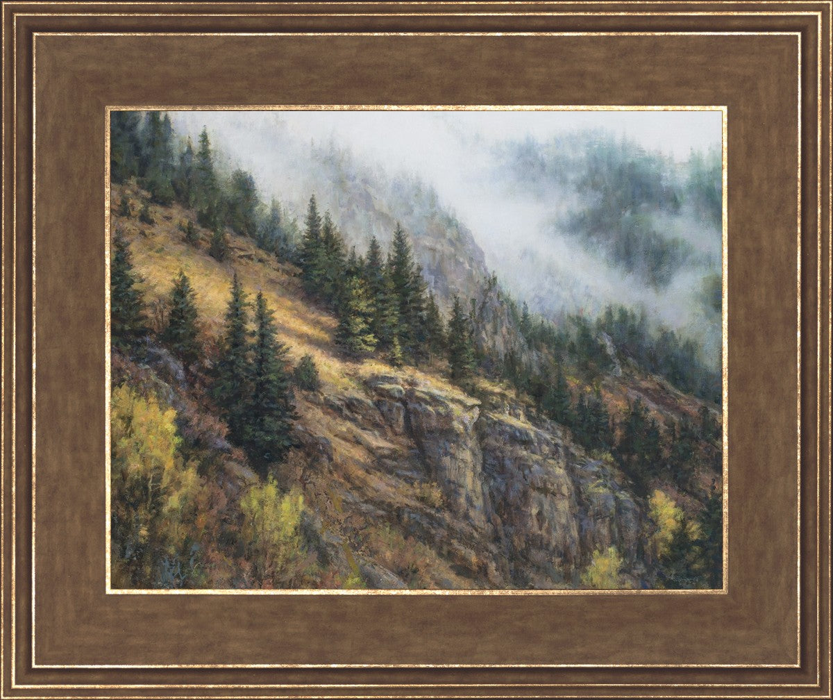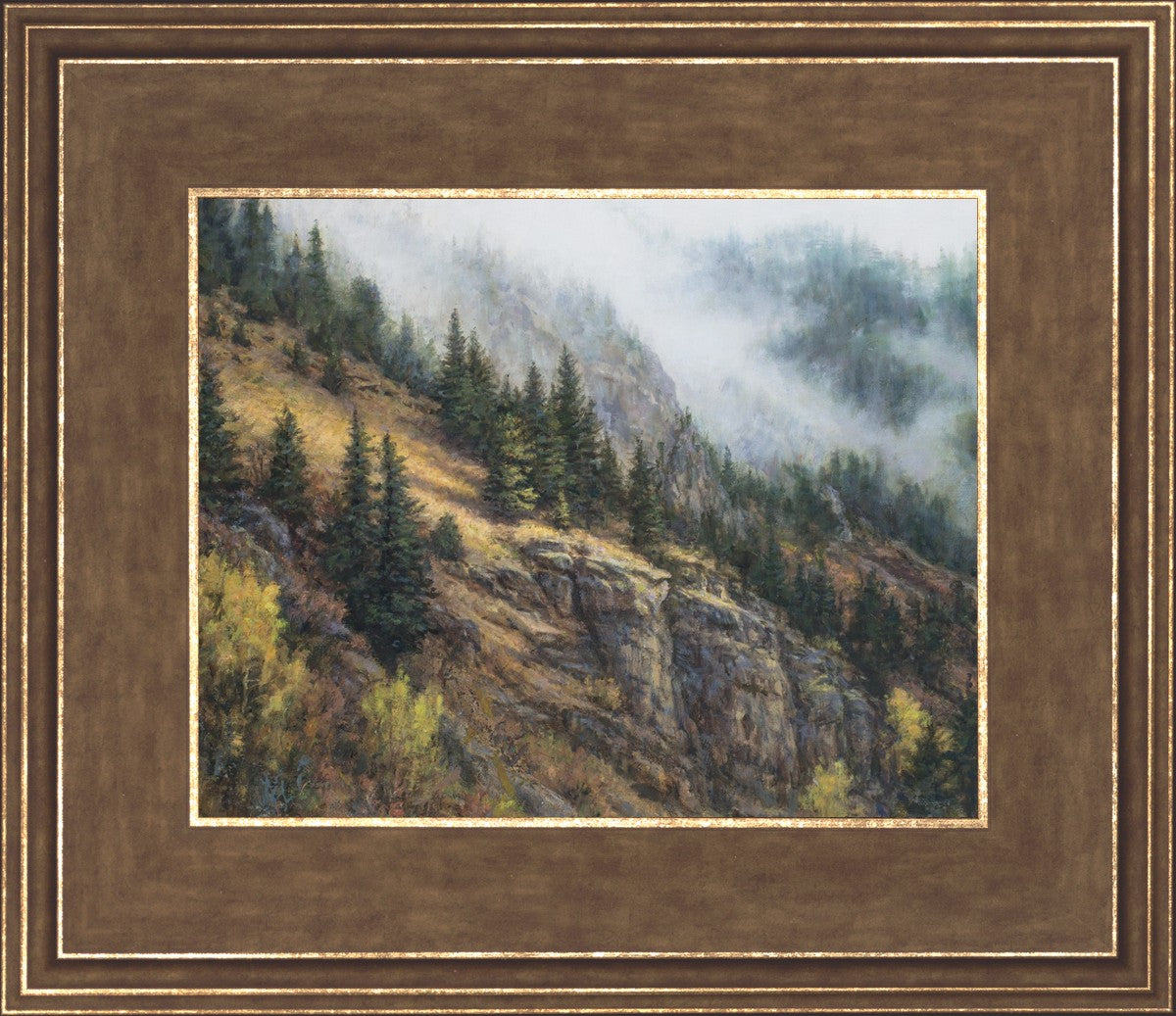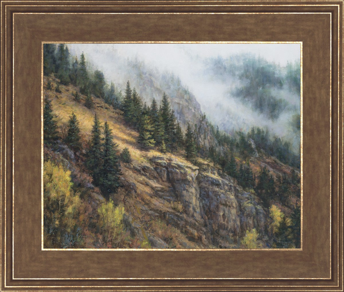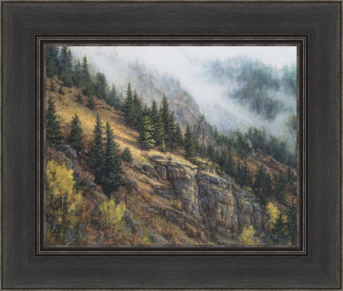 The reference for this painting came while I was taking a group of BYUI painting class students to visit Jackson Wyoming. The snow was too deep to go over the normal Jackson Pass route so we used the longer way through Palisades and the South Fork of the Snake River canyon. We stopped at a roadside turn out to take photos of some mountain goats. They were so high up that they appeared as just white dots. It started as a demo in class; totally fogged in as the photos, but latter in the studio I decided to open up the clouds and add a little spot of sunlight.