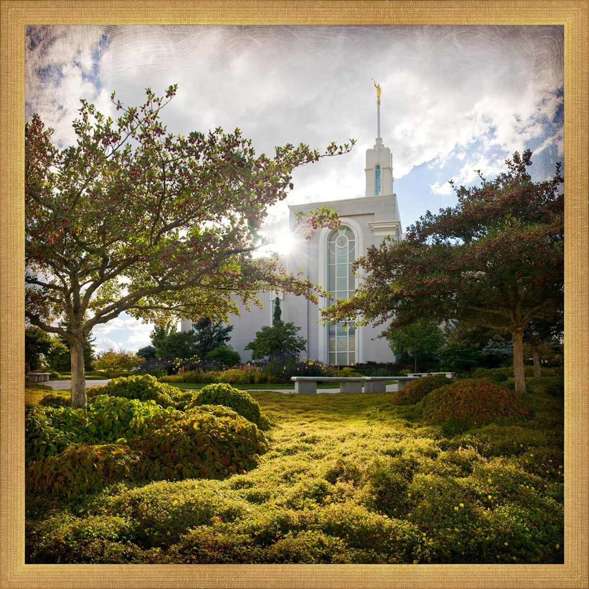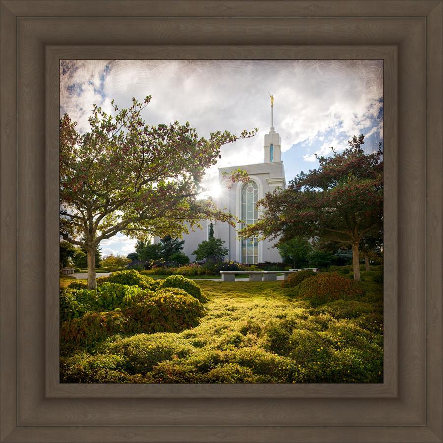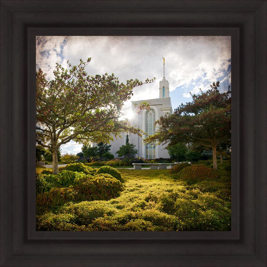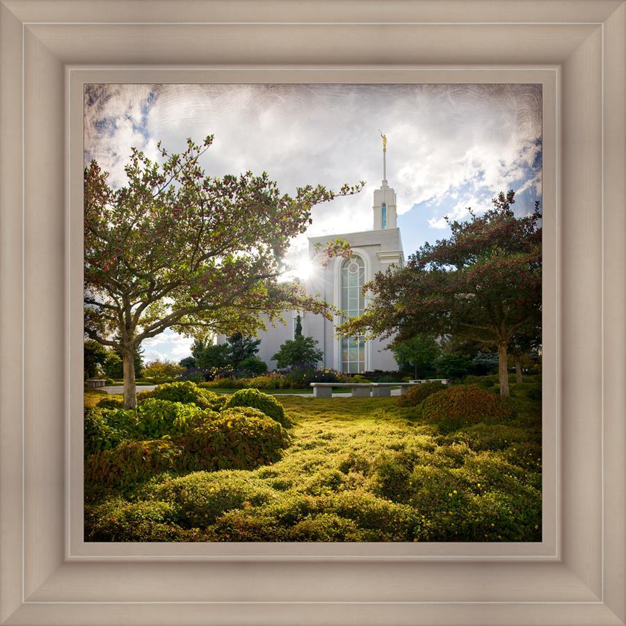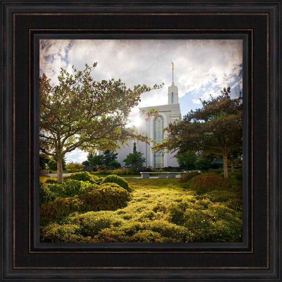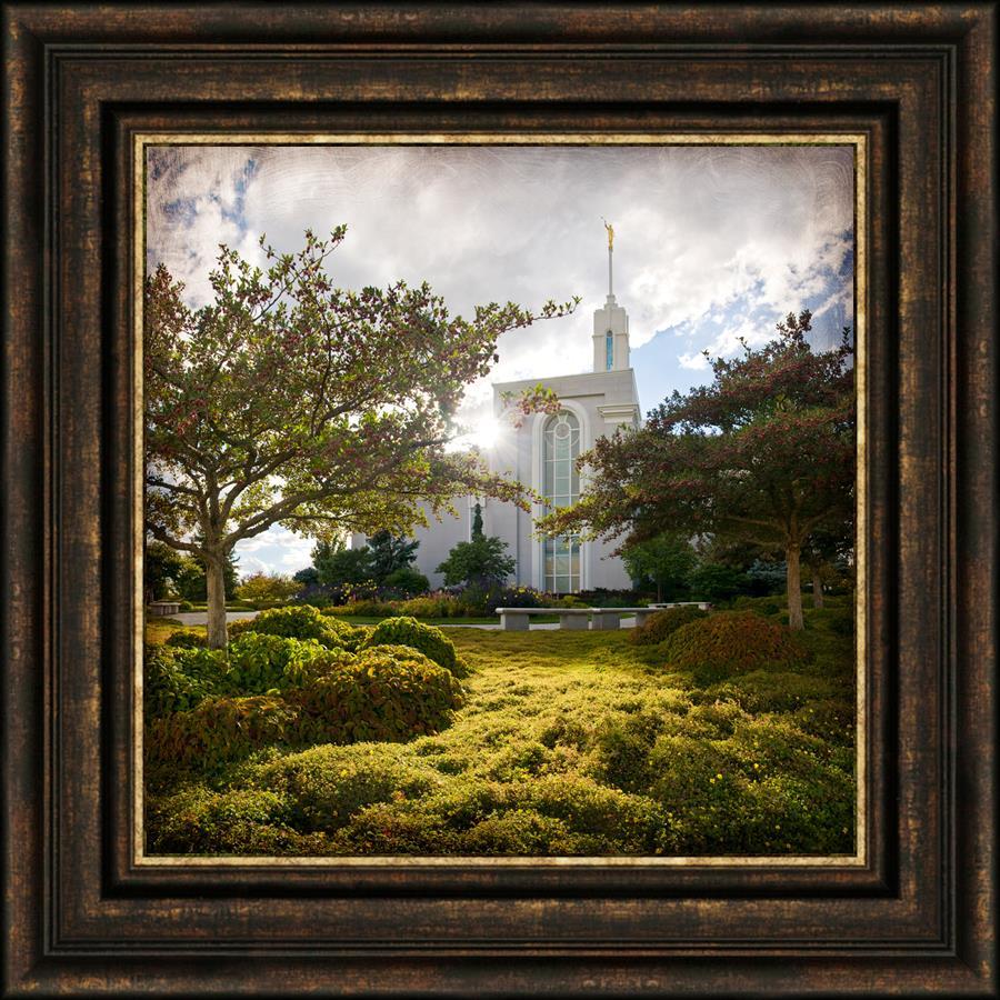 Since 1999 Landon has worked as an artisan in nearly 40 temples doing the decorative paint and gold leaf. He continues to do so as well as wood repair and graining. He was married in 2001 to Jacey Thomas in the Manti Utah temple. When she couldn’t find an image of the temple that she liked enough to purchase for their home, he decided to take one himself. That desire to create something original and different inspired his current series of temple art. They are taken from a panoramic viewpoint and stylized with an artistic border that reflect his paintings. All modern structures apart from the temple have been omitted.
