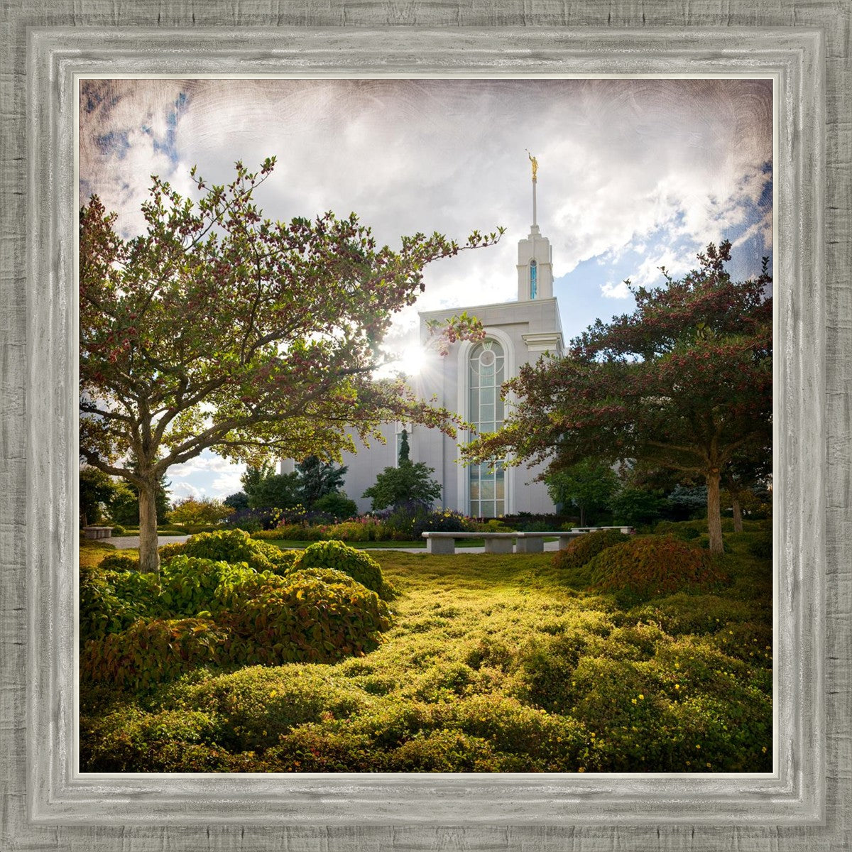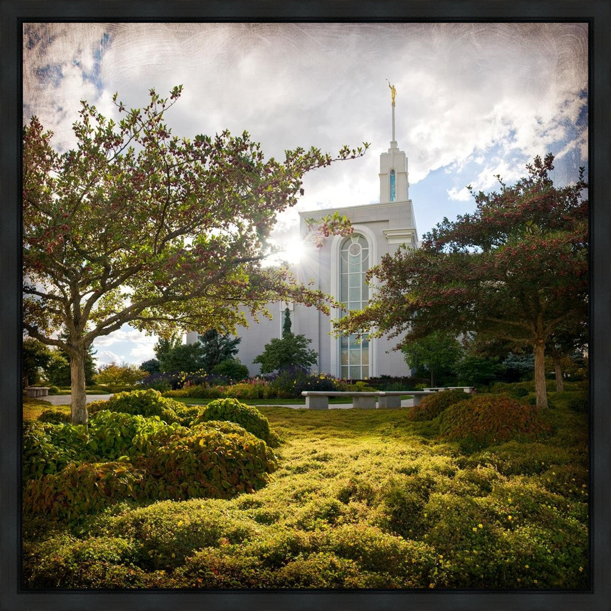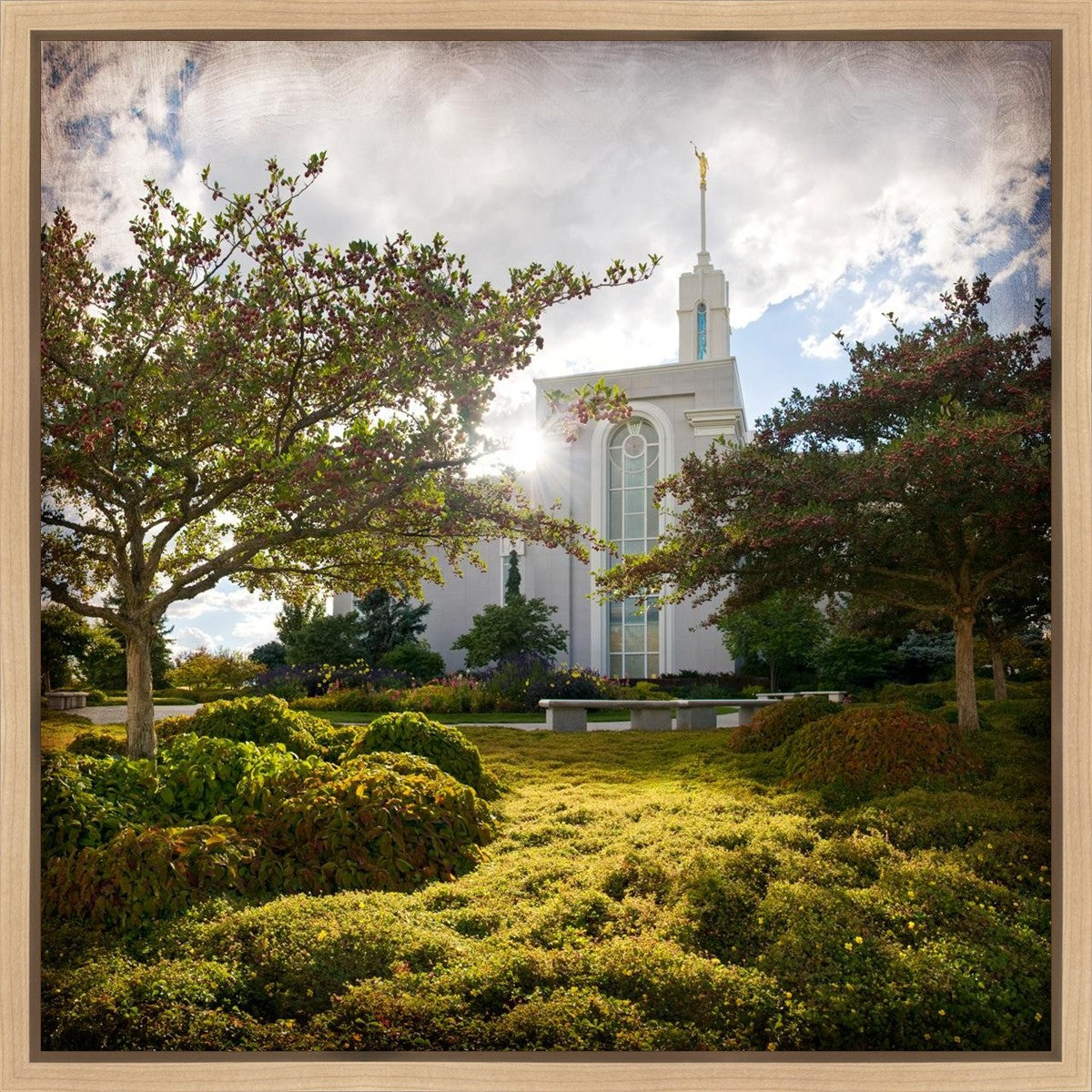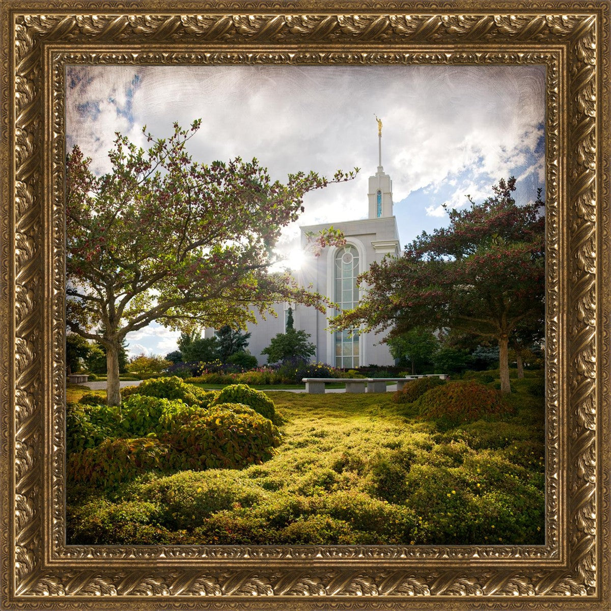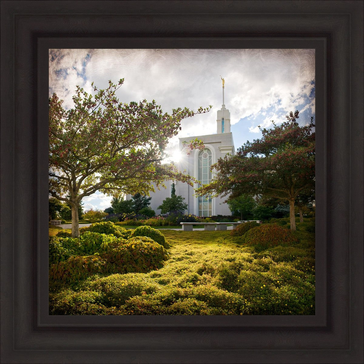 Since 1999 Landon has worked as an artisan in nearly 40 temples doing the decorative paint and gold leaf. He continues to do so as well as wood repair and graining. He was married in 2001 to Jacey Thomas in the Manti Utah temple. When she couldn’t find an image of the temple that she liked enough to purchase for their home, he decided to take one himself. That desire to create something original and different inspired his current series of temple art. They are taken from a panoramic viewpoint and stylized with an artistic border that reflect his paintings. All modern structures apart from the temple have been omitted.