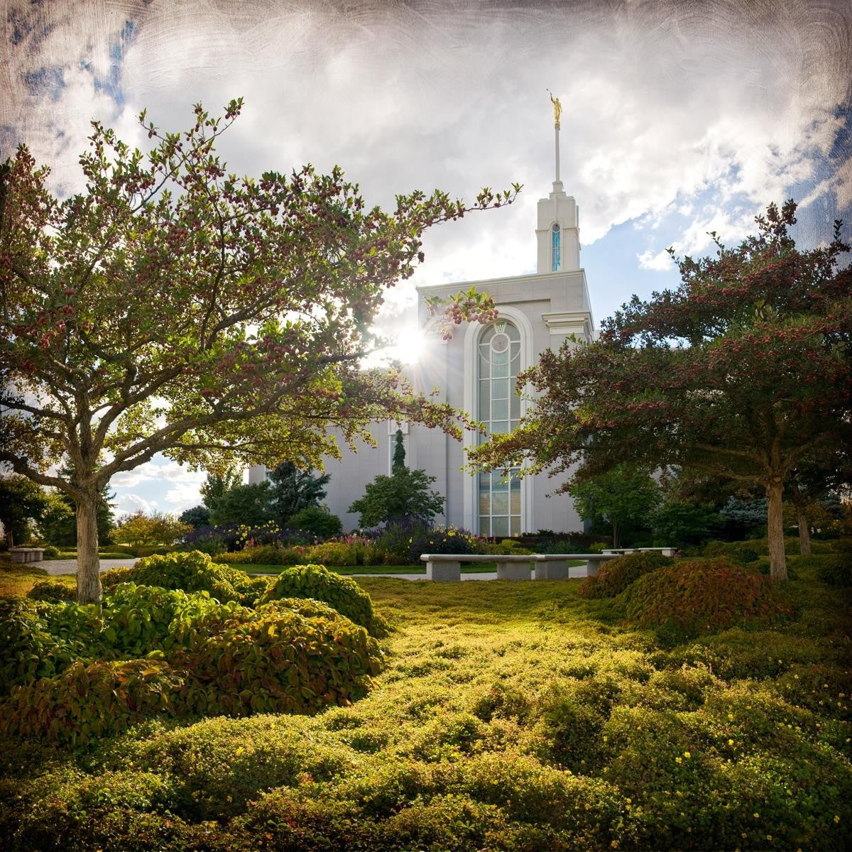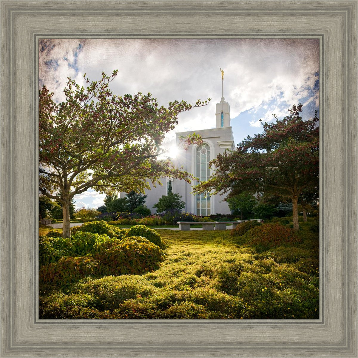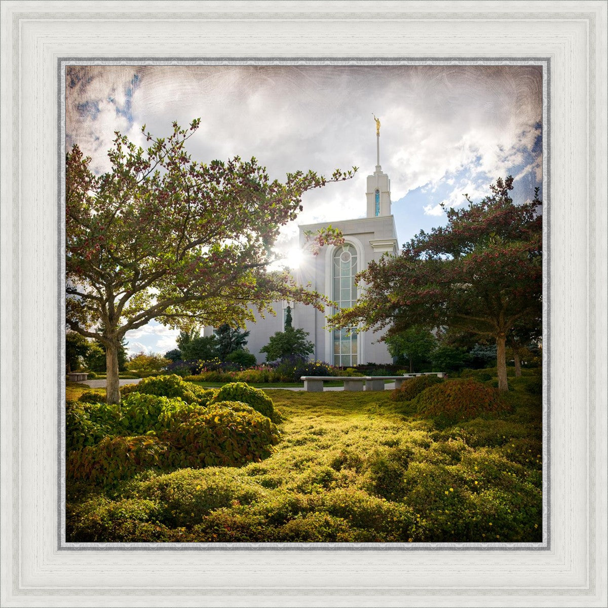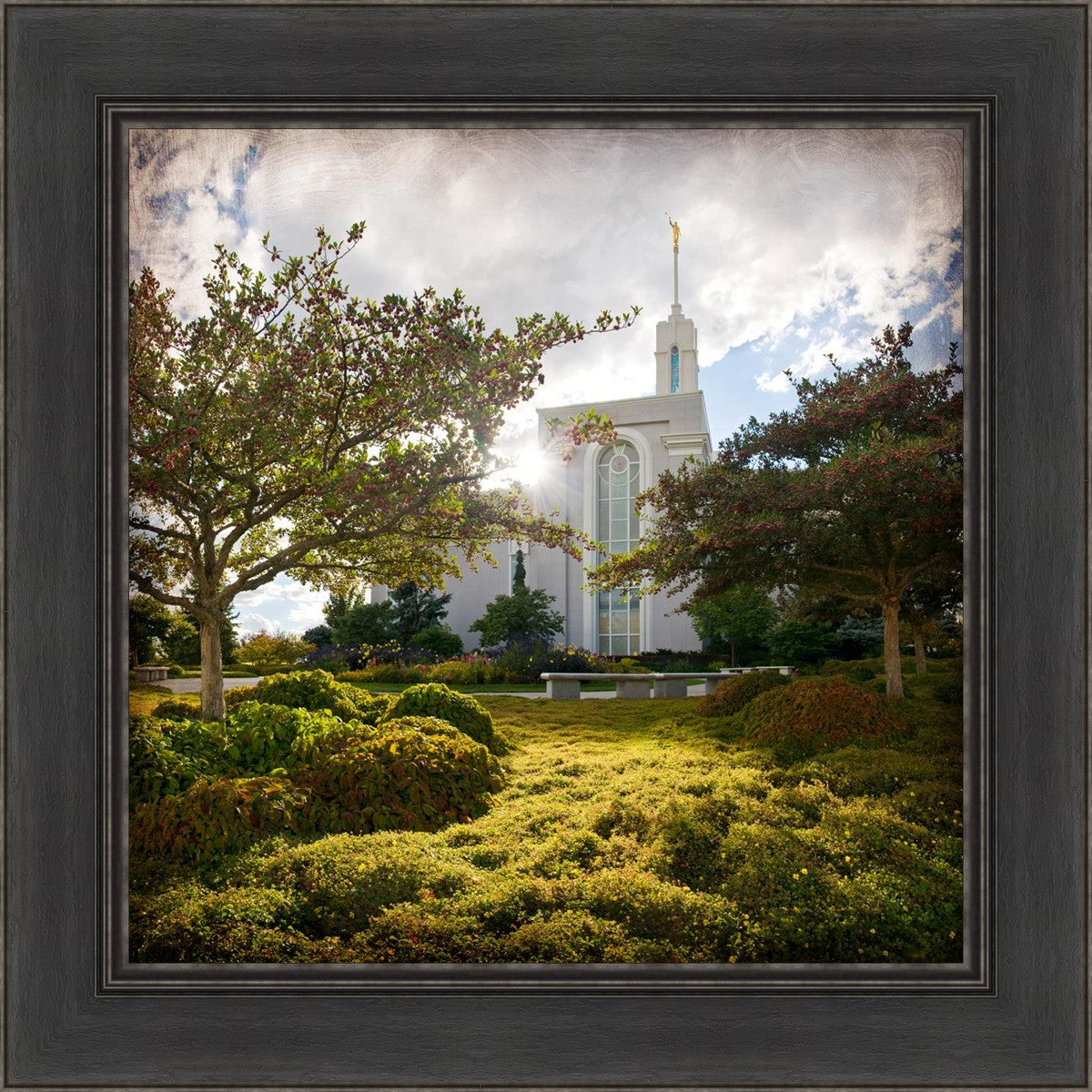 Since 1999 Landon has worked as an artisan in nearly 40 temples doing the decorative paint and gold leaf. He continues to do so as well as wood repair and graining. He was married in 2001 to Jacey Thomas in the Manti Utah temple. When she couldn’t find an image of the temple that she liked enough to purchase for their home, he decided to take one himself. That desire to create something original and different inspired his current series of temple art. They are taken from a panoramic viewpoint and stylized with an artistic border that reflect his paintings. All modern structures apart from the temple have been omitted.