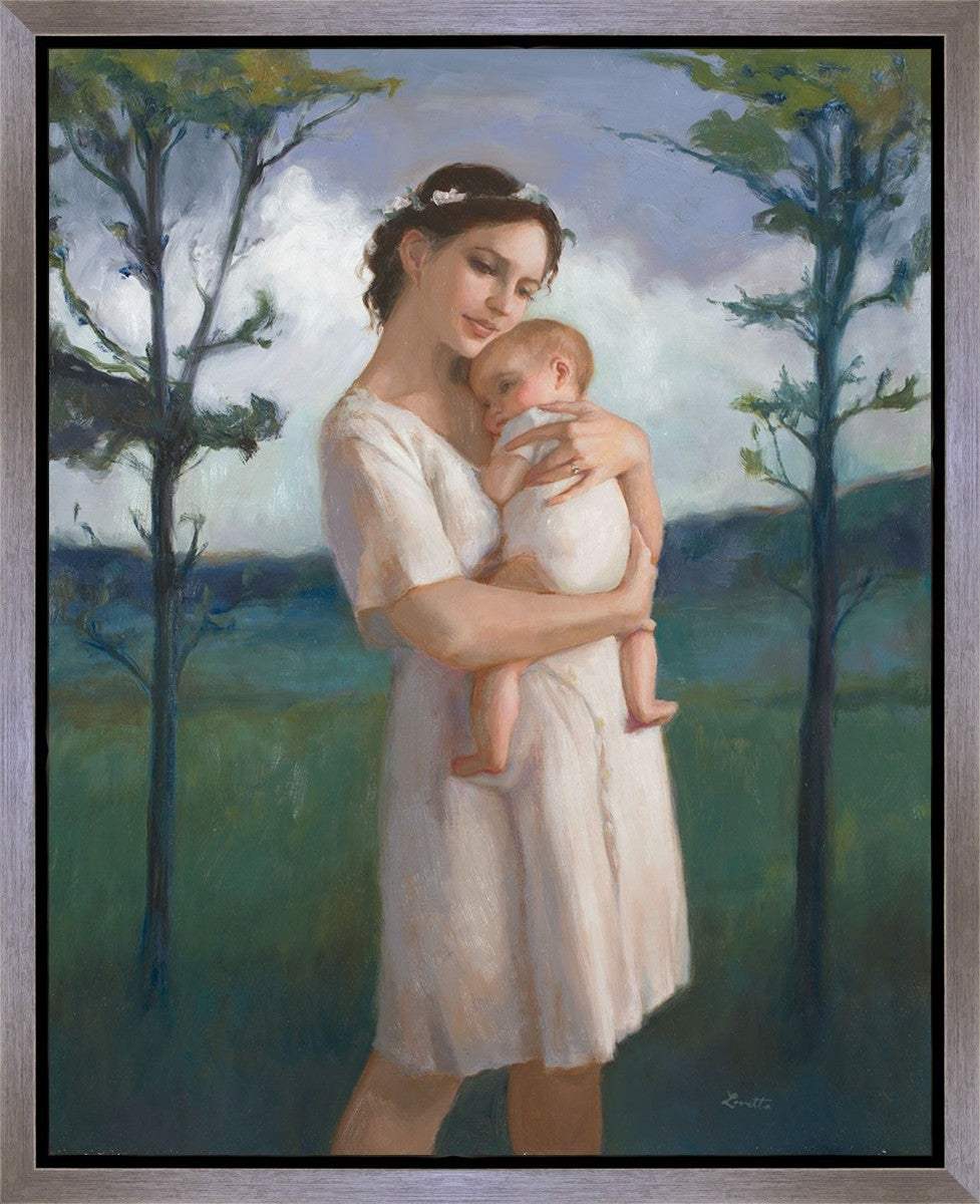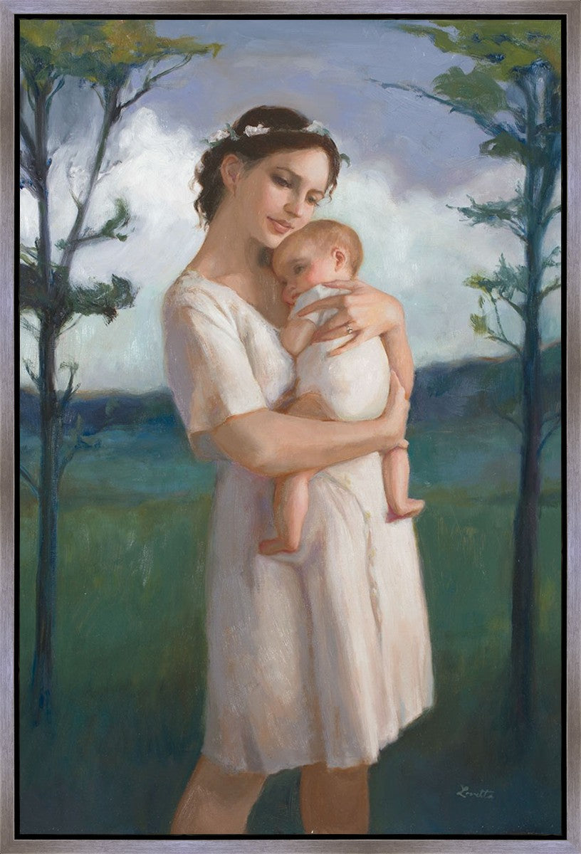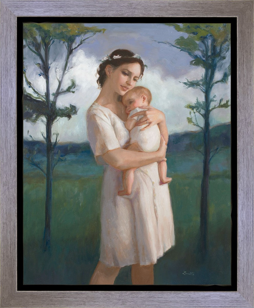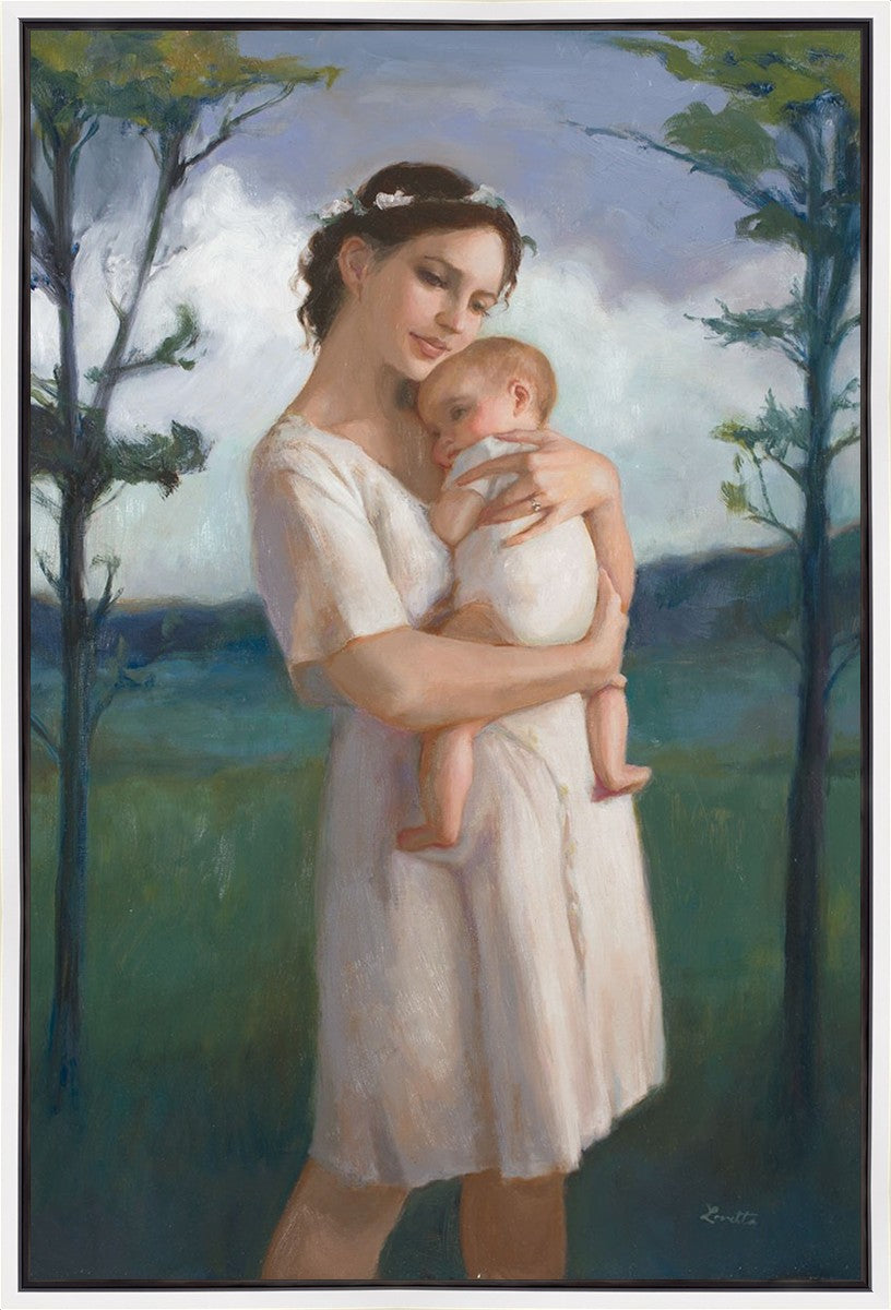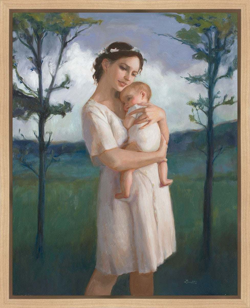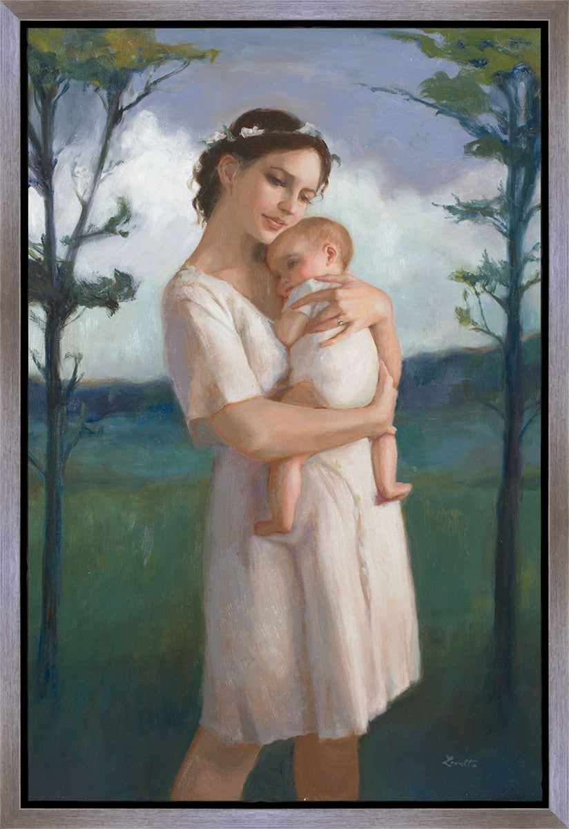 My first two children died as babies and even now, years later, I find a lot of solace in painting a mother and baby. The blues in this piece, the tender pose, and soft give this artwork a somber and calm feeling.