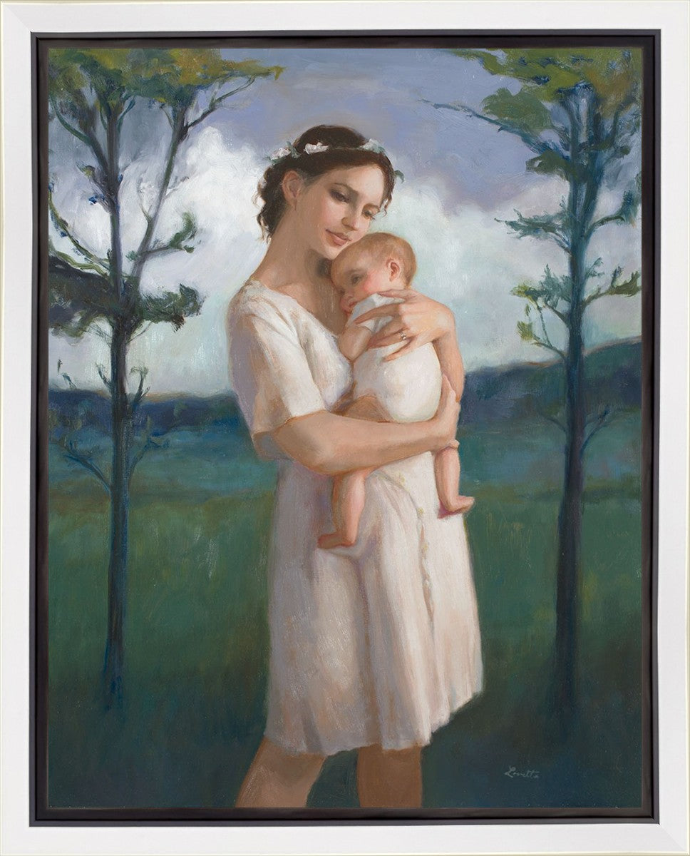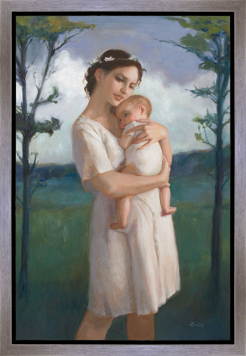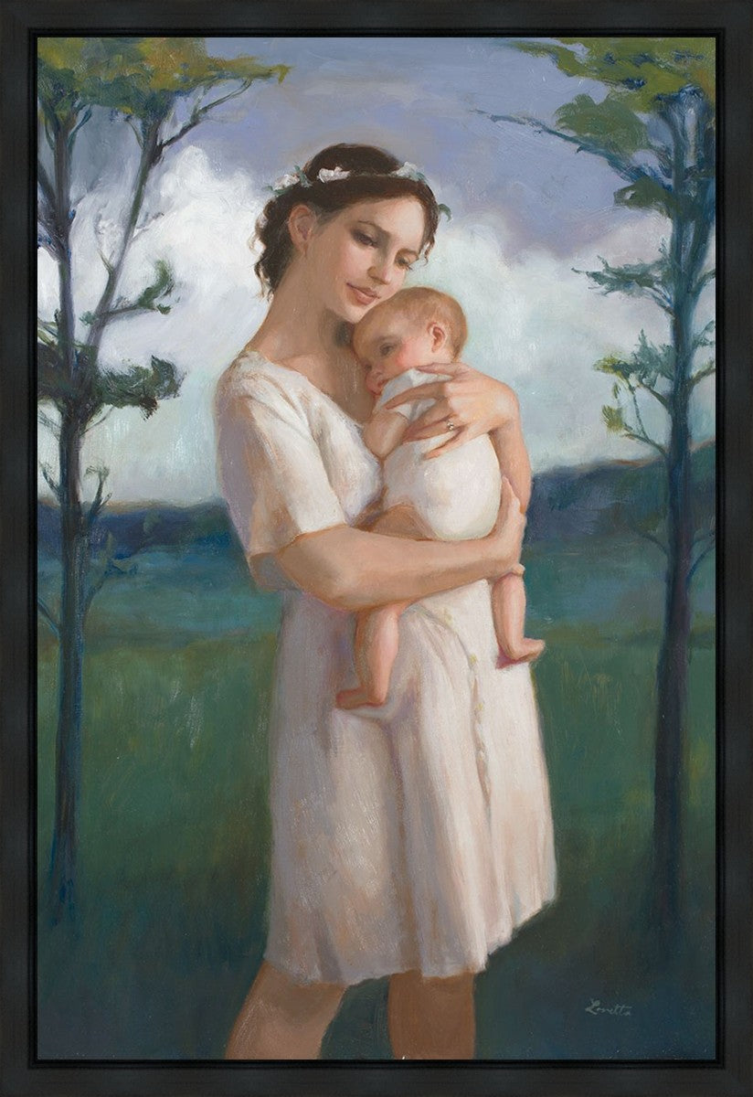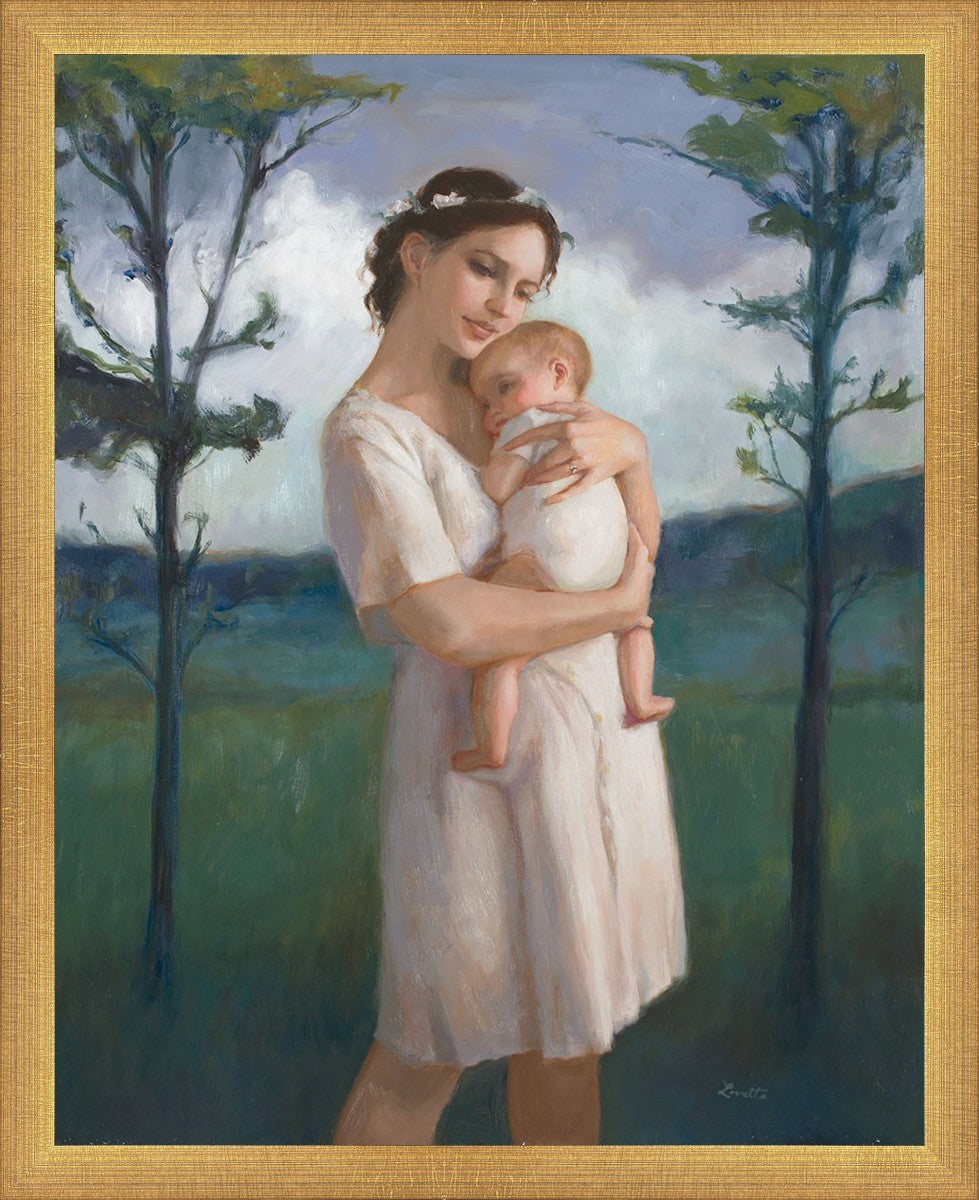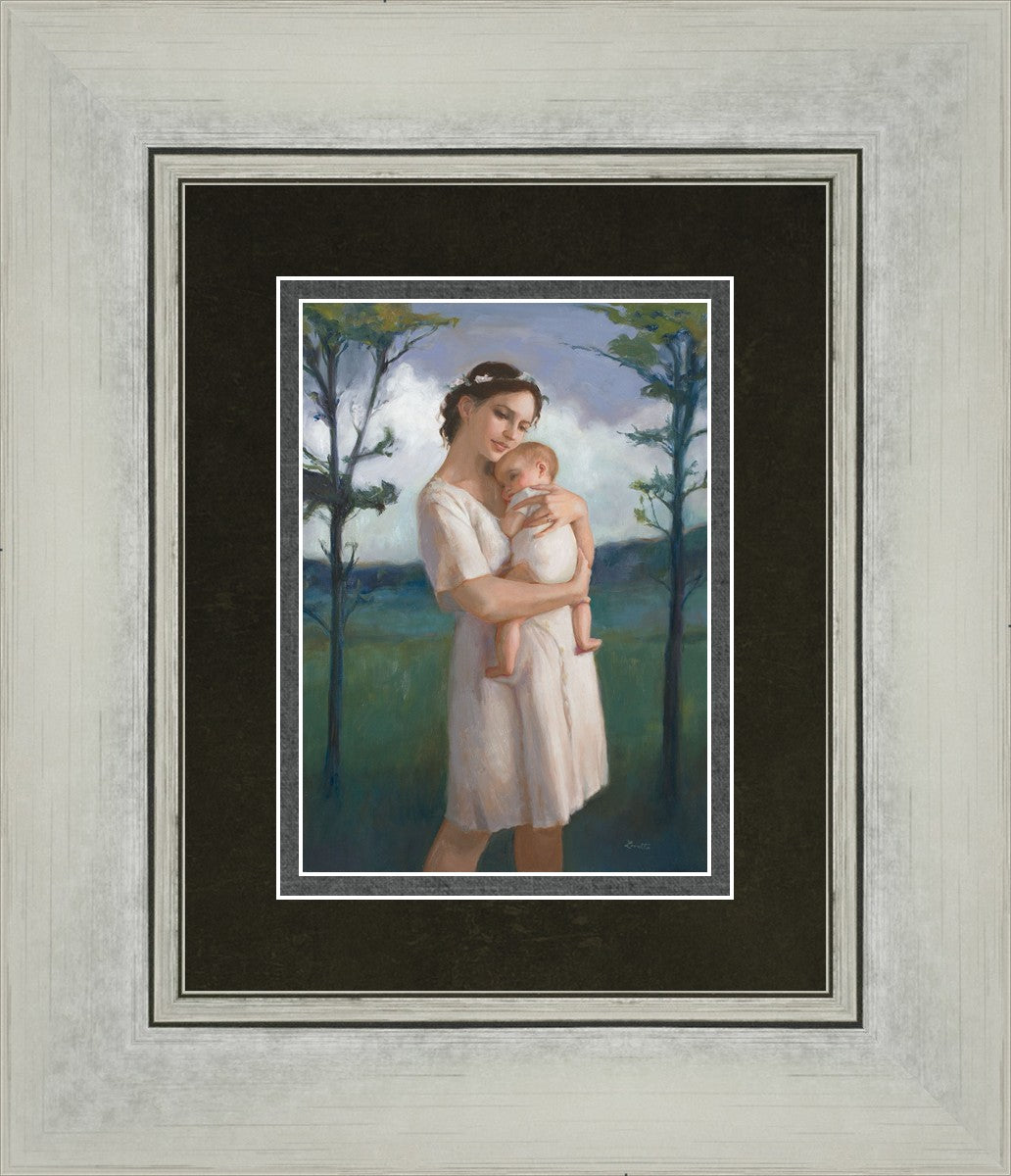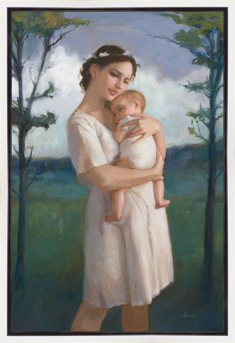 My first two children died as babies and even now, years later, I find a lot of solace in painting a mother and baby. The blues in this piece, the tender pose, and soft give this artwork a somber and calm feeling.