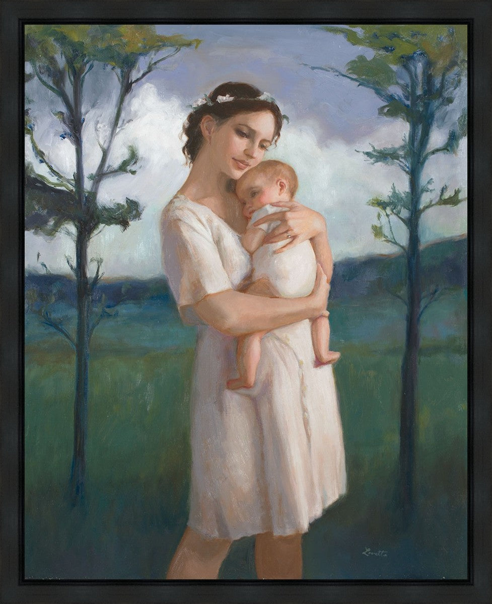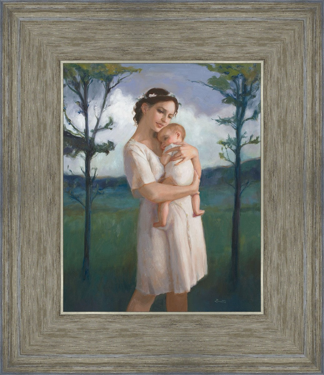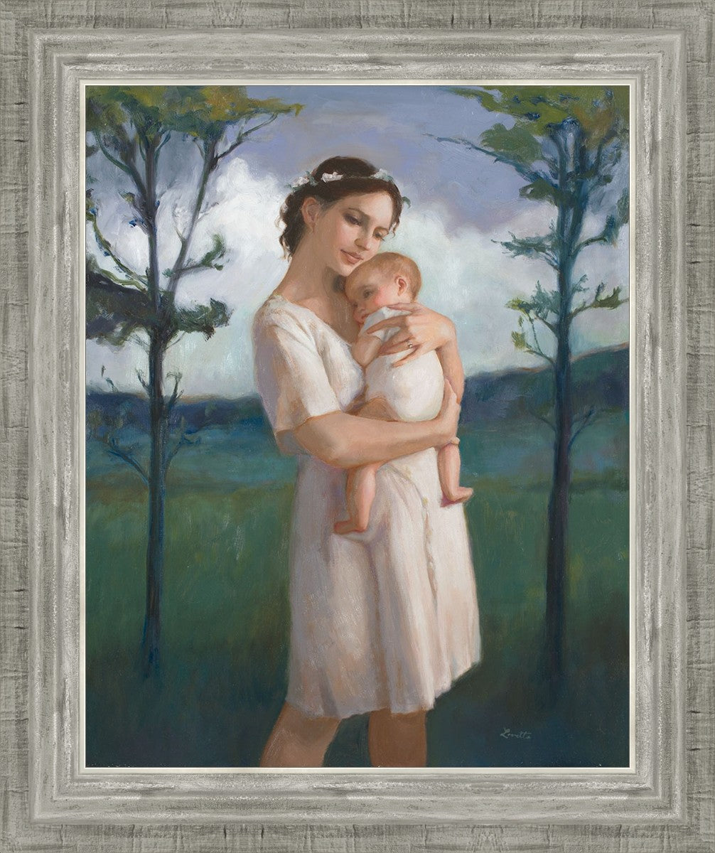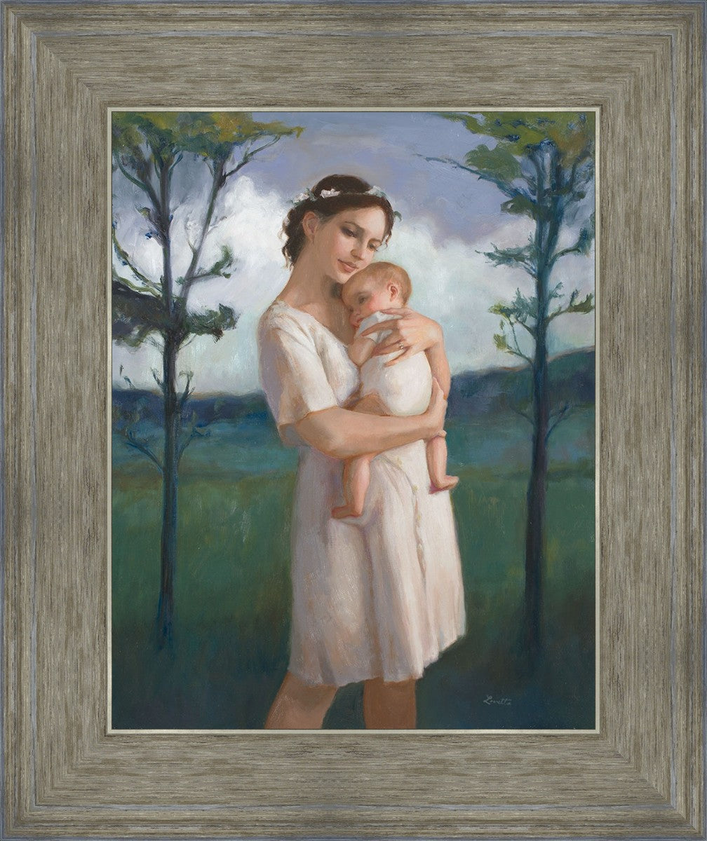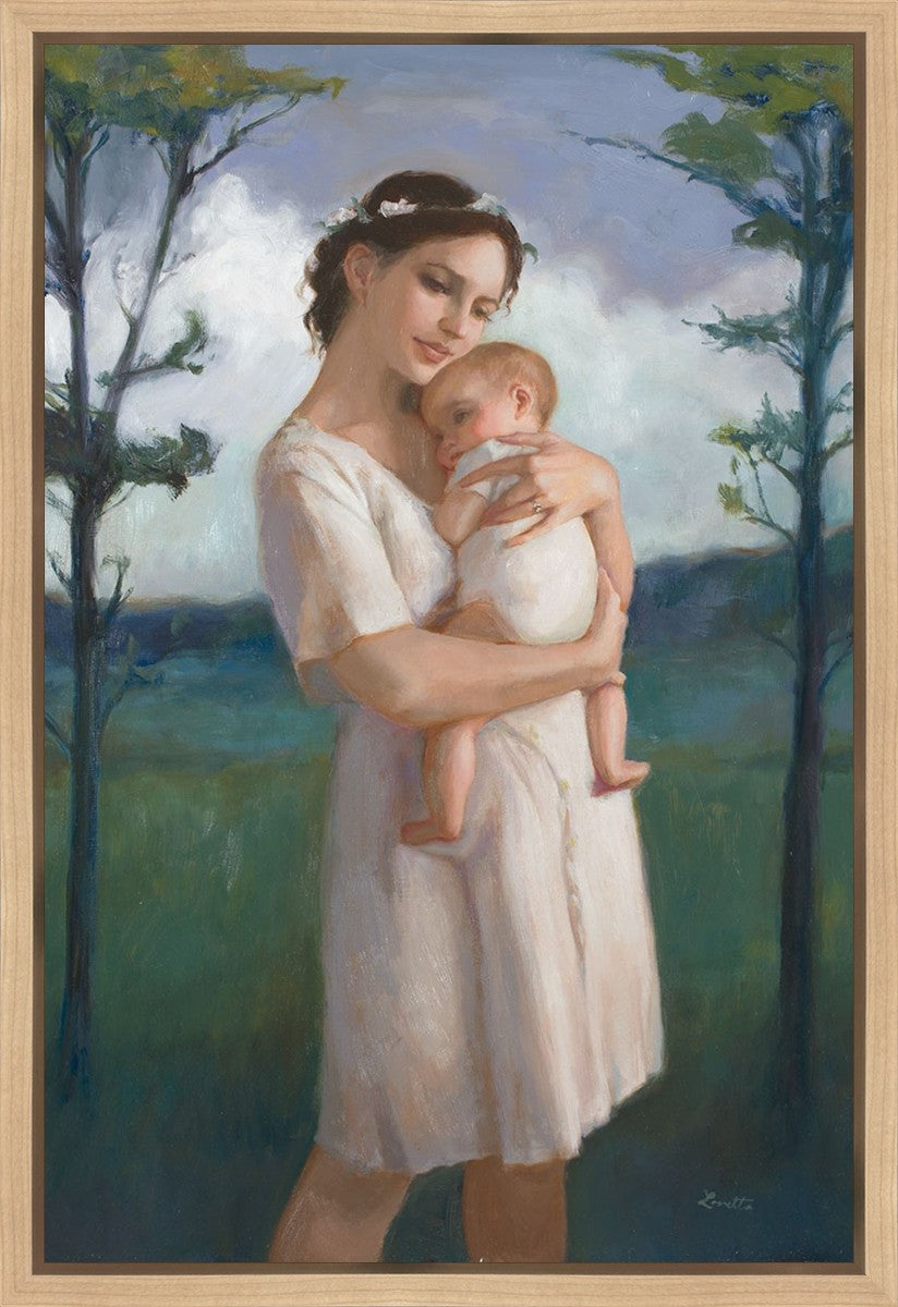 My first two children died as babies and even now, years later, I find a lot of solace in painting a mother and baby. The blues in this piece, the tender pose, and soft give this artwork a somber and calm feeling.