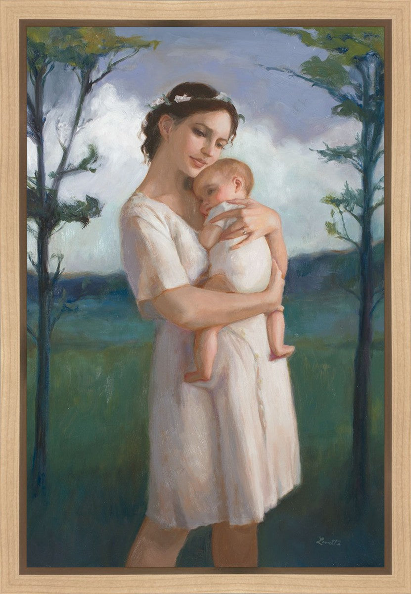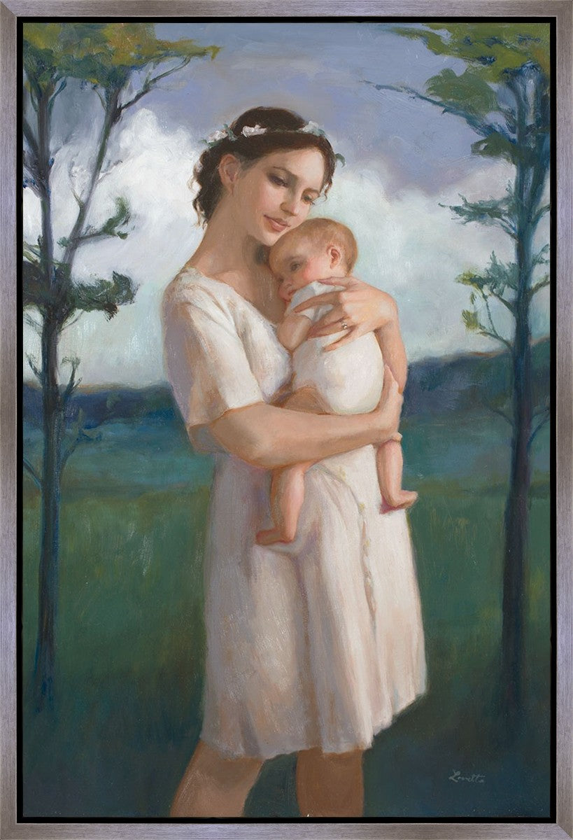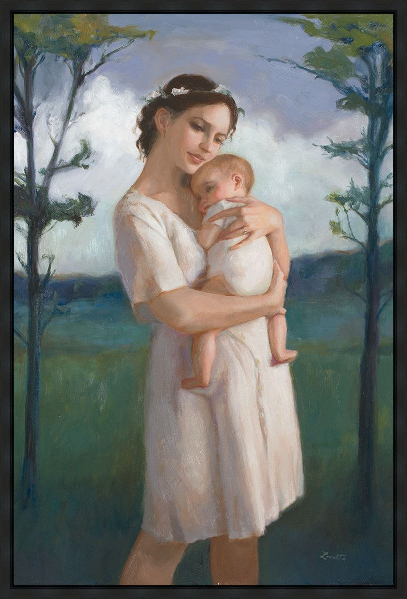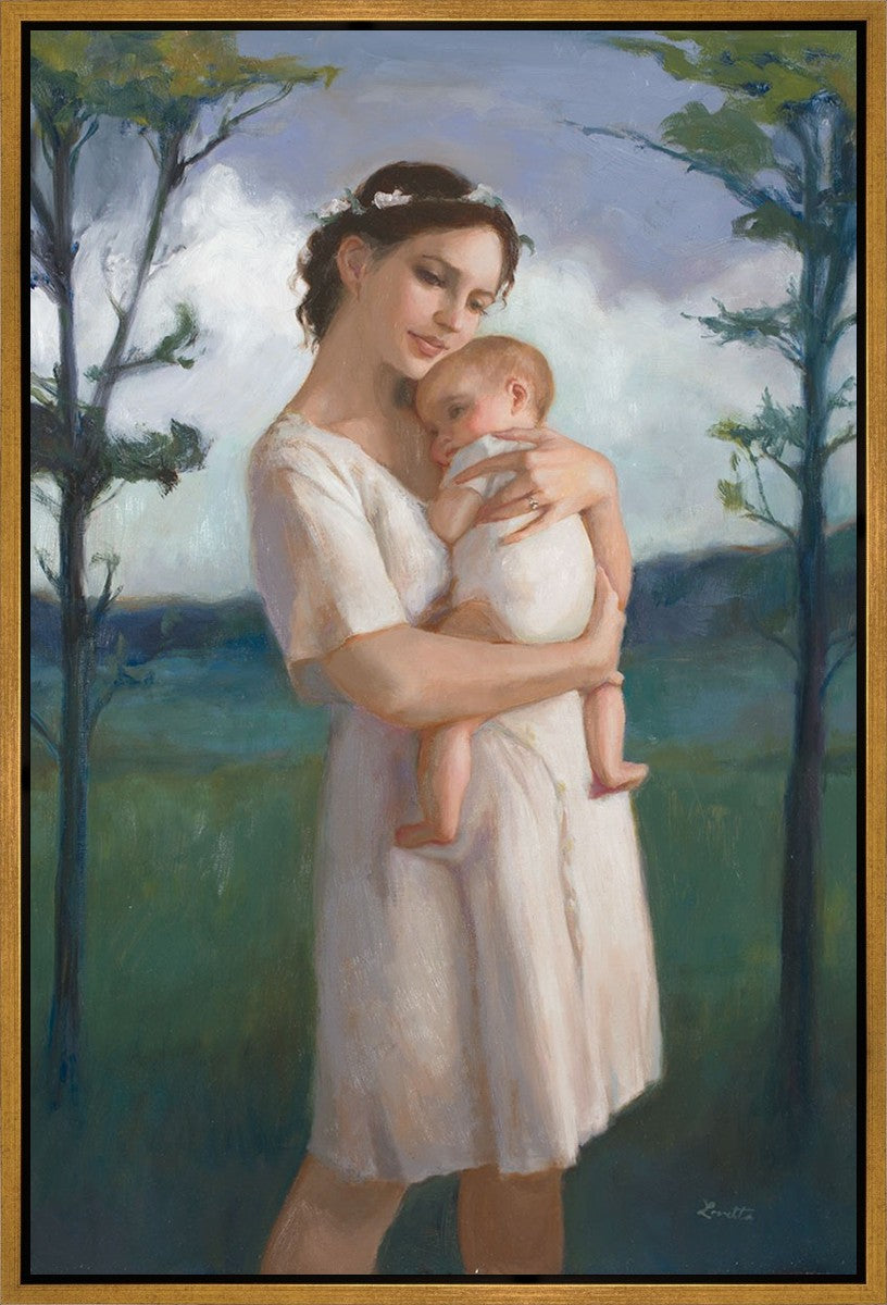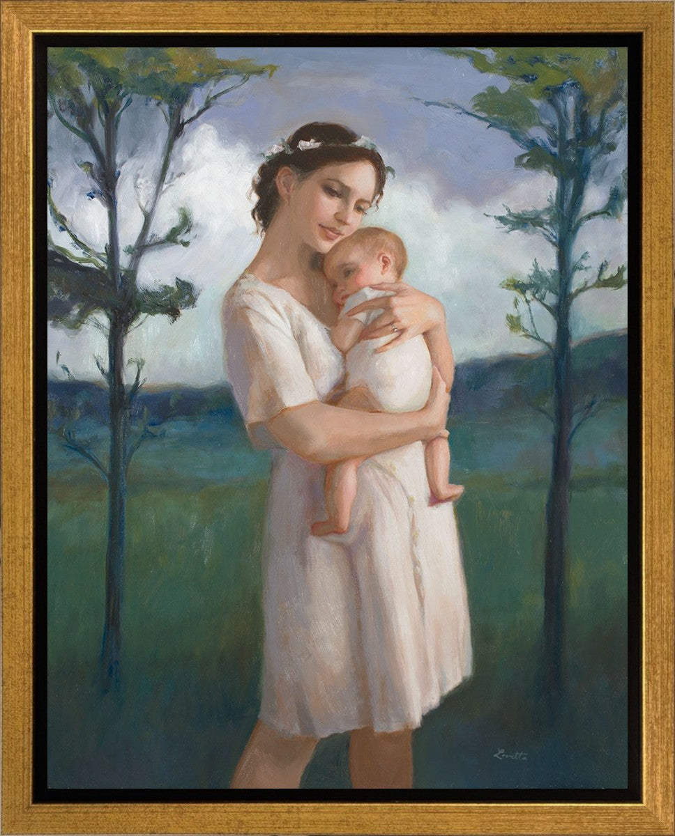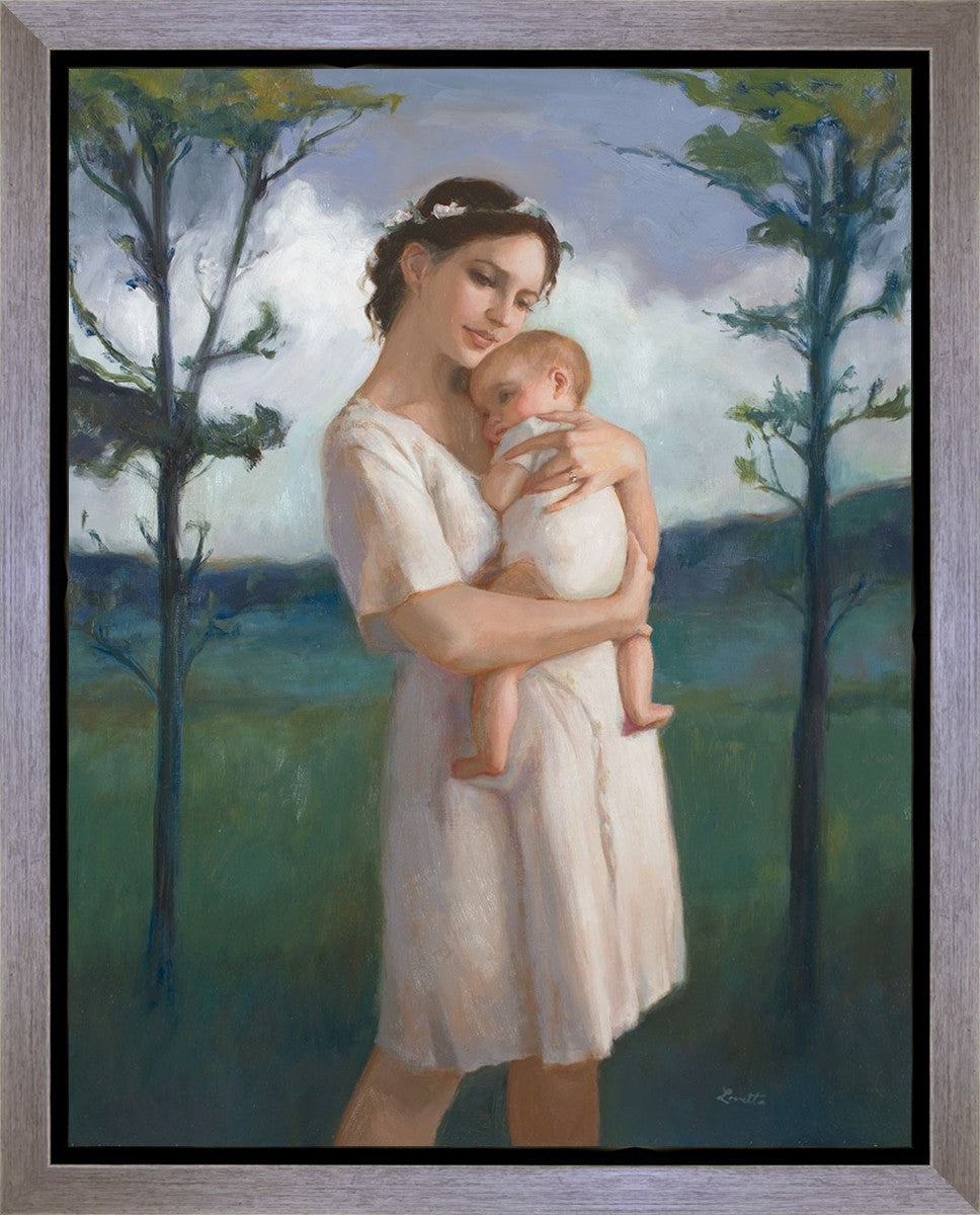 My first two children died as babies and even now, years later, I find a lot of solace in painting a mother and baby. The blues in this piece, the tender pose, and soft give this artwork a somber and calm feeling.