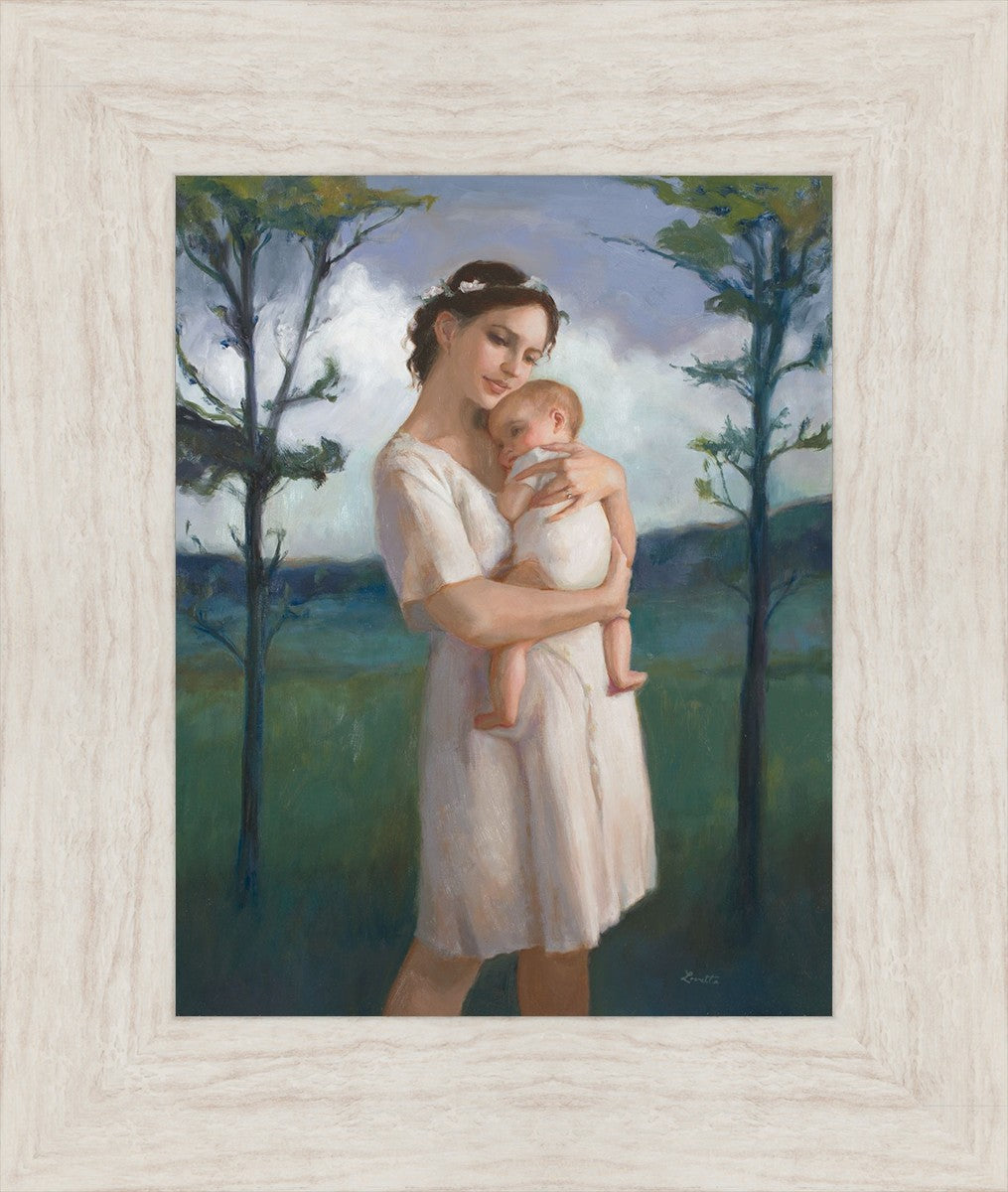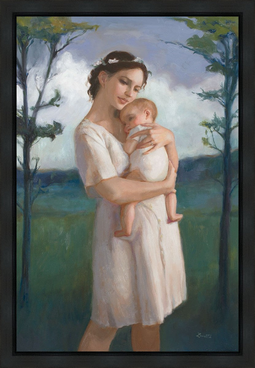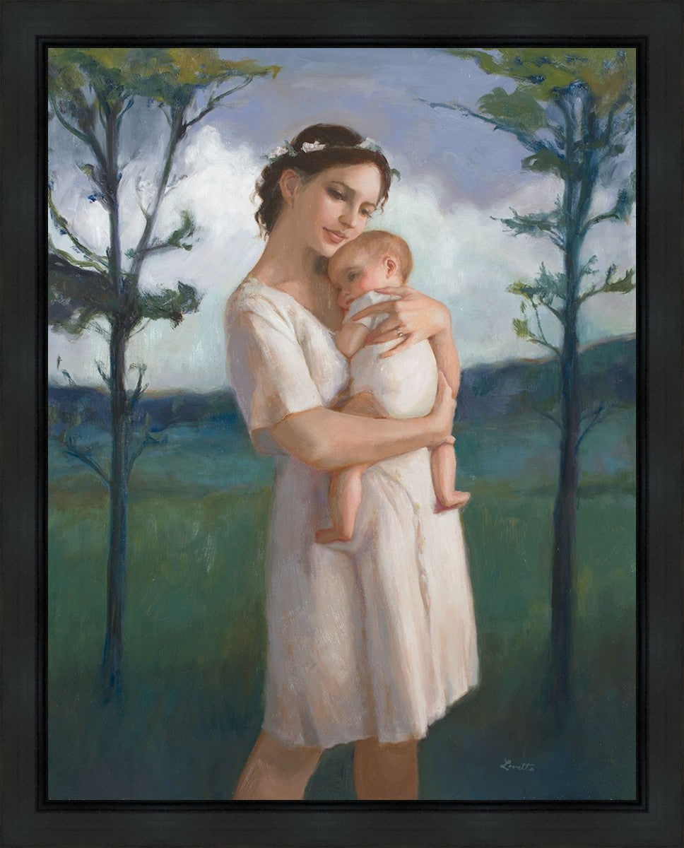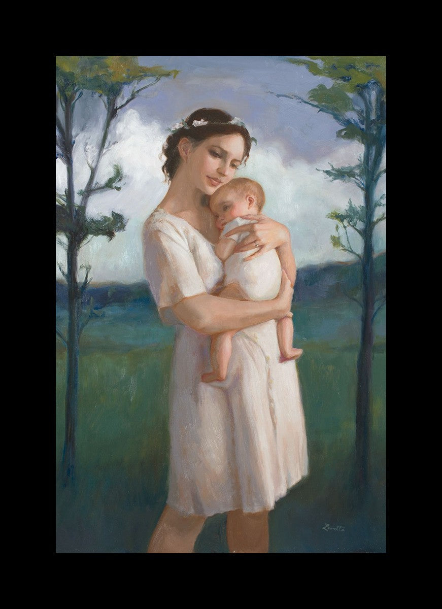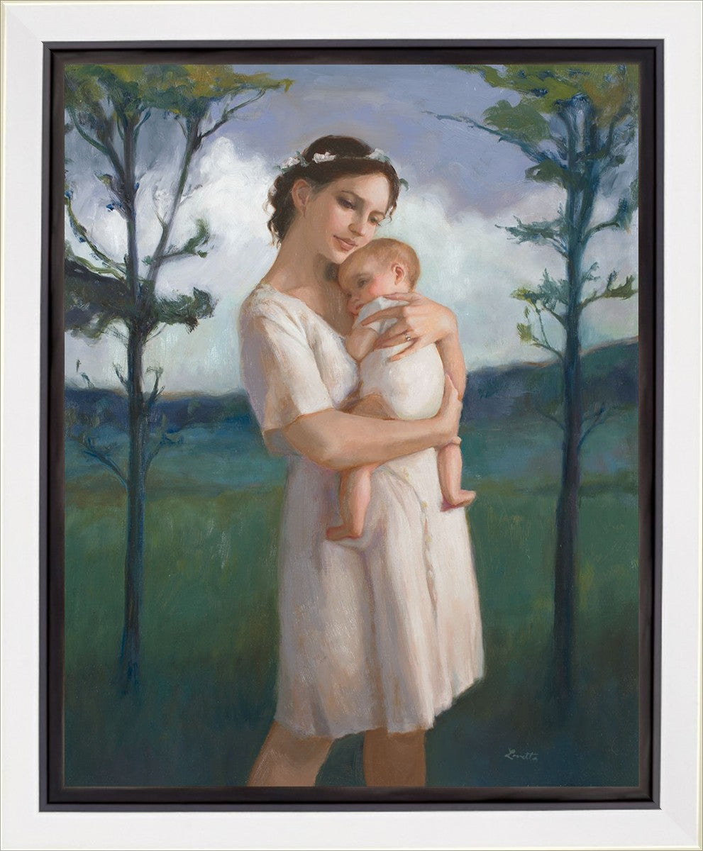 My first two children died as babies and even now, years later, I find a lot of solace in painting a mother and baby. The blues in this piece, the tender pose, and soft give this artwork a somber and calm feeling.