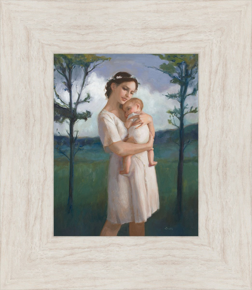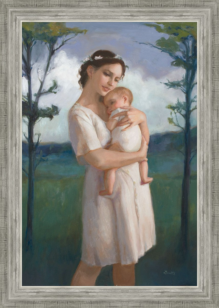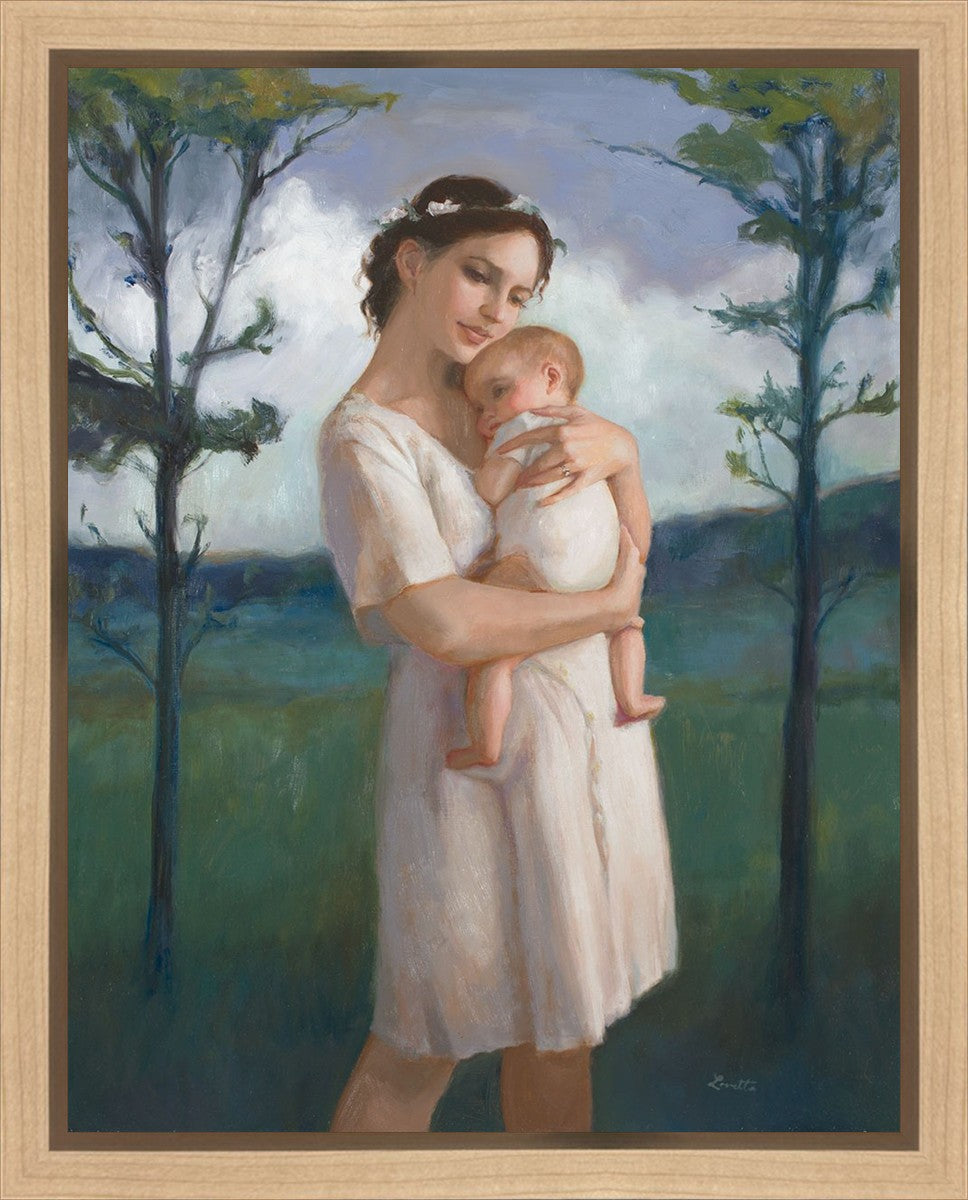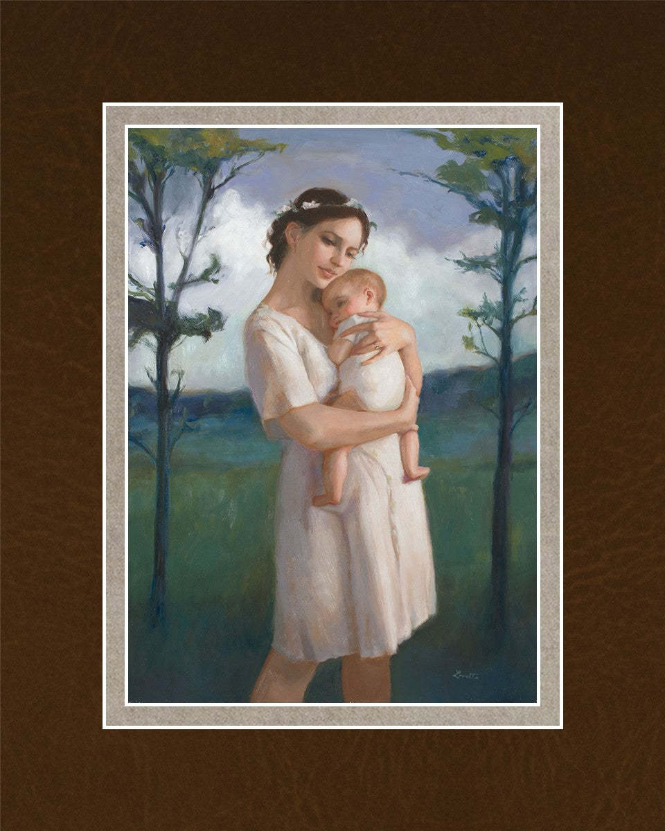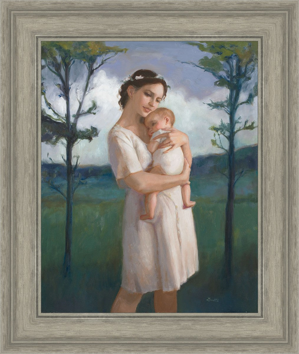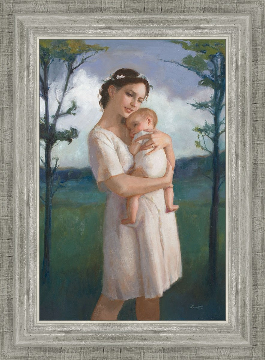 My first two children died as babies and even now, years later, I find a lot of solace in painting a mother and baby. The blues in this piece, the tender pose, and soft give this artwork a somber and calm feeling.