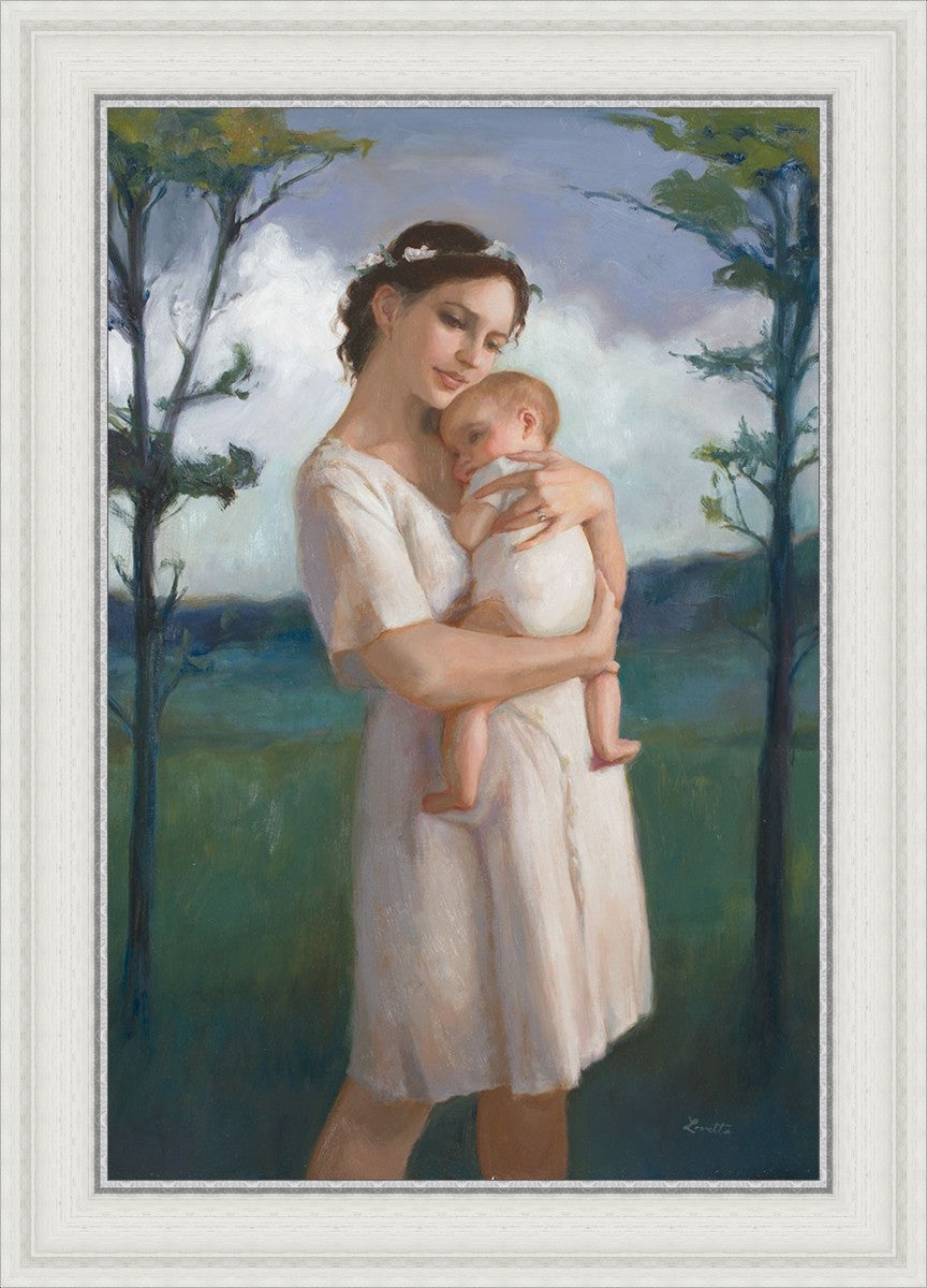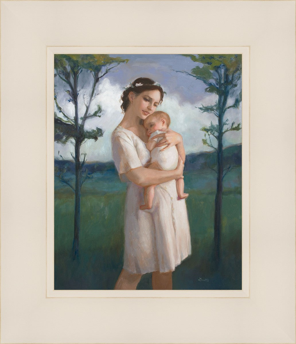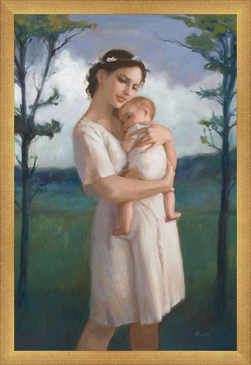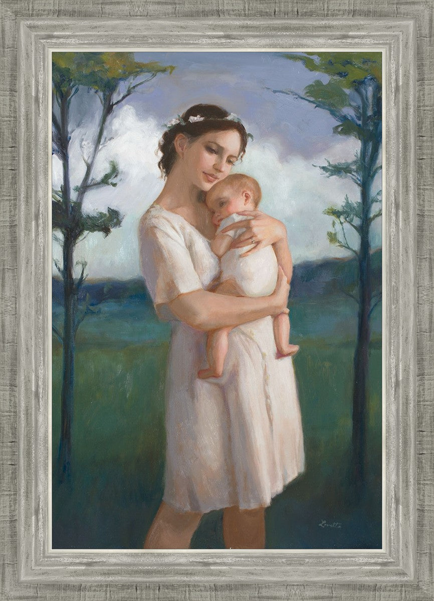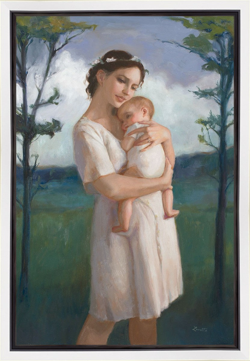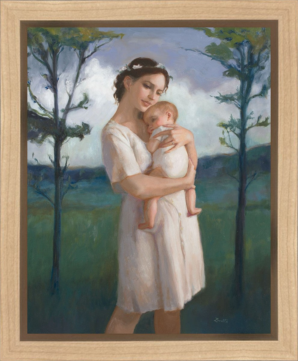 My first two children died as babies and even now, years later, I find a lot of solace in painting a mother and baby. The blues in this piece, the tender pose, and soft give this artwork a somber and calm feeling.