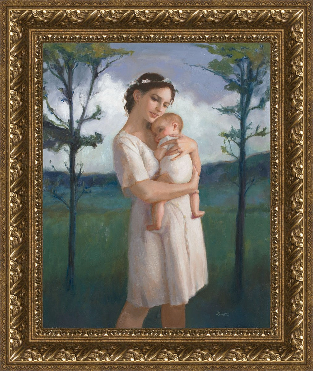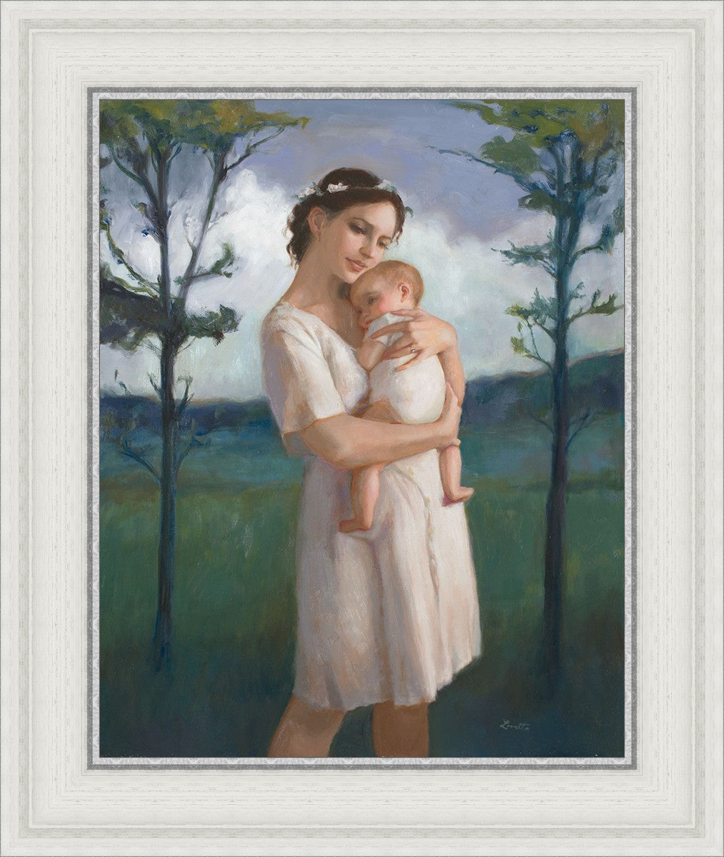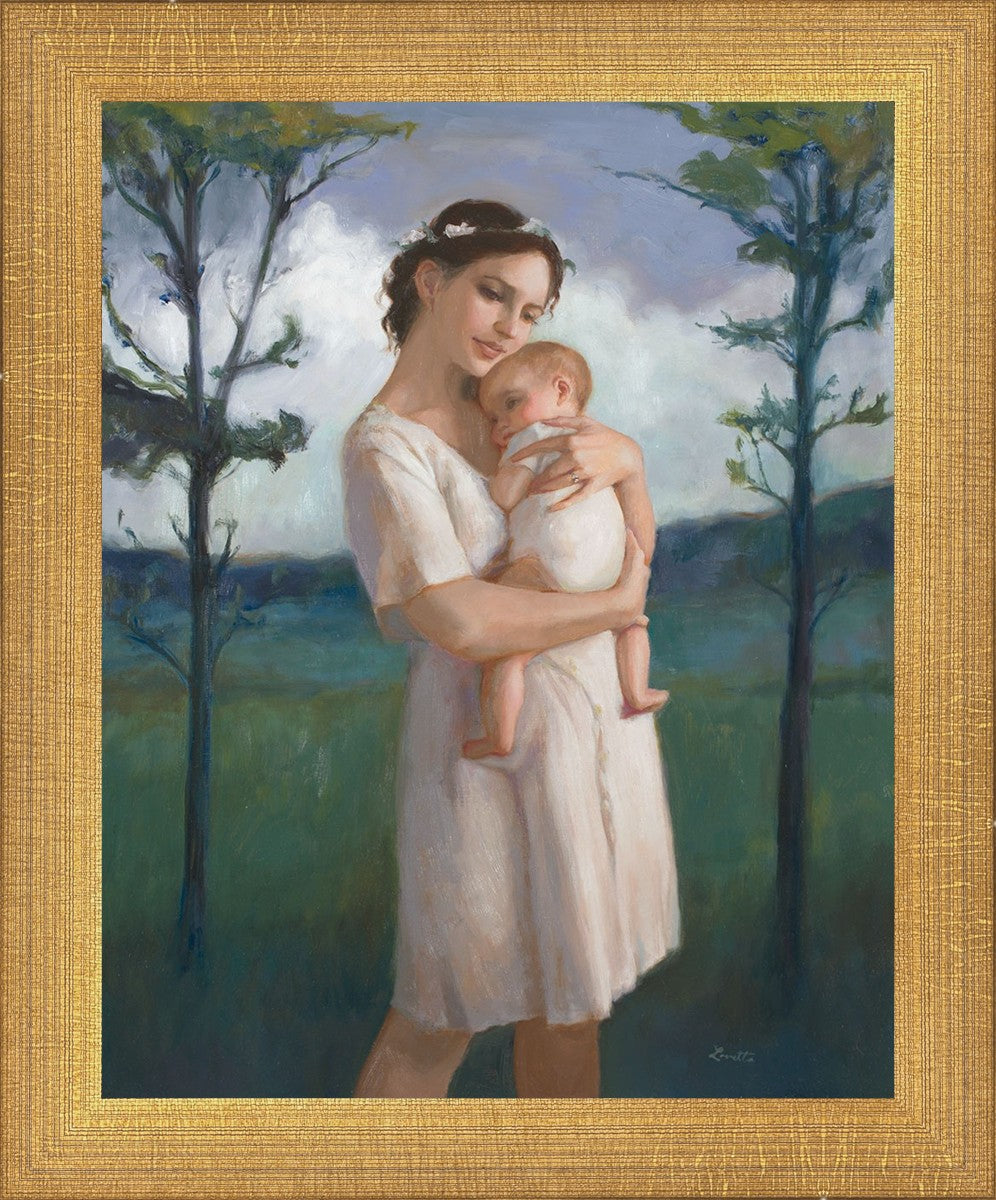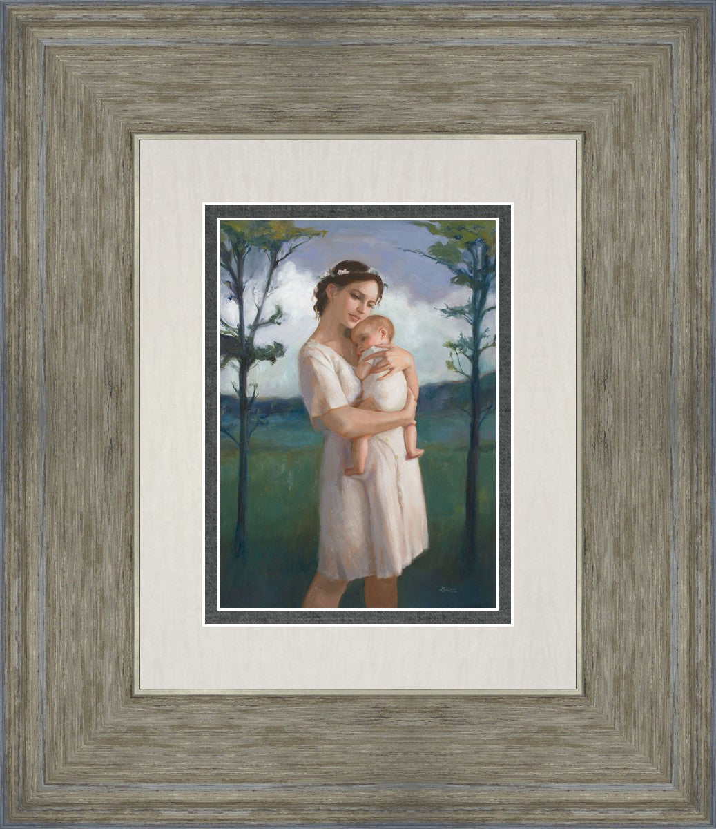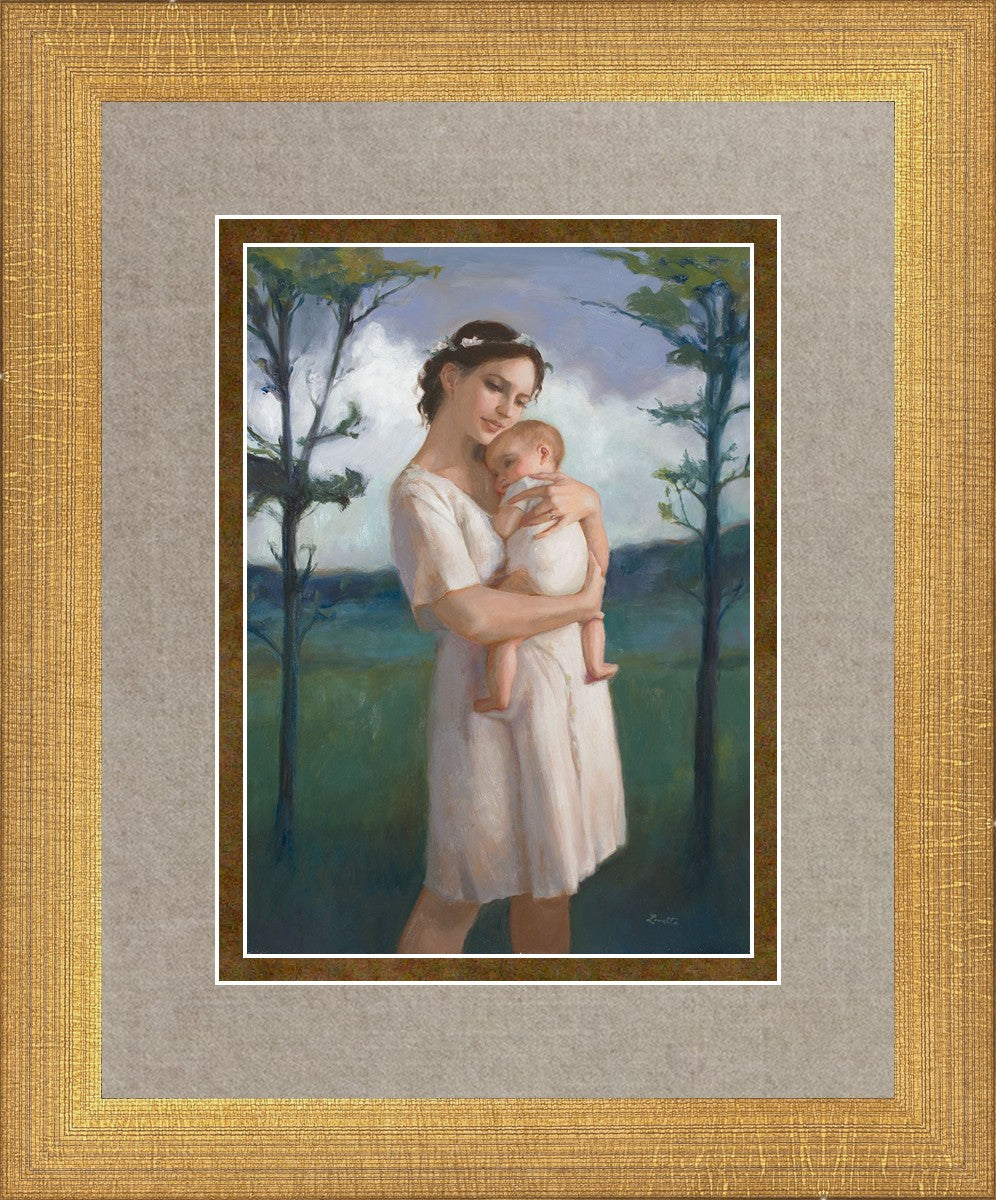 My first two children died as babies and even now, years later, I find a lot of solace in painting a mother and baby. The blues in this piece, the tender pose, and soft give this artwork a somber and calm feeling.