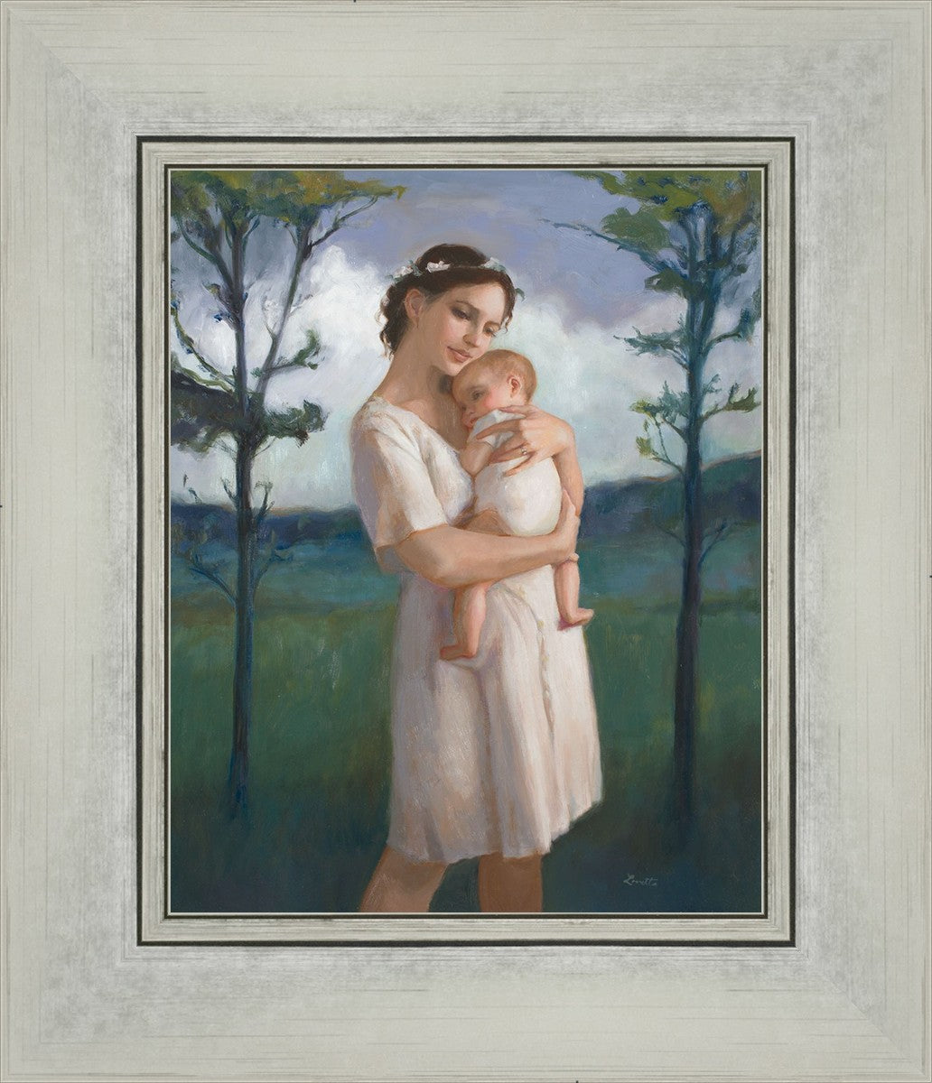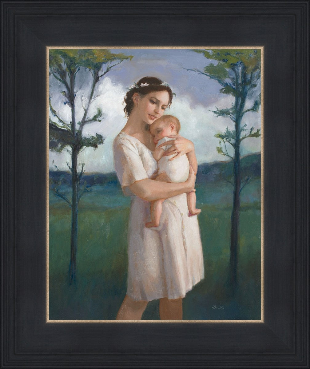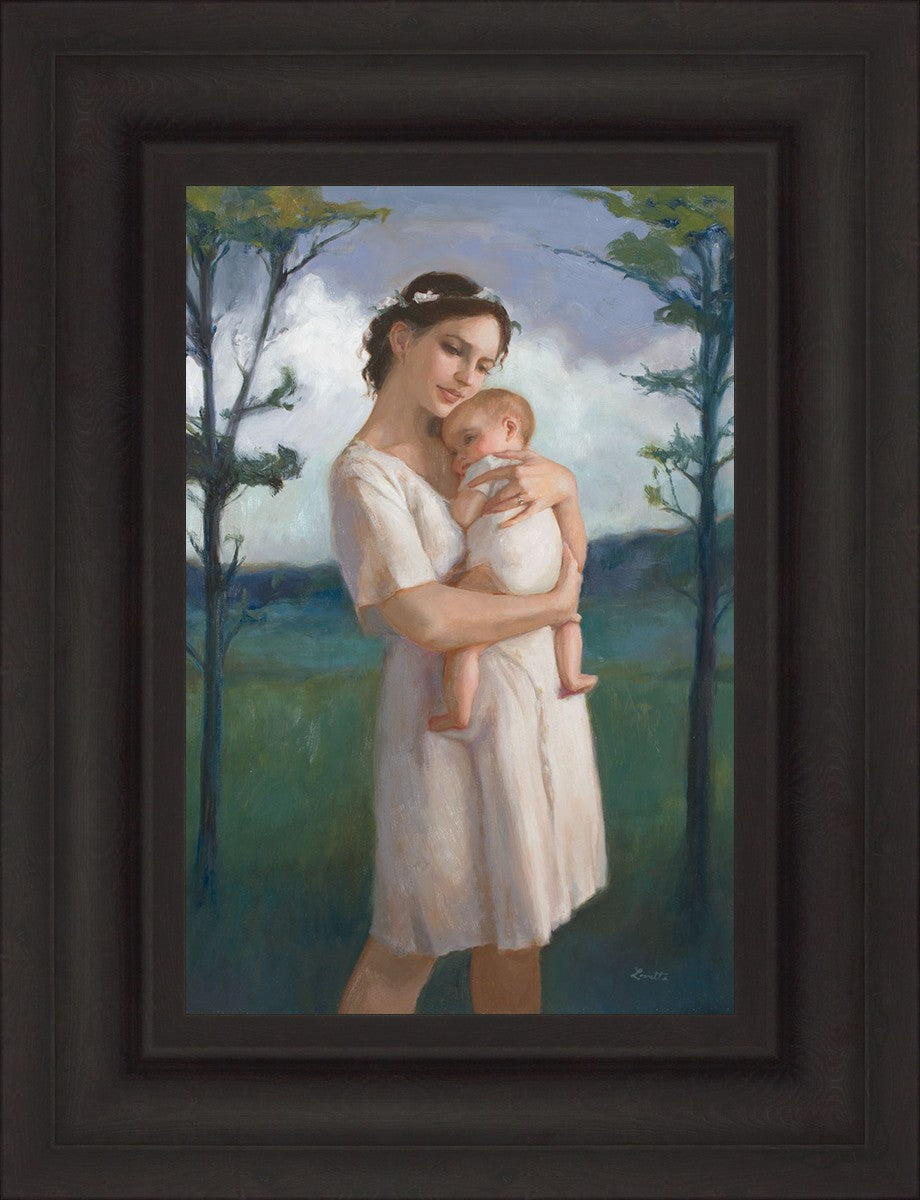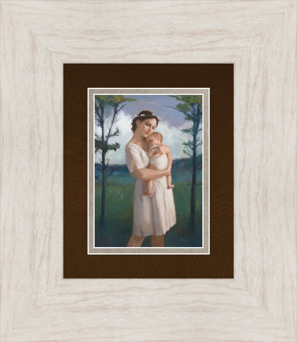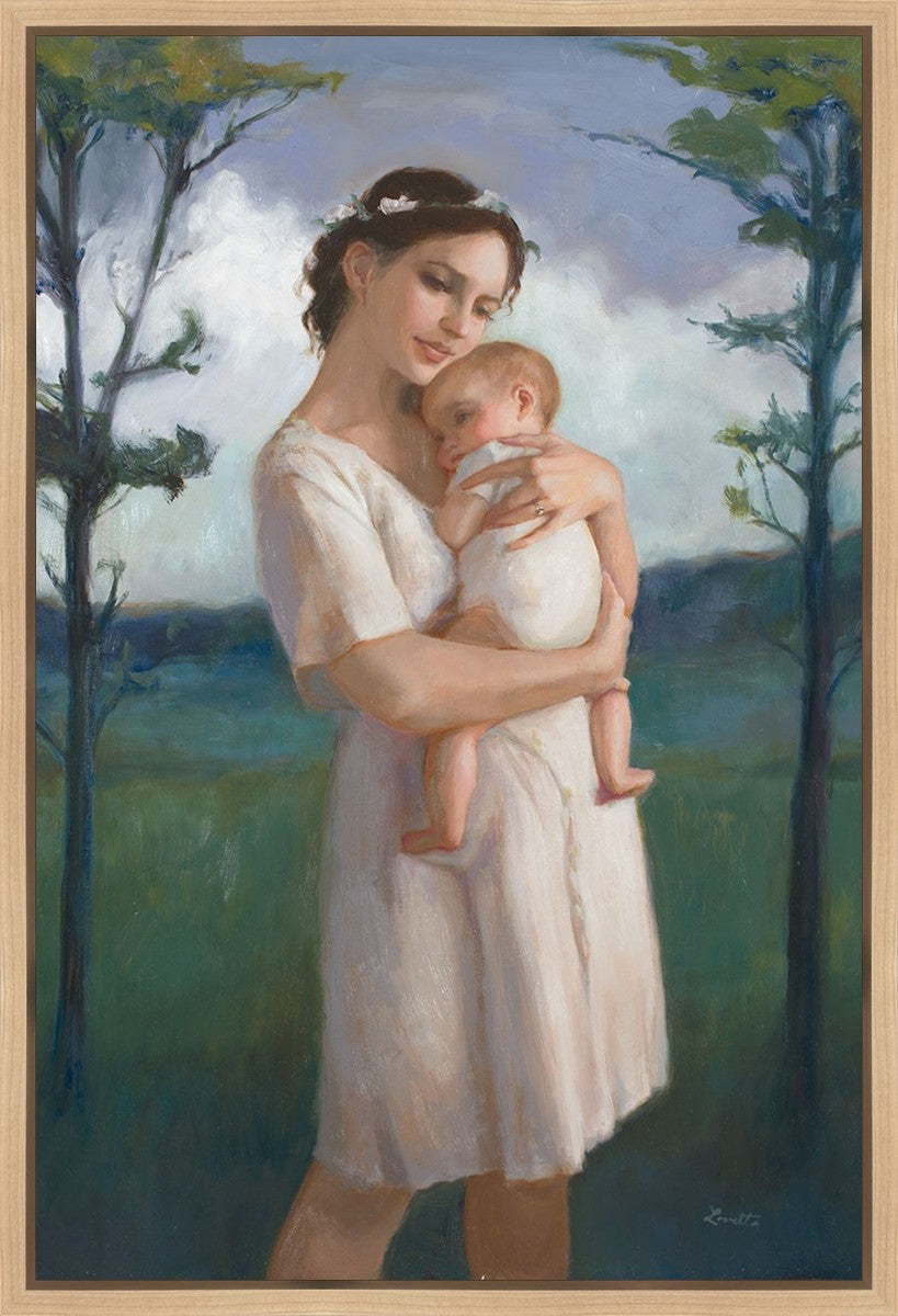 My first two children died as babies and even now, years later, I find a lot of solace in painting a mother and baby. The blues in this piece, the tender pose, and soft give this artwork a somber and calm feeling.