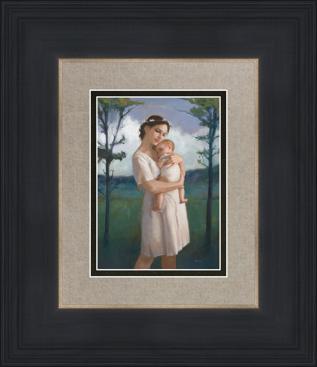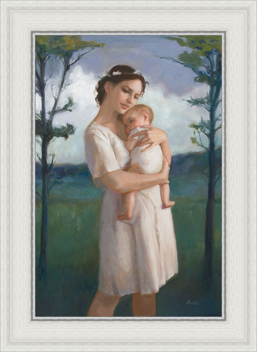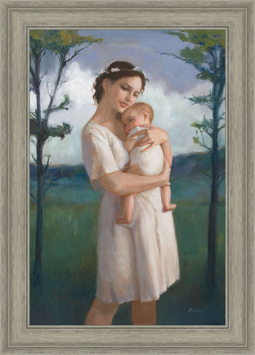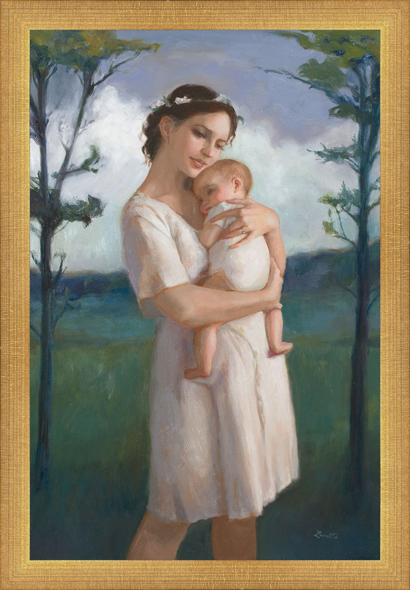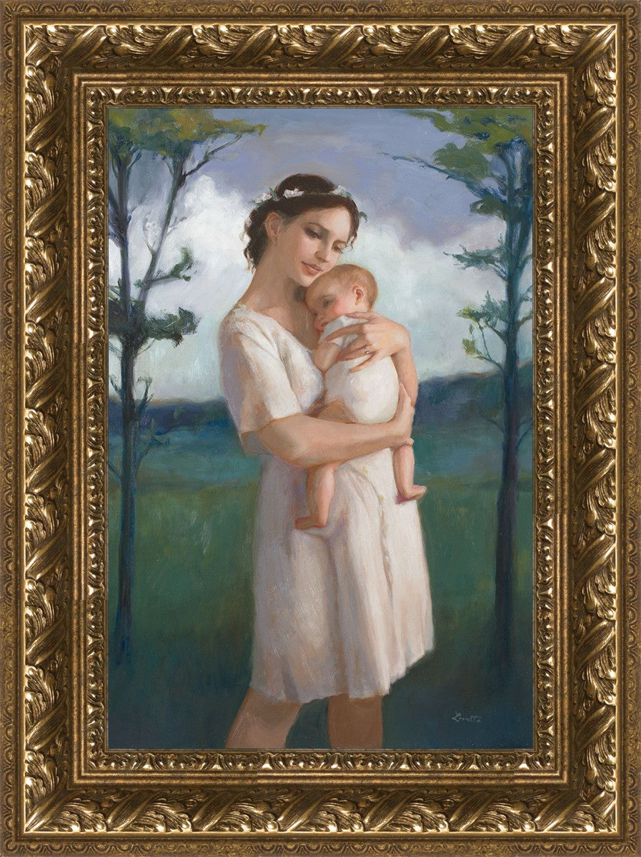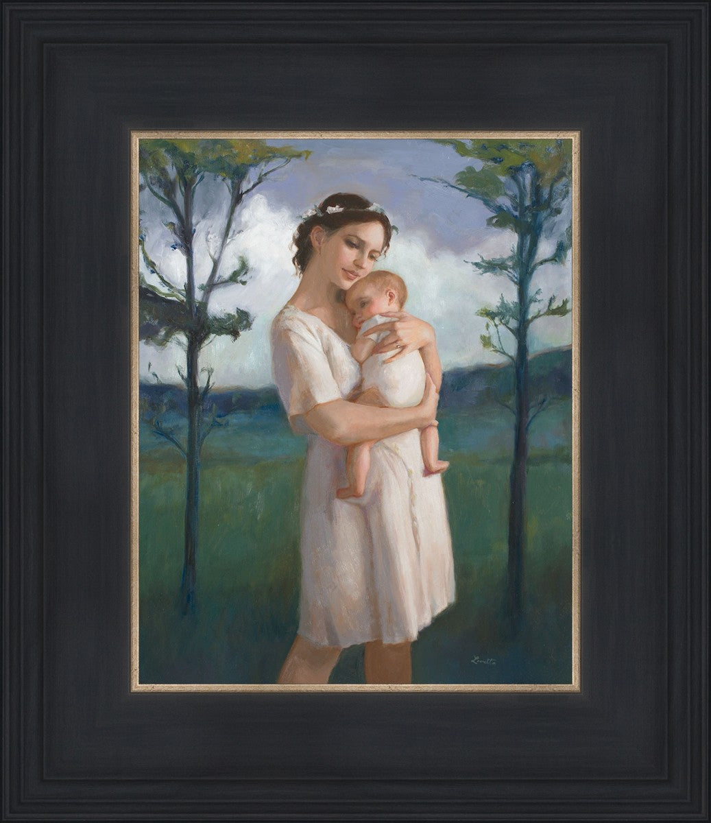 My first two children died as babies and even now, years later, I find a lot of solace in painting a mother and baby. The blues in this piece, the tender pose, and soft give this artwork a somber and calm feeling.