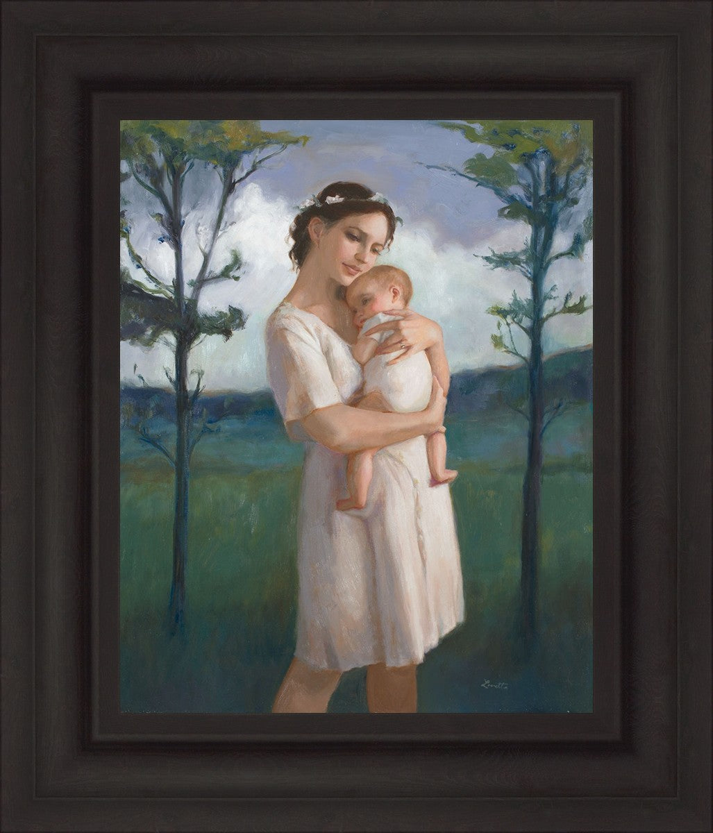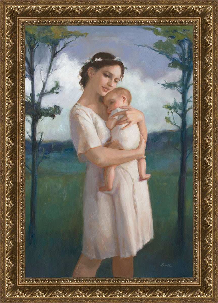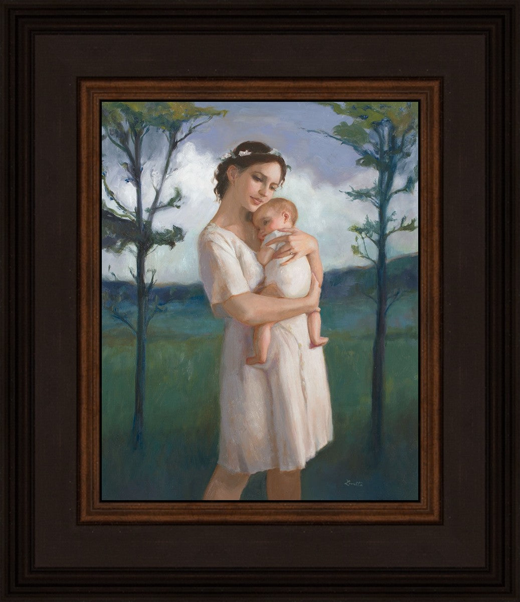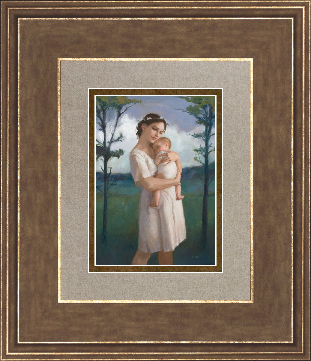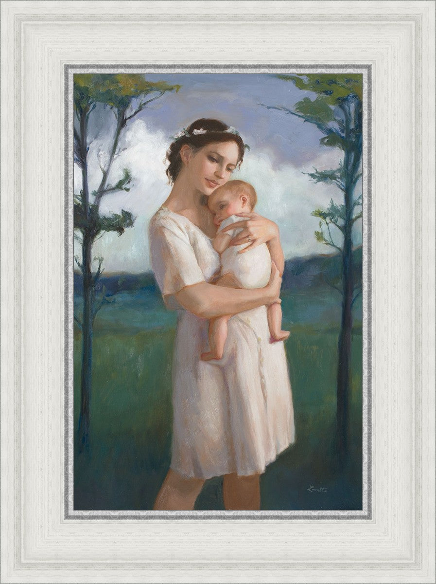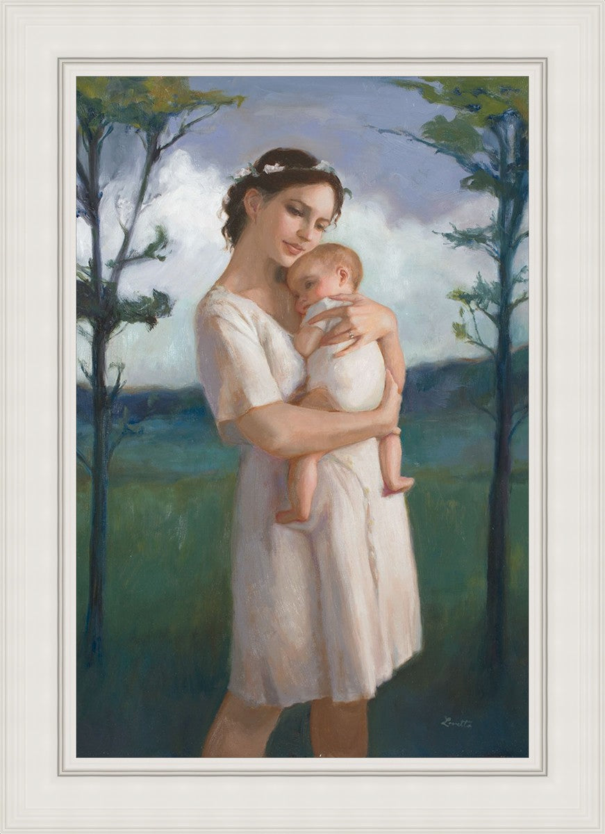 My first two children died as babies and even now, years later, I find a lot of solace in painting a mother and baby. The blues in this piece, the tender pose, and soft give this artwork a somber and calm feeling.
