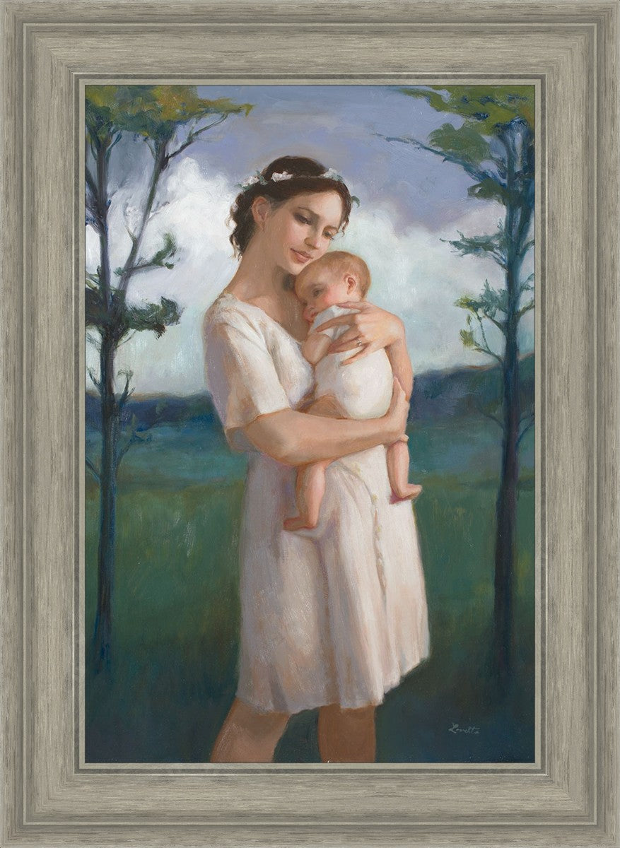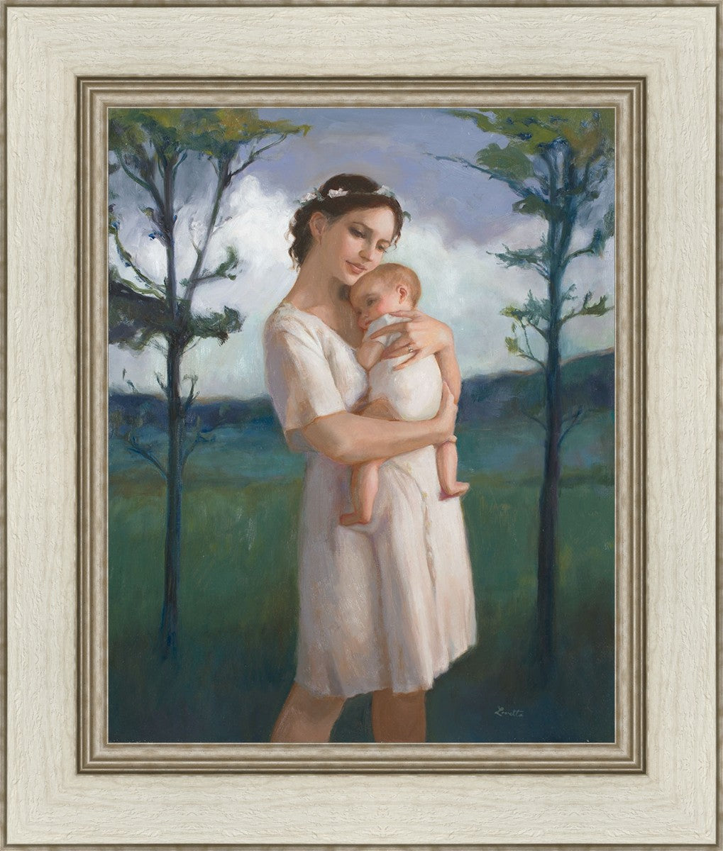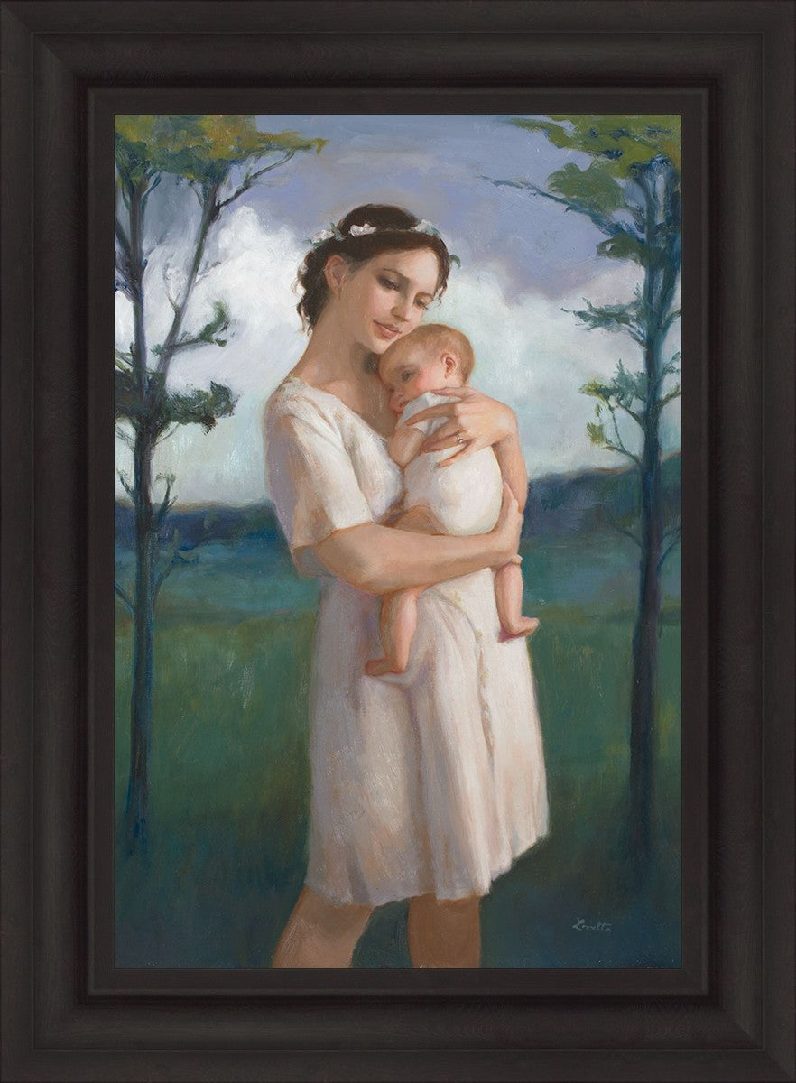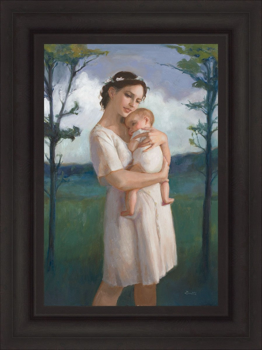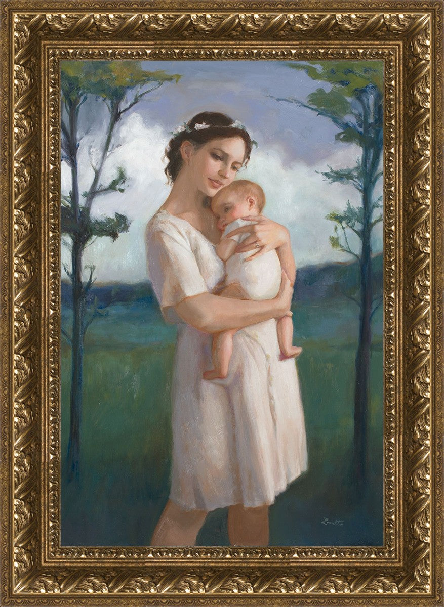 My first two children died as babies and even now, years later, I find a lot of solace in painting a mother and baby. The blues in this piece, the tender pose, and soft give this artwork a somber and calm feeling.