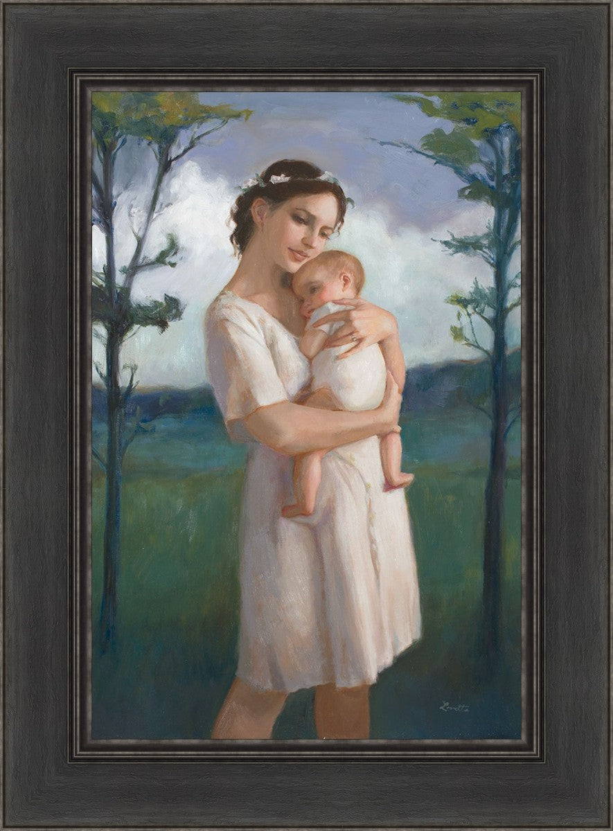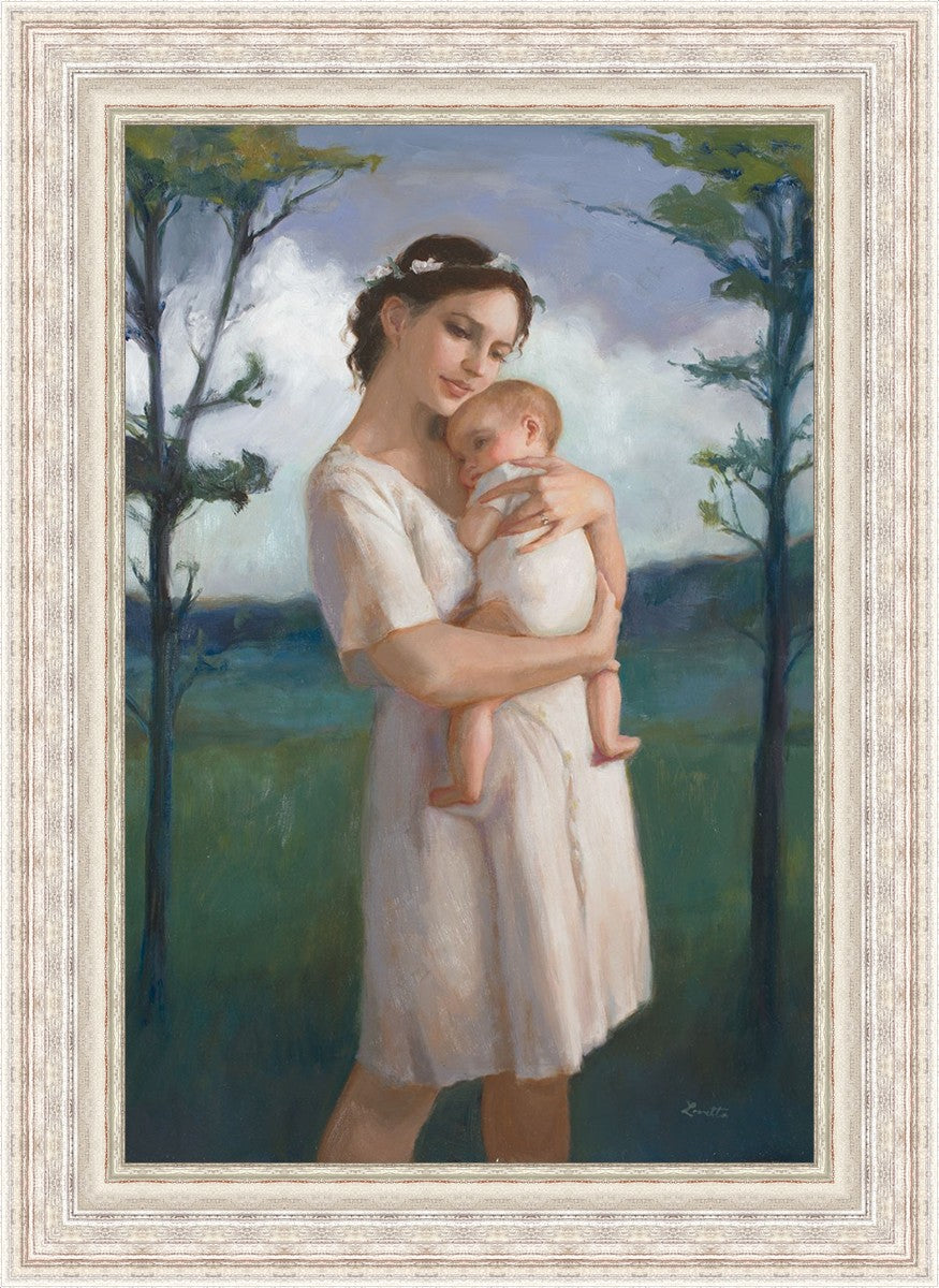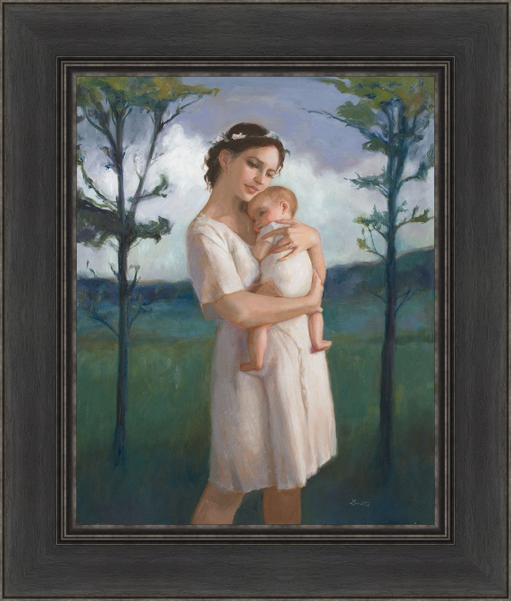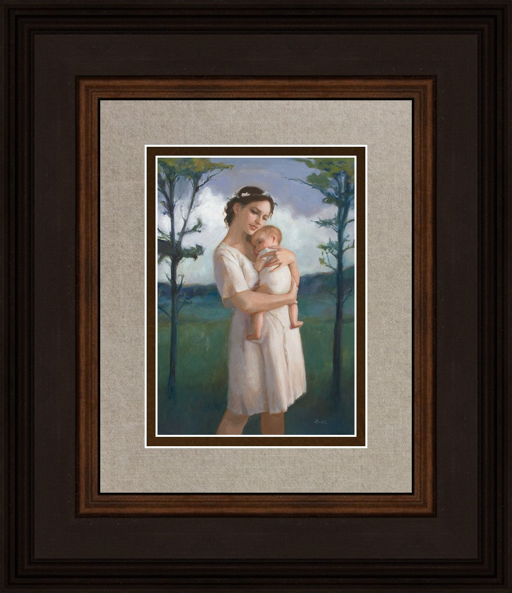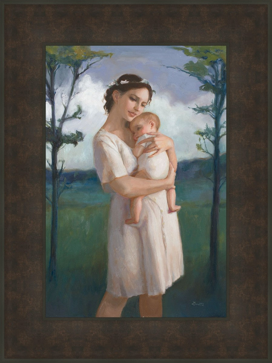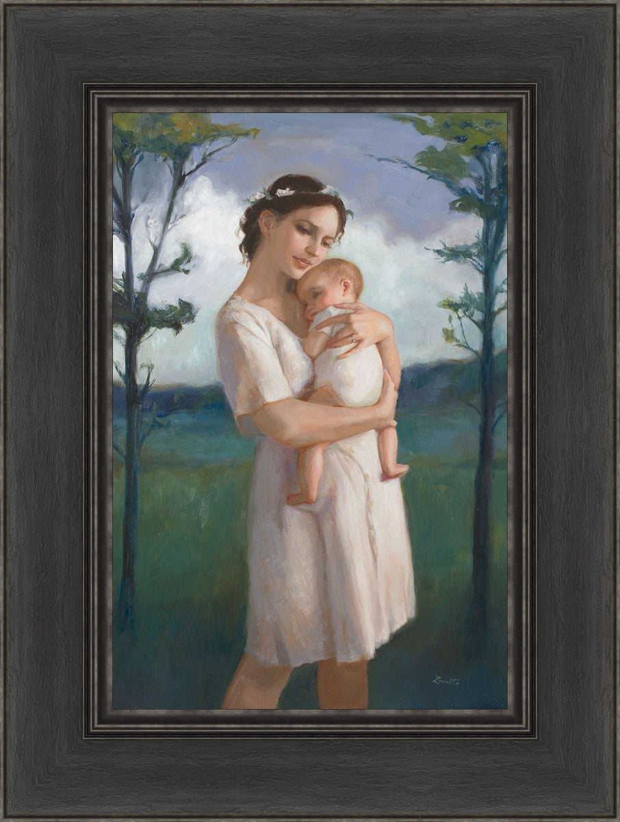 My first two children died as babies and even now, years later, I find a lot of solace in painting a mother and baby. The blues in this piece, the tender pose, and soft give this artwork a somber and calm feeling.
