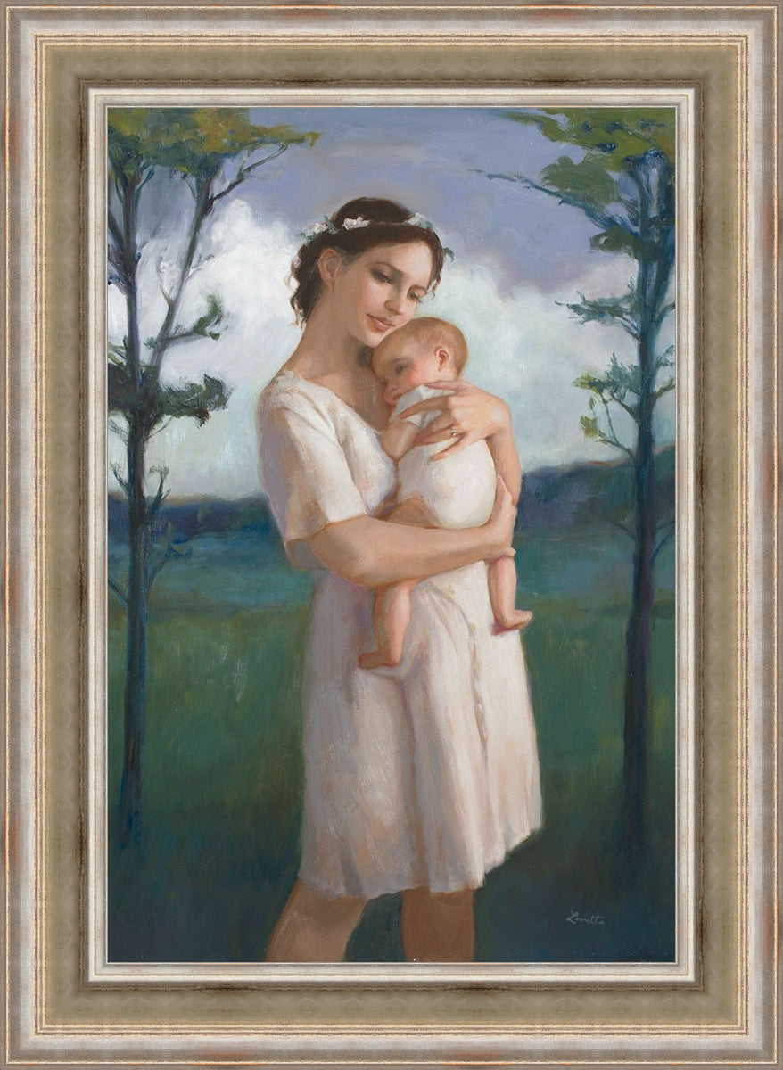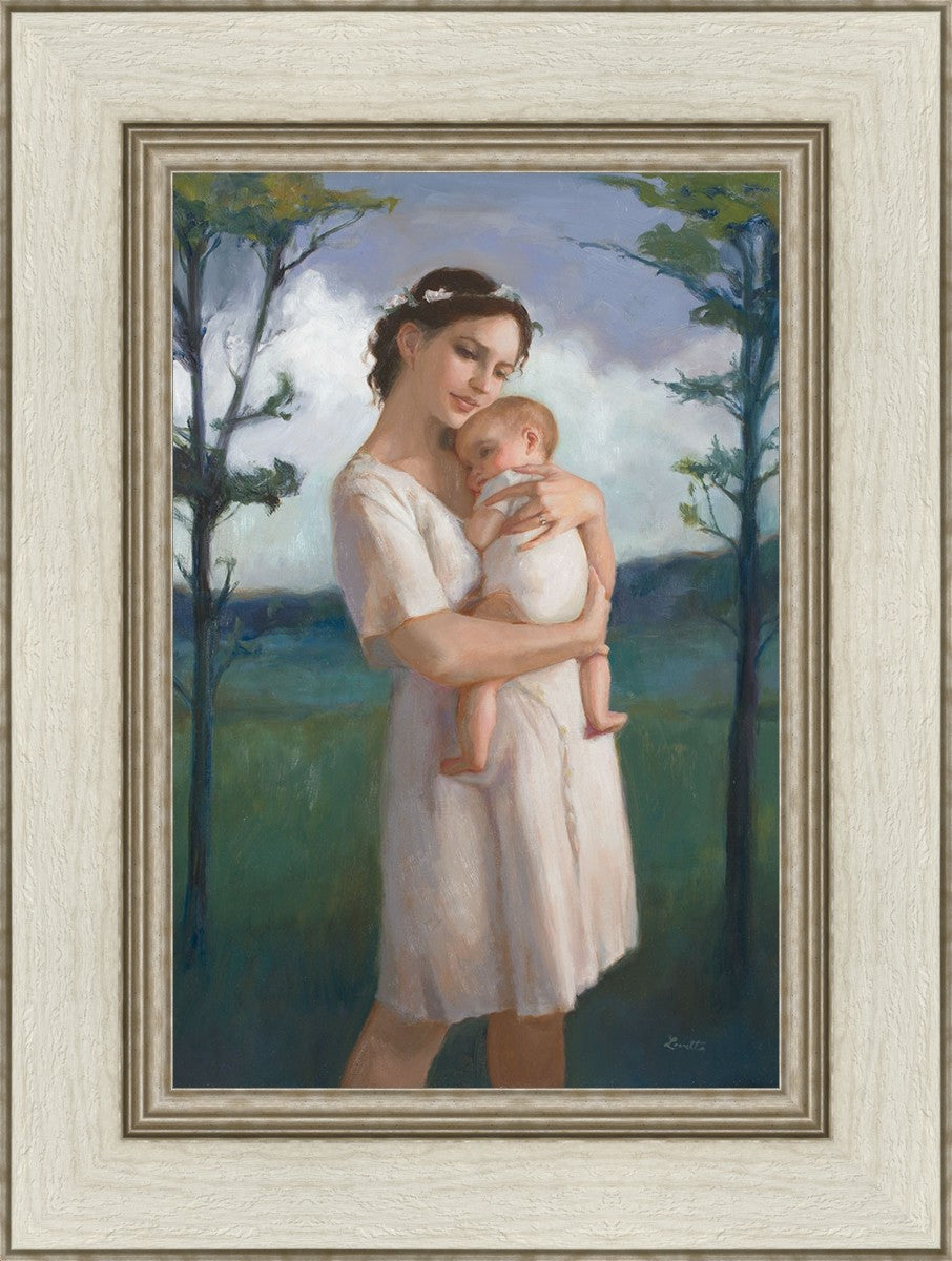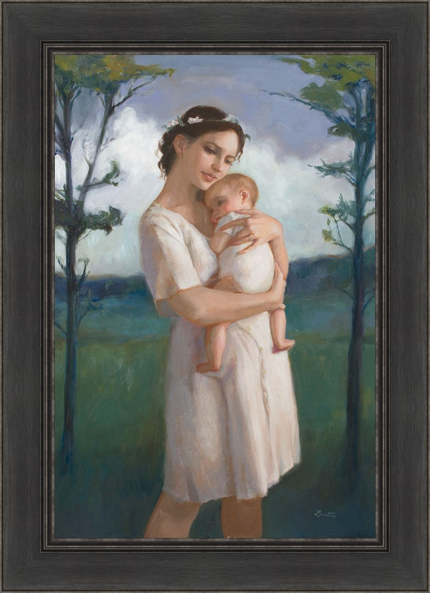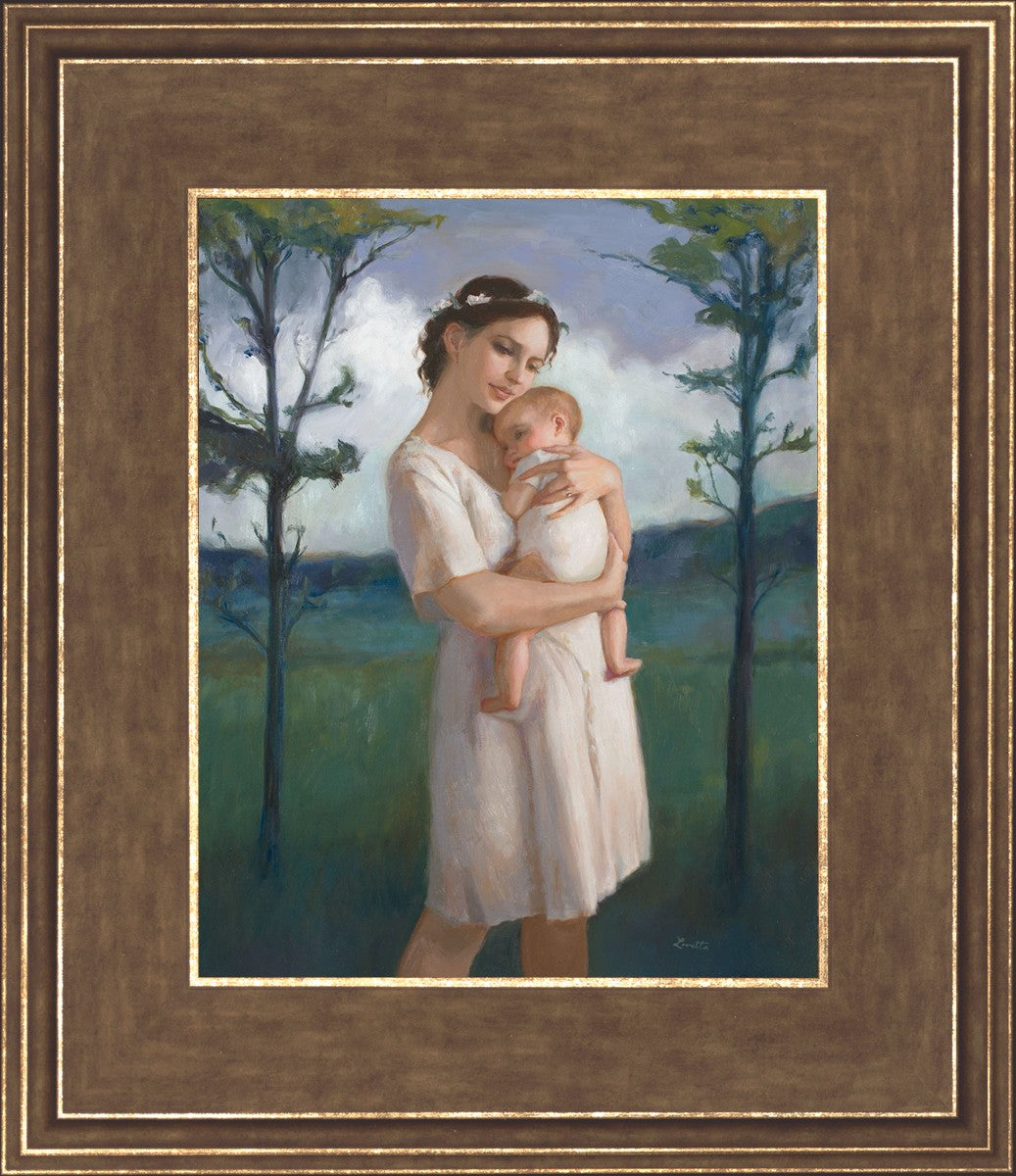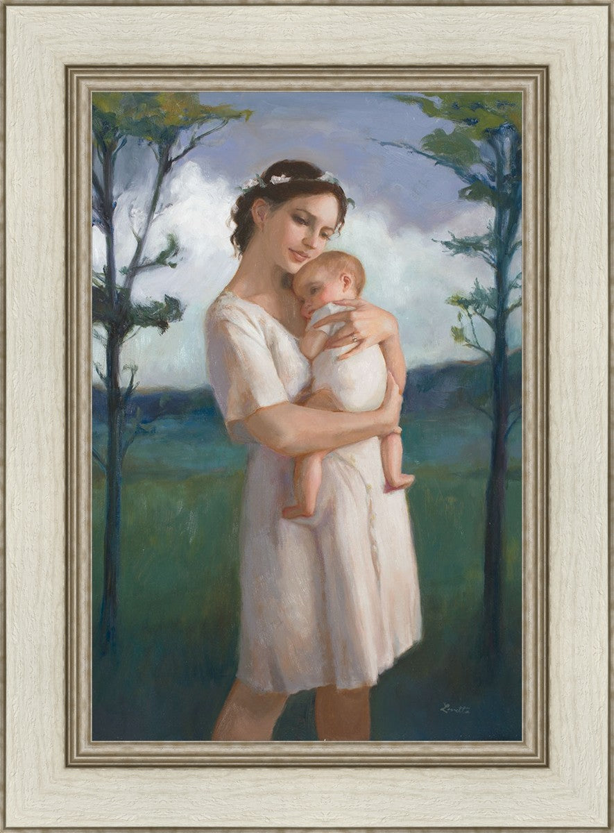 My first two children died as babies and even now, years later, I find a lot of solace in painting a mother and baby. The blues in this piece, the tender pose, and soft give this artwork a somber and calm feeling.
