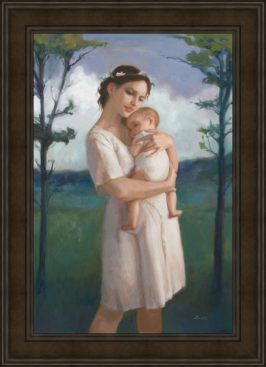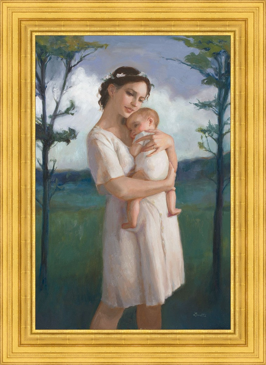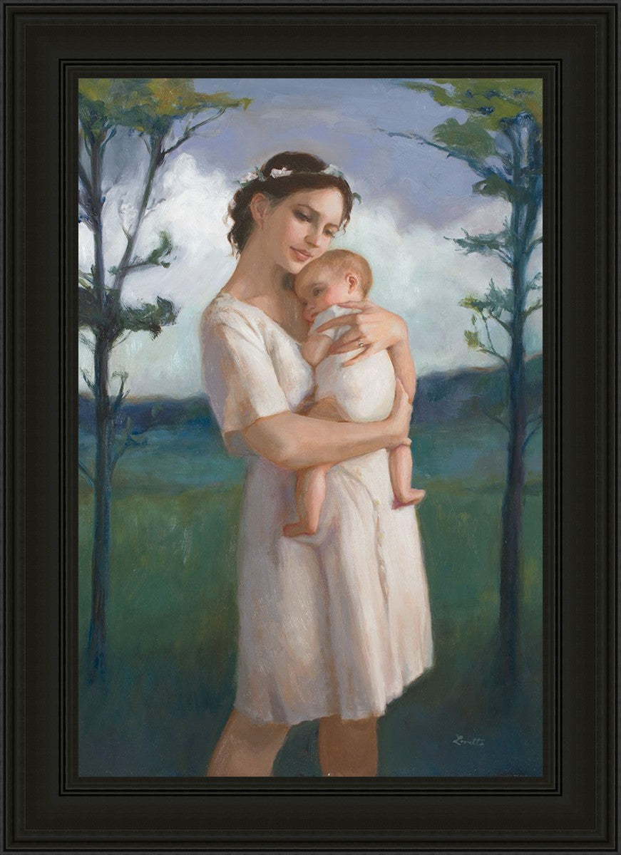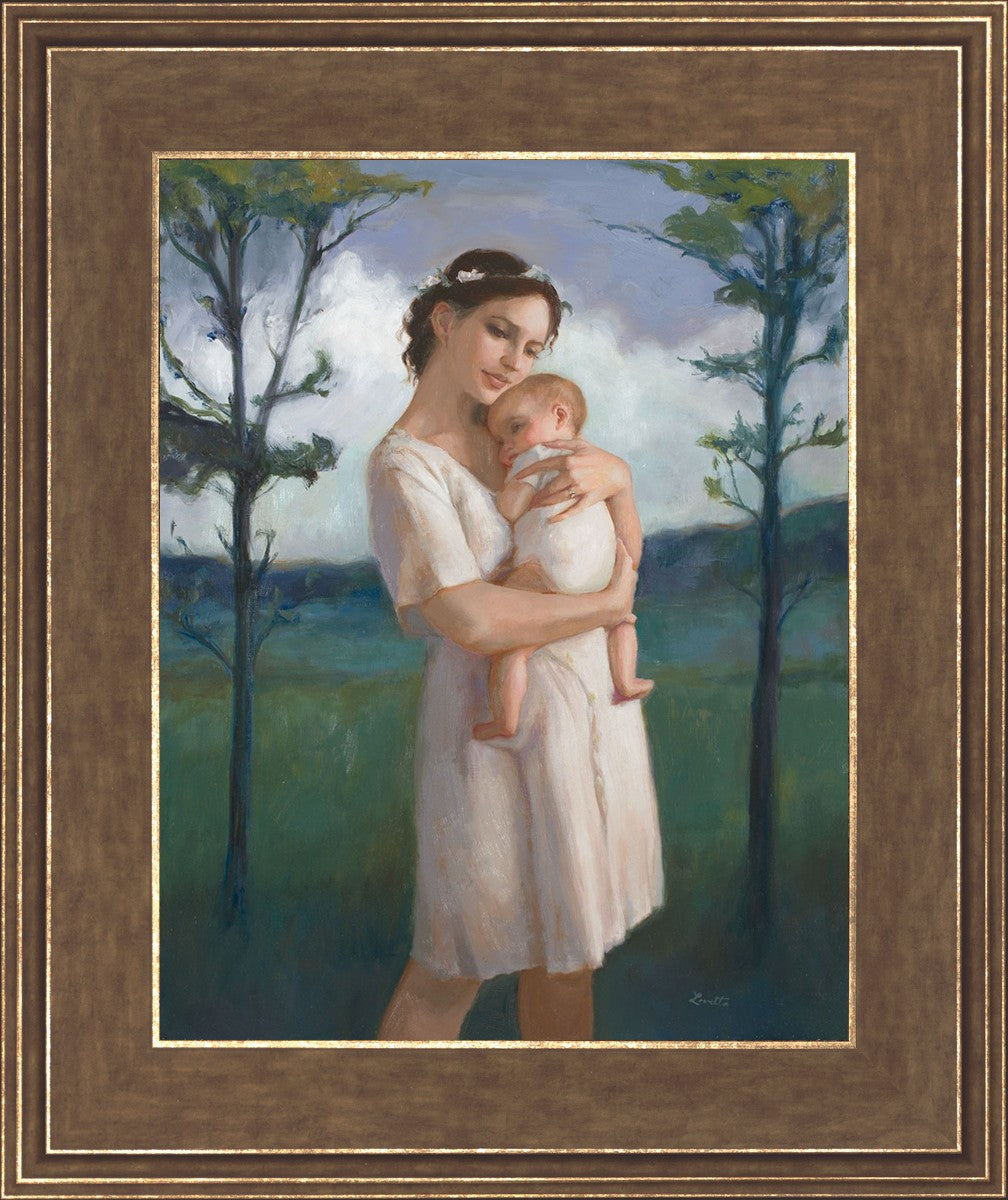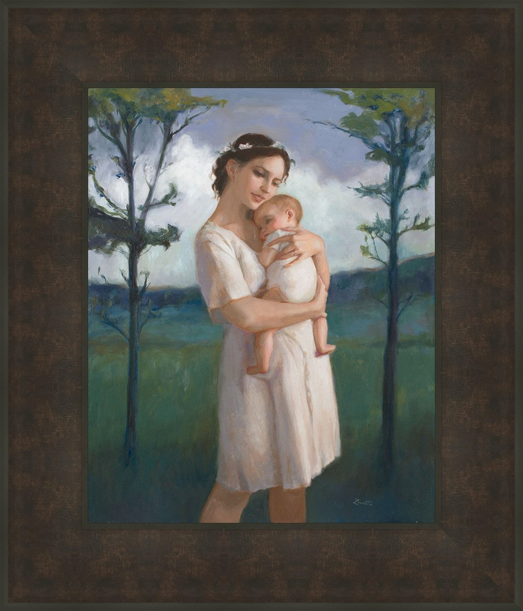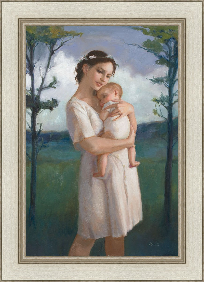 My first two children died as babies and even now, years later, I find a lot of solace in painting a mother and baby. The blues in this piece, the tender pose, and soft give this artwork a somber and calm feeling.