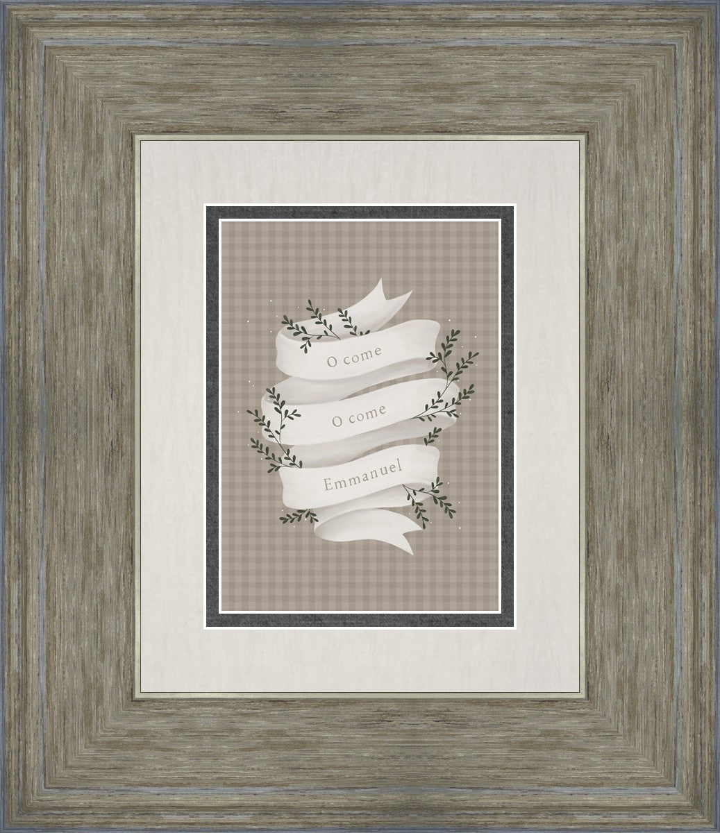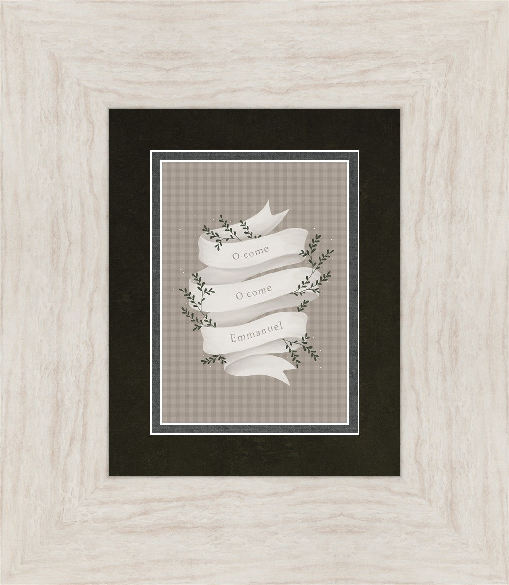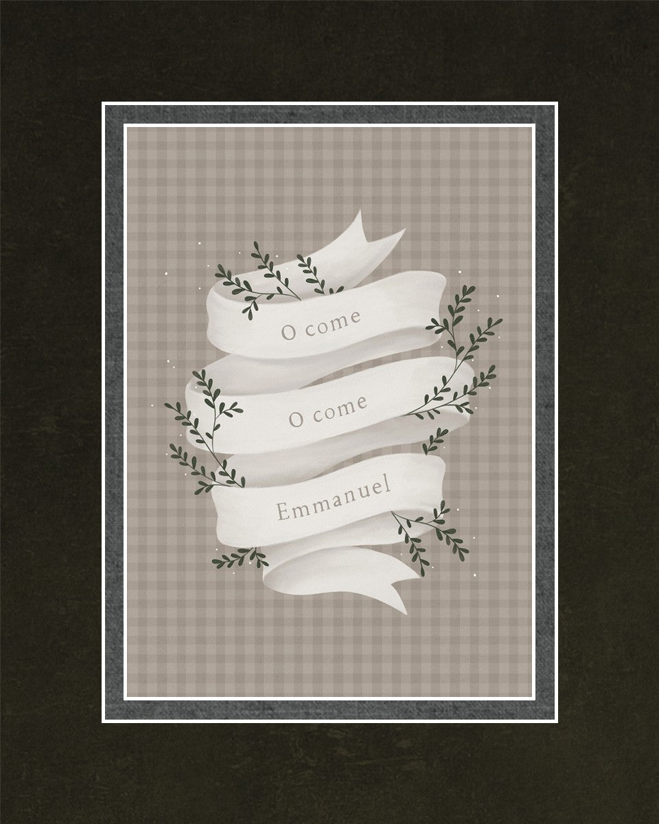 The Words O Come Emmanuel on a scroll against a tan checkerboard background.