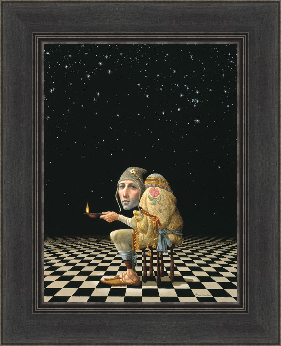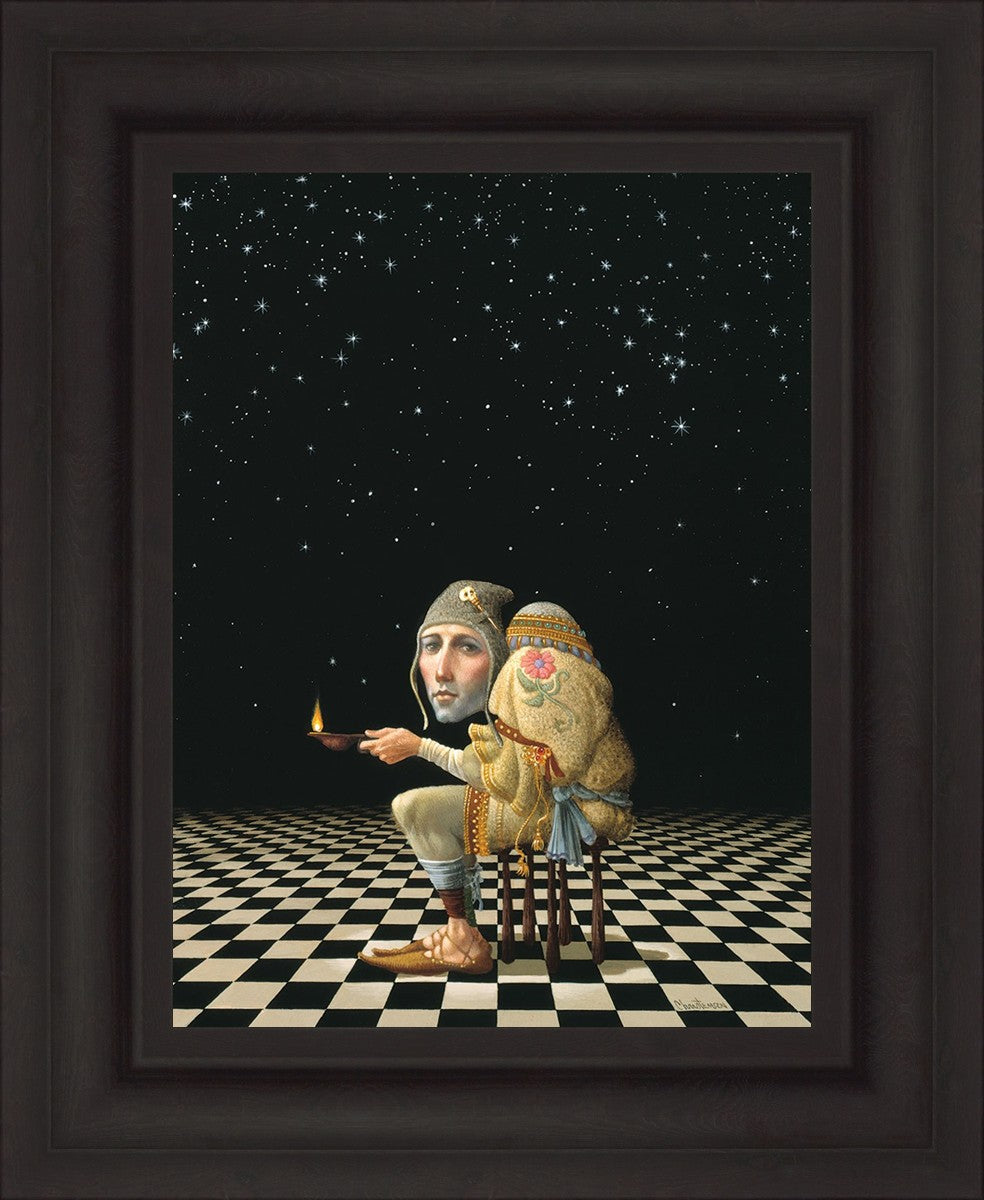 James’ Hunchback Everyman sits on a checkerboard that extends infinitely into the universe. The hunch is not a physical deformity, it is a symbol of the burdens we carry. The checkerboard is the playing field of life, night and day, good and bad, light and dark.This symbolism extends to the flower embroidered on his shoulder - Life, and The Skull pin on his hat - Death.