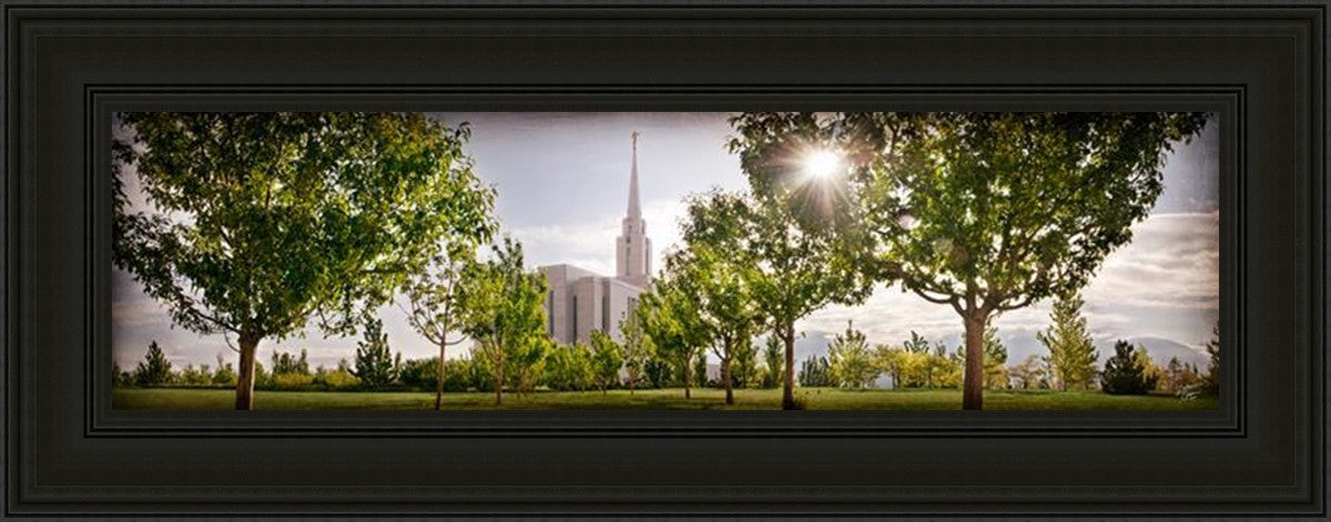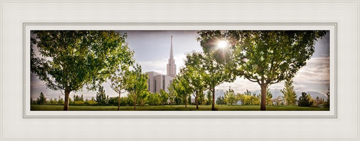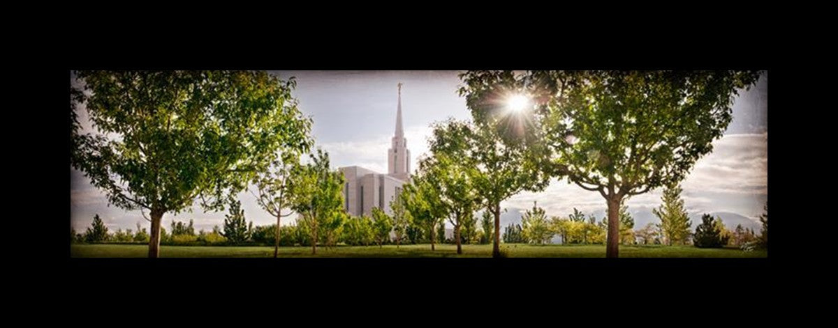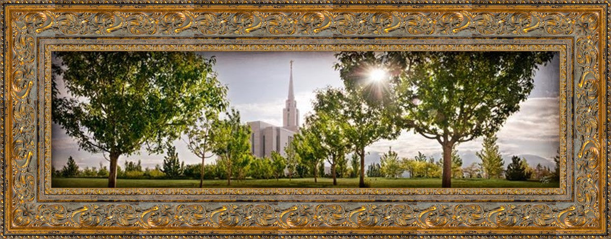 Since 1999 Landon has worked as an artisan in nearly 40 temples doing the decorative paint and gold leaf. He continues to do so as well as wood repair and graining. He was married in 2001 to Jacey Thomas in the Manti Utah temple. When she couldn’t find an image of the temple that she liked enough to purchase for their home, he decided to take one himself. That desire to create something original and different inspired his current series of temple art. They are taken from a panoramic viewpoint and stylized with an artistic border that reflect his paintings. All modern structures apart from the temple have been omitted.