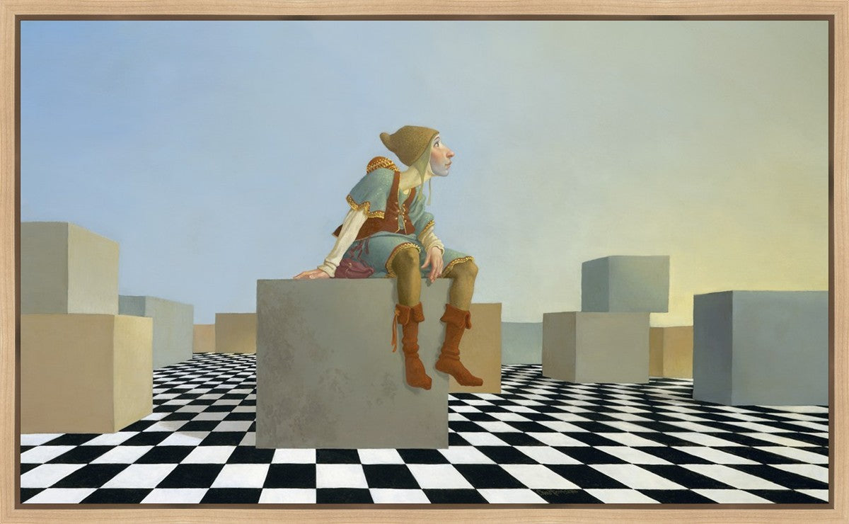 This hunchback “Everyman” of James C. Christensen’s symbology is not only thinking outside the box, he is outside of his box. He’s arrived, and if he had any trouble getting here, it’s behind him now. It’s like getting up very early in the morning, before everyone else, and taking that quiet time to reflect. It’s a perfect moment, sitting on the checkered game board of life, and contemplating a cloudless future. In a couple of hours he may be joined by others, or maybe not, but for now the sky’s the limit, the air smells great, and the possibilities are endless.