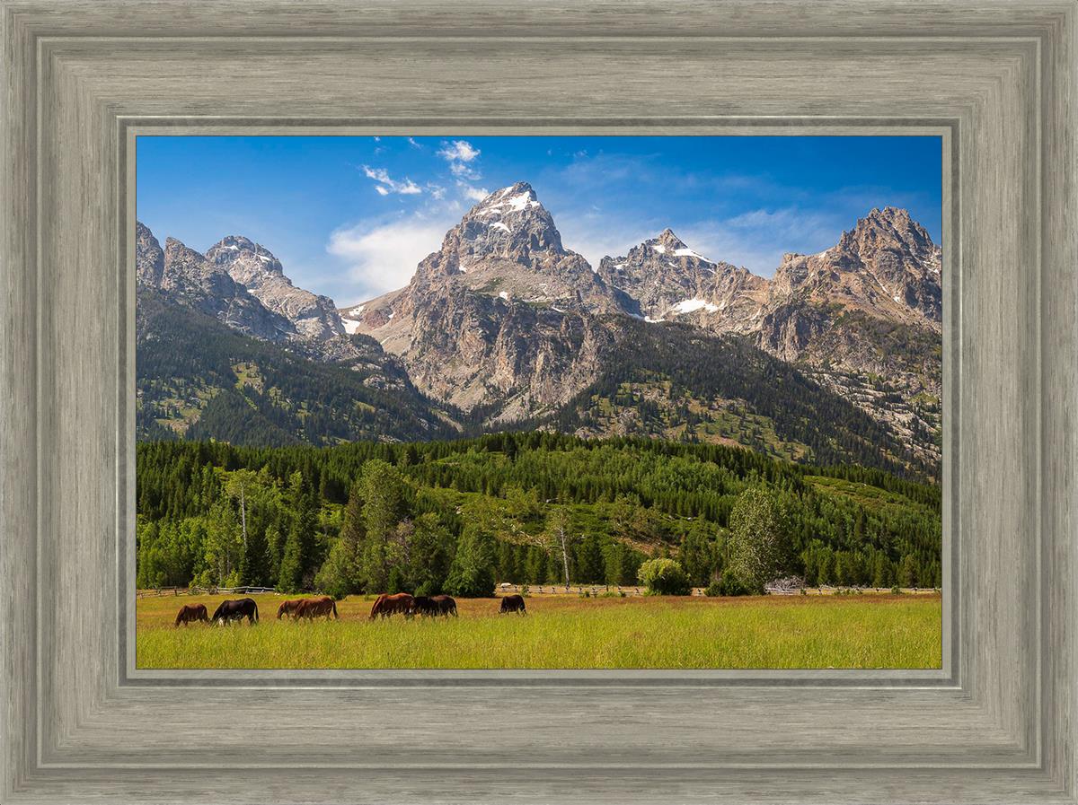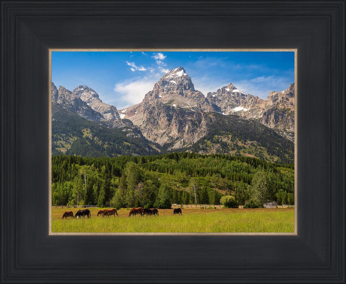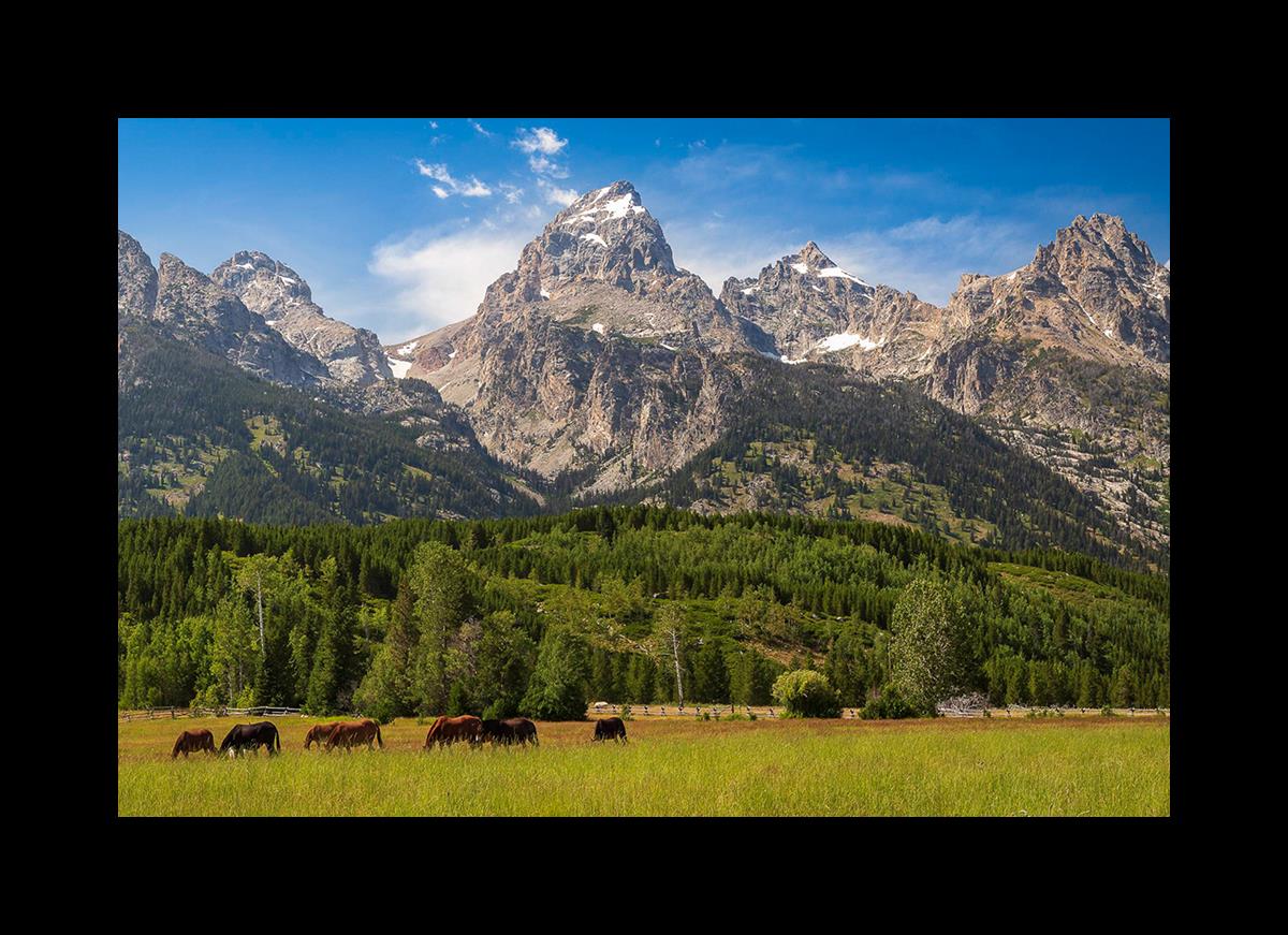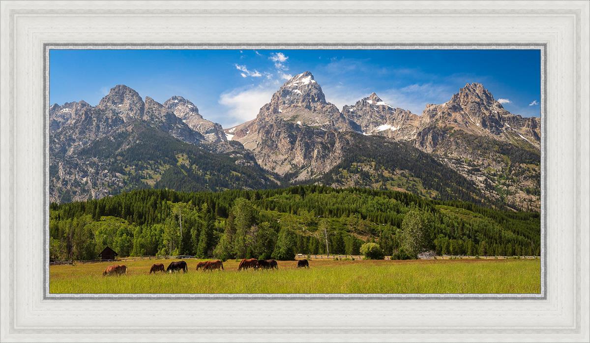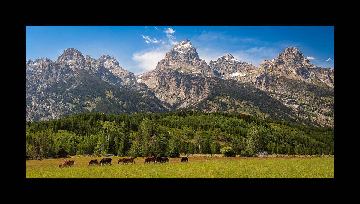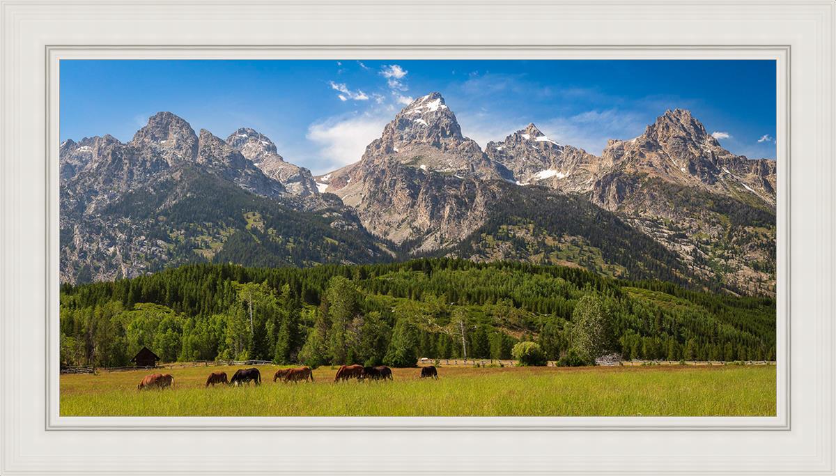 This panoramic view of the magnificent Grand Teton Mountain Range with horses in the foreground is the traditional symbol of the American West. This photograph looks best when printed wide in panorama format