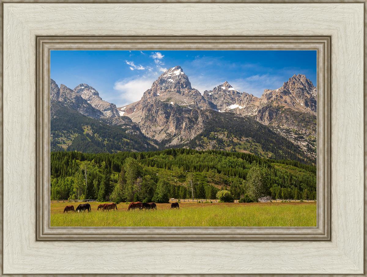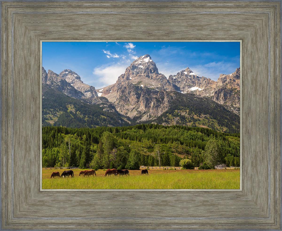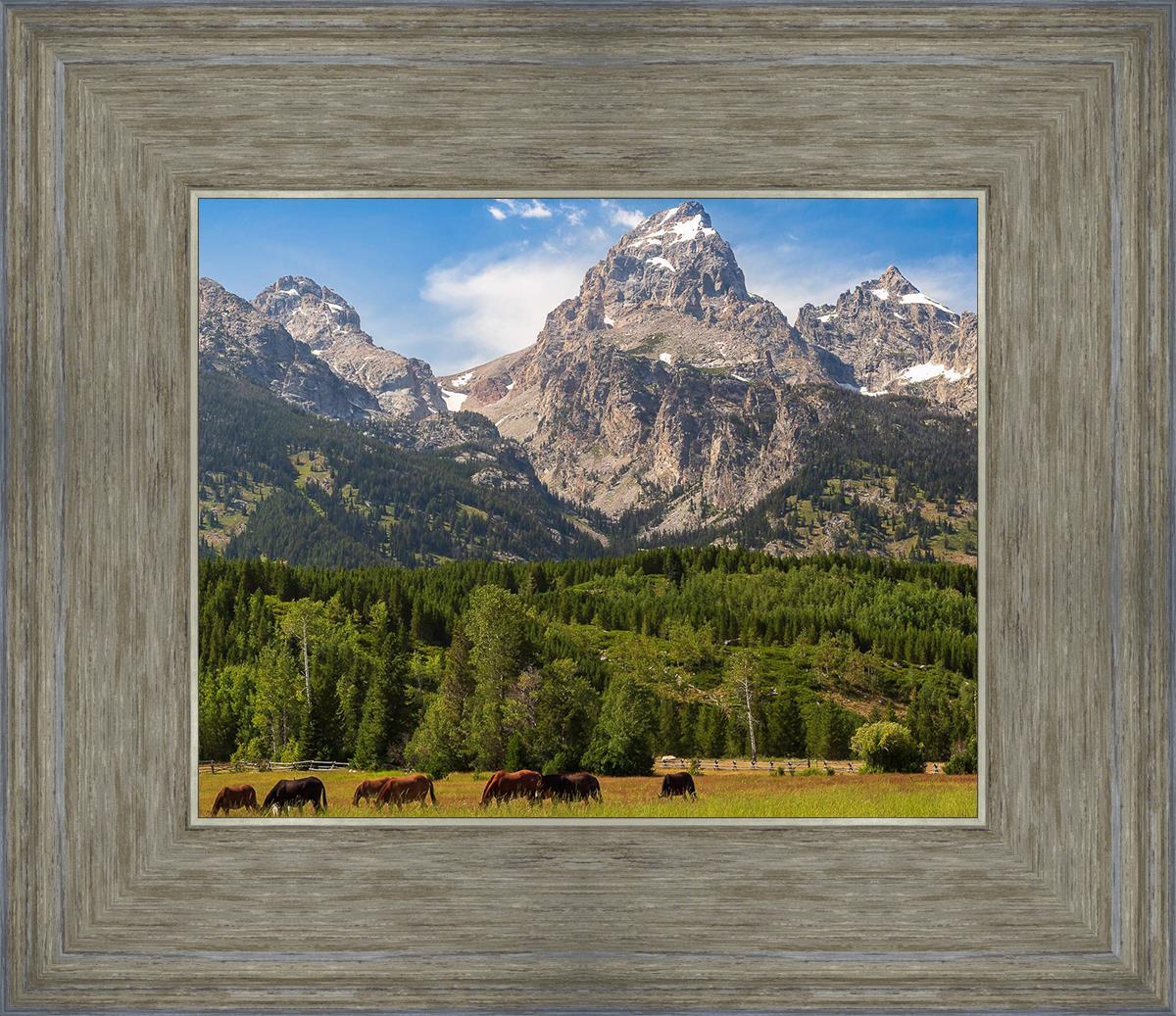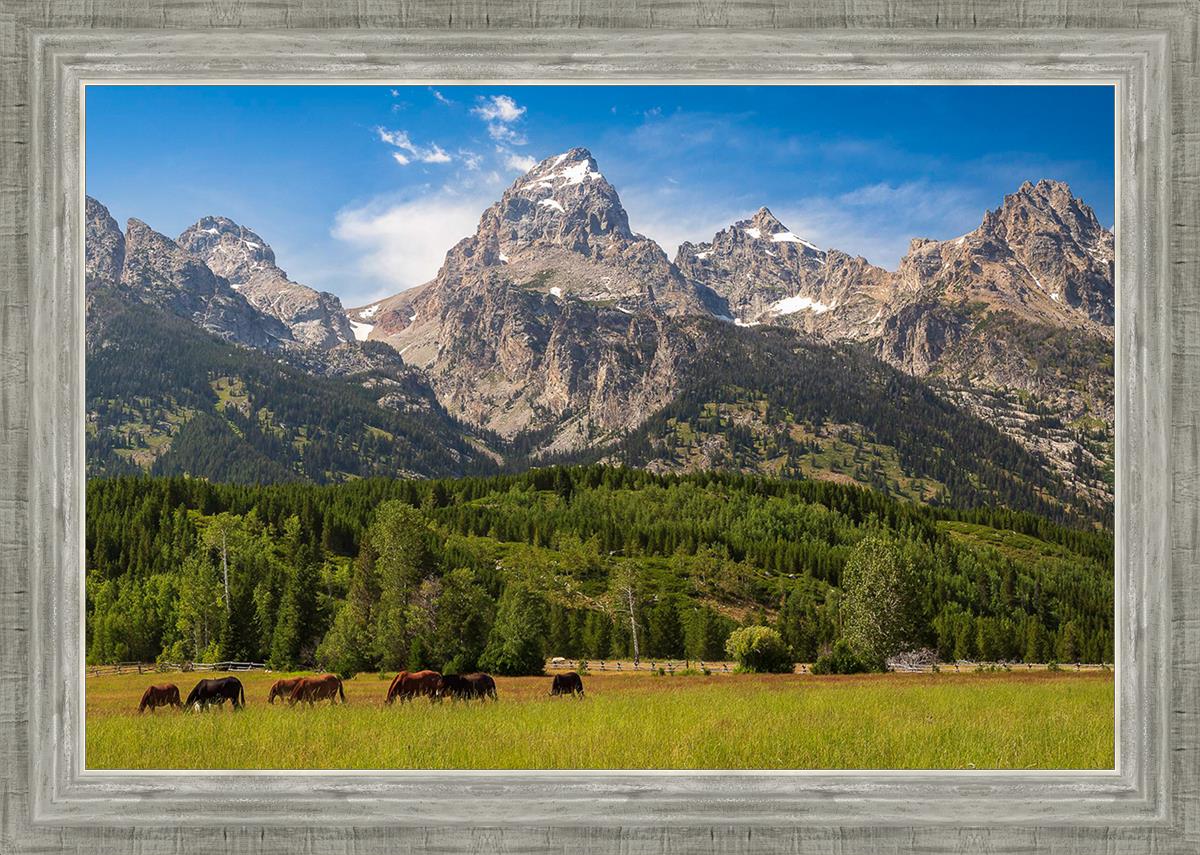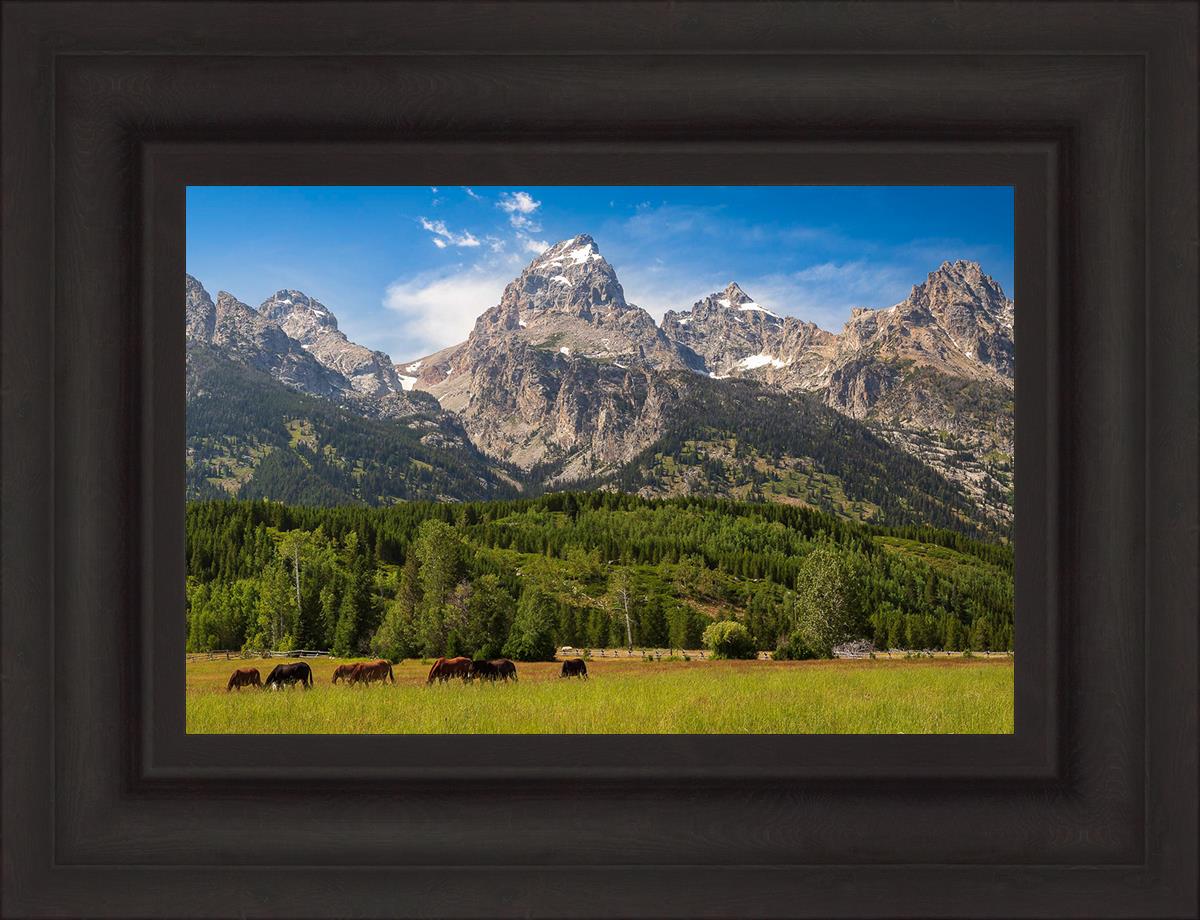 This panoramic view of the magnificent Grand Teton Mountain Range with horses in the foreground is the traditional symbol of the American West. This photograph looks best when printed wide in panorama format