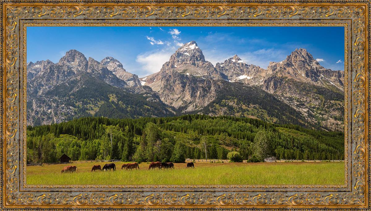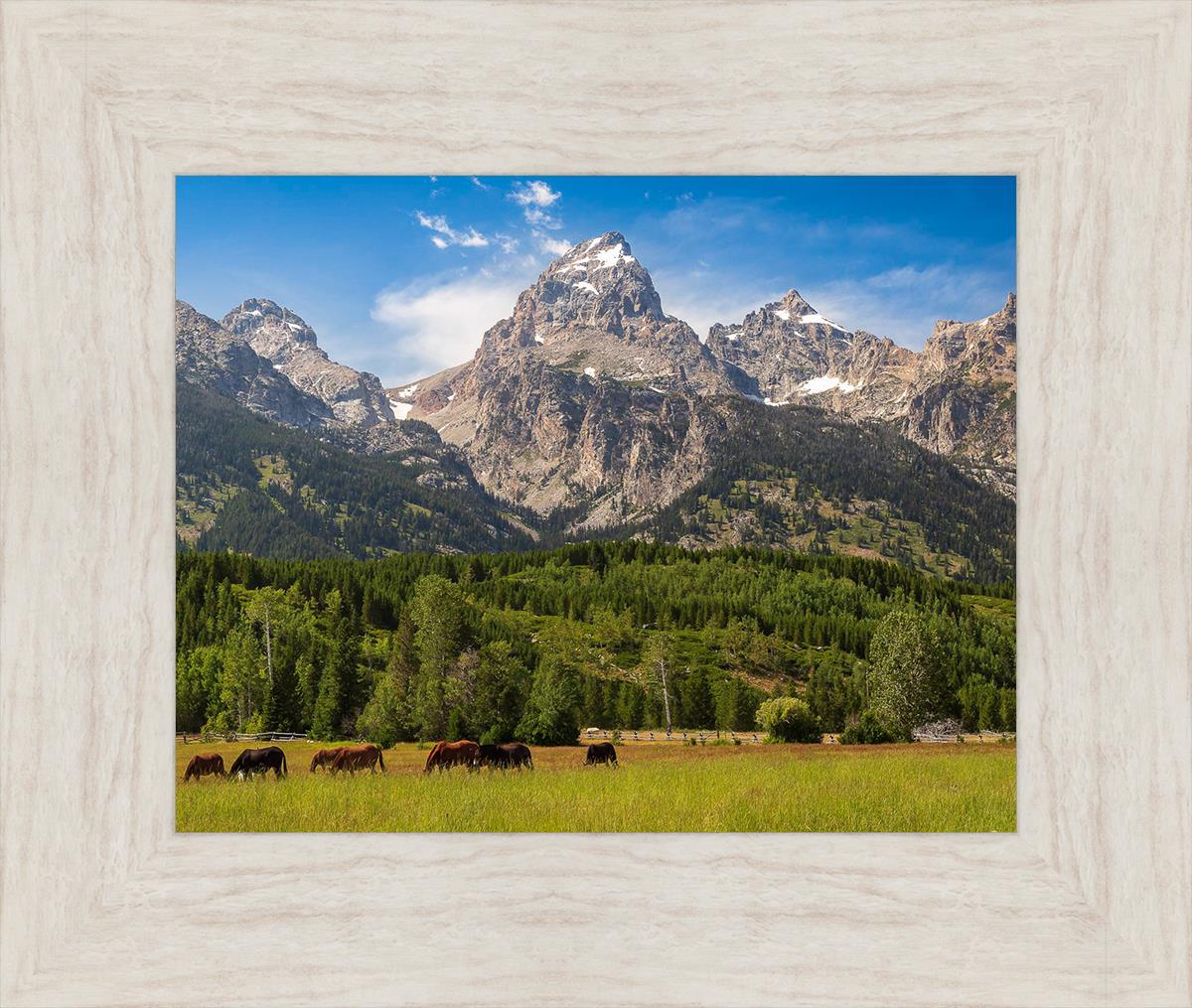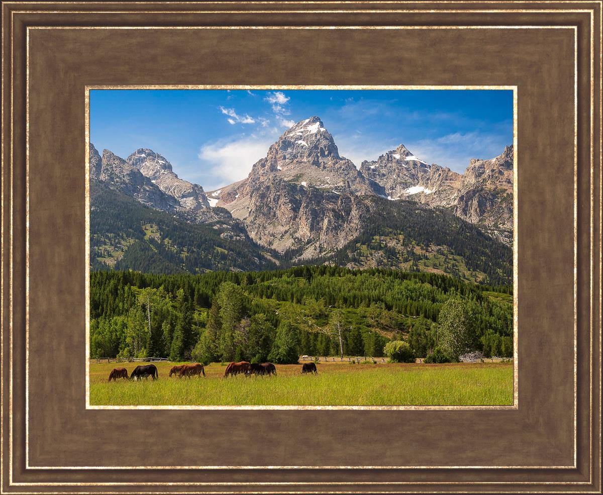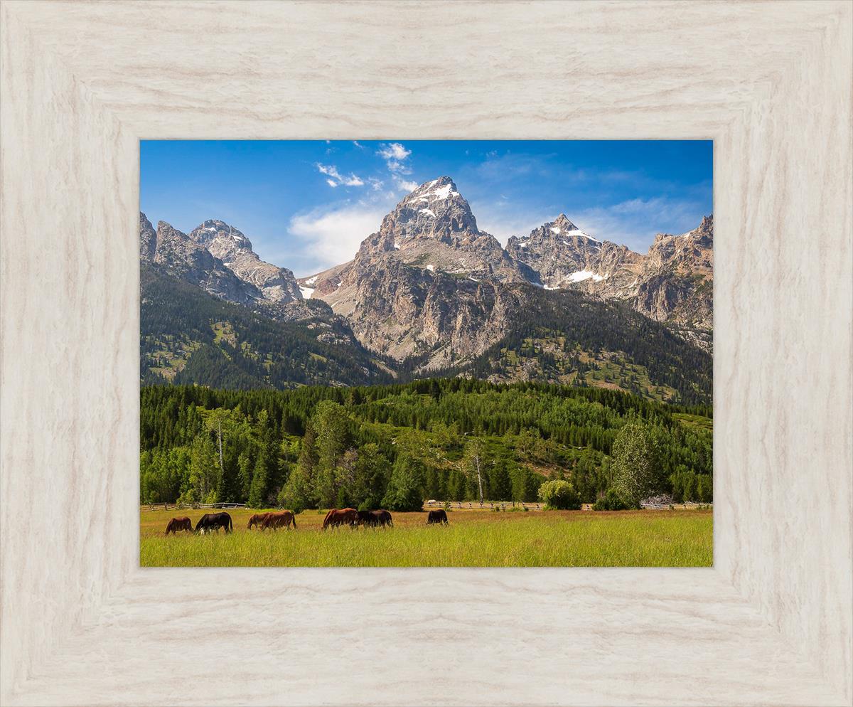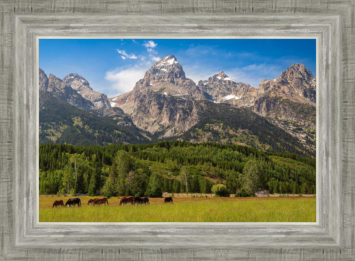 This panoramic view of the magnificent Grand Teton Mountain Range with horses in the foreground is the traditional symbol of the American West. This photograph looks best when printed wide in panorama format