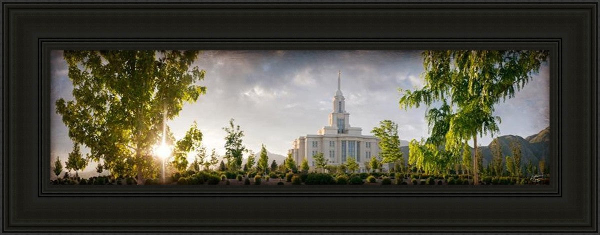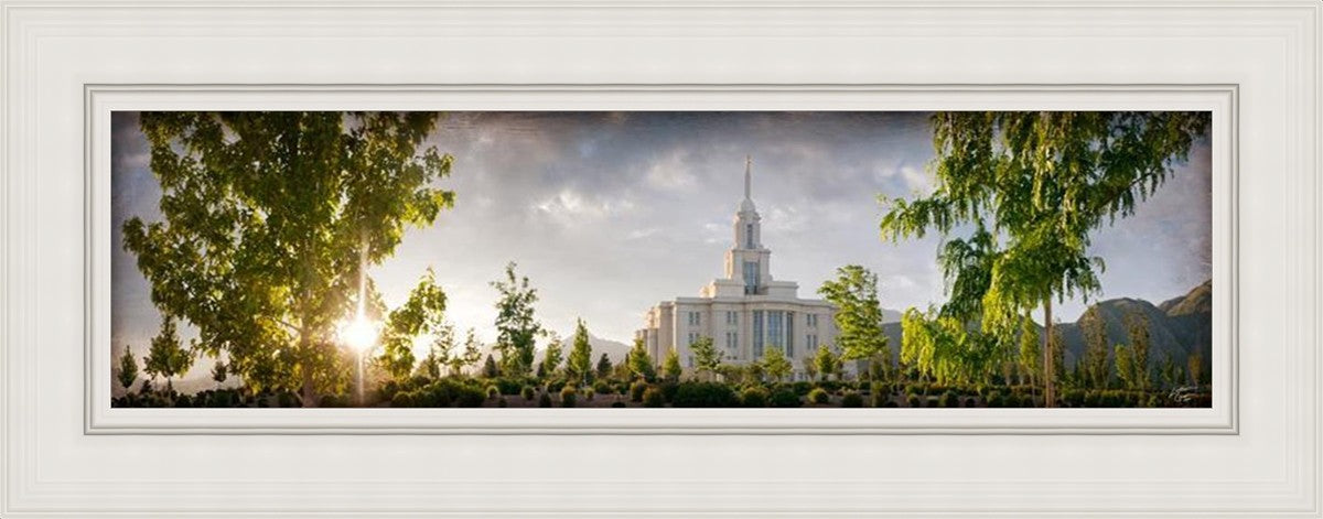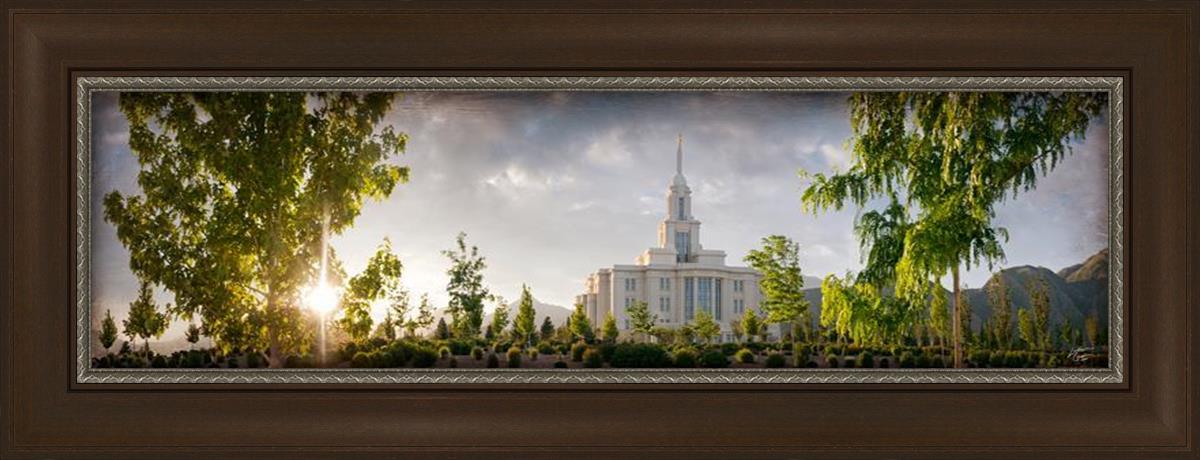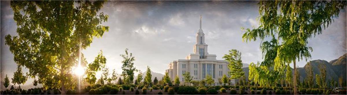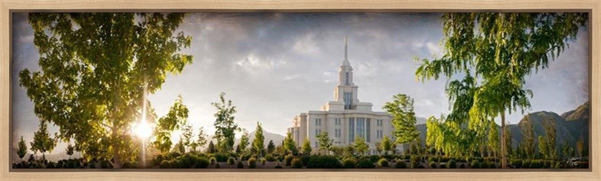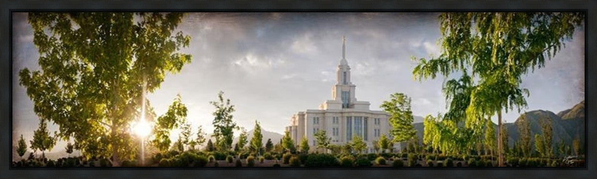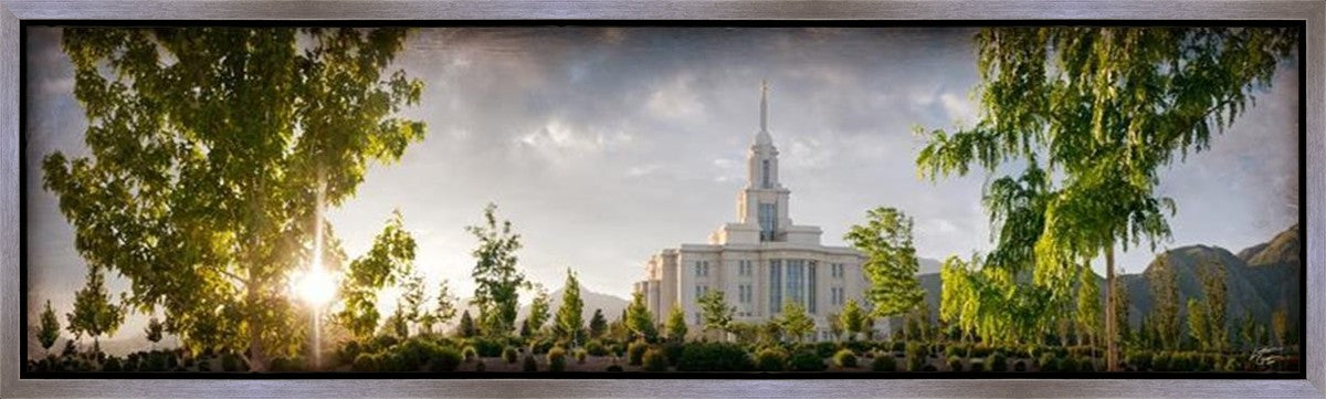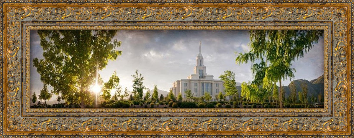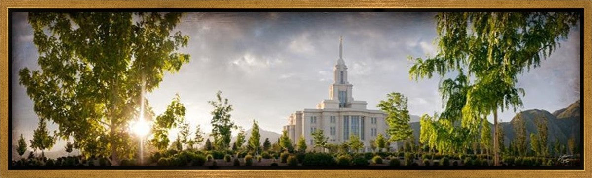 Since 1999 Landon has worked as an artisan in nearly 40 temples doing the decorative paint and gold leaf. He continues to do so as well as wood repair and graining. He was married in 2001 to Jacey Thomas in the Manti Utah temple. When she couldn’t find an image of the temple that she liked enough to purchase for their home, he decided to take one himself. That desire to create something original and different inspired his current series of temple art. They are taken from a panoramic viewpoint and stylized with an artistic border that reflect his paintings. All modern structures apart from the temple have been omitted.