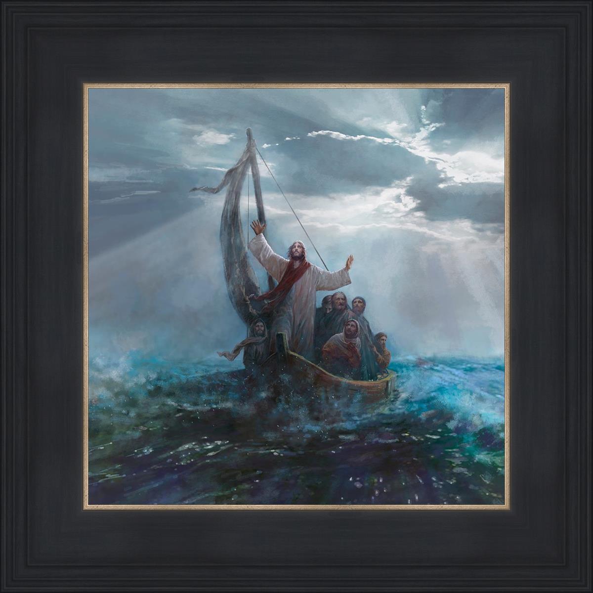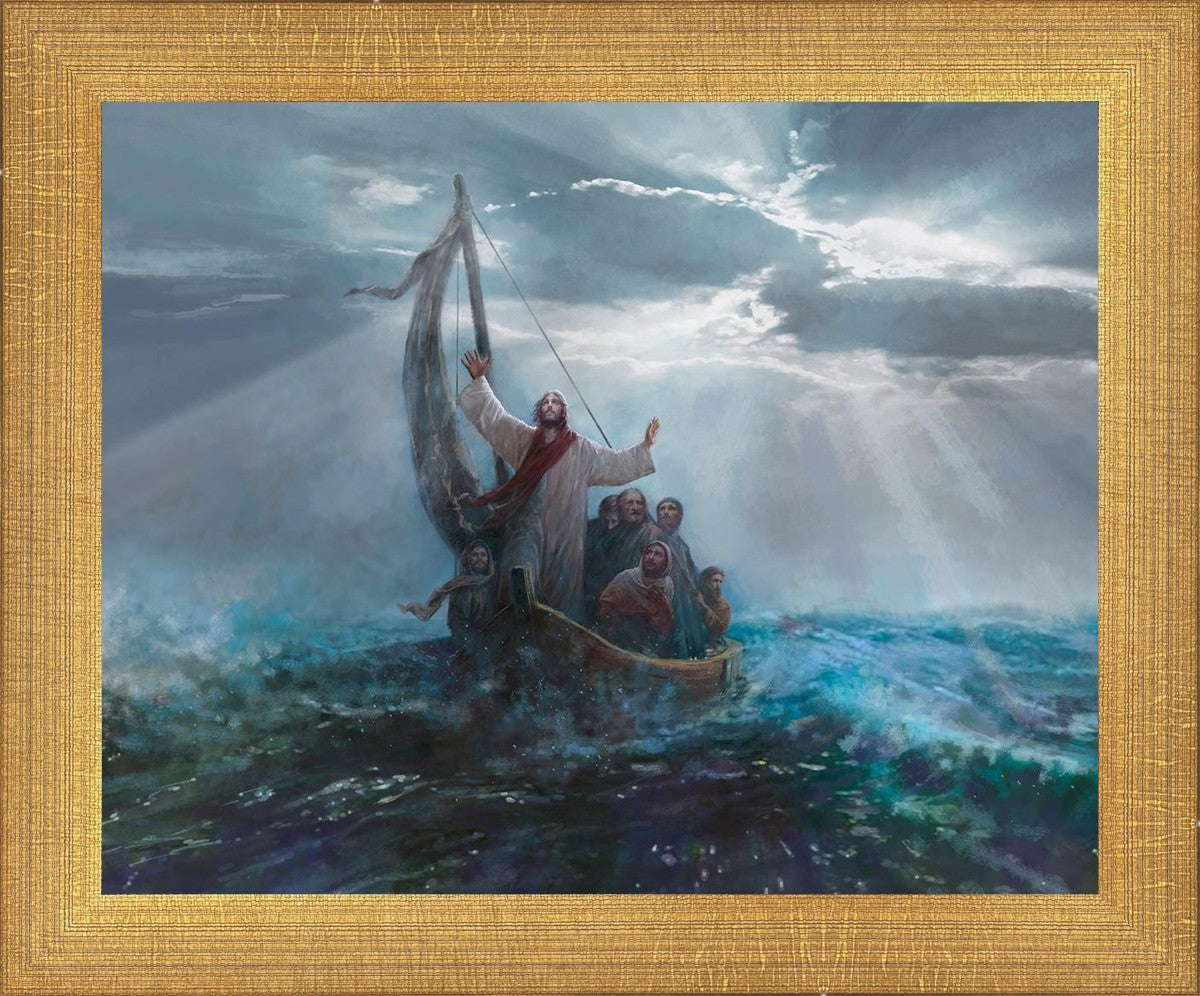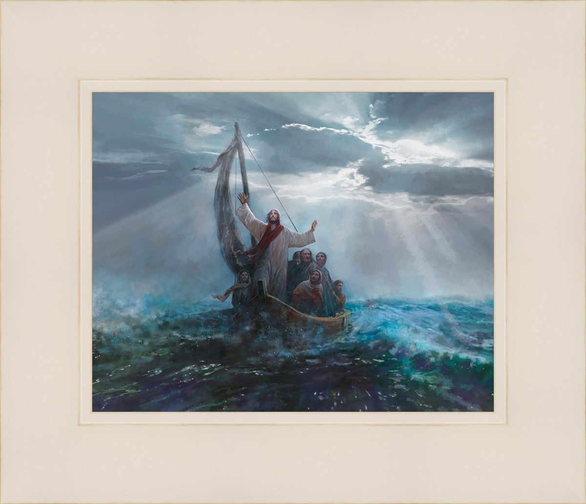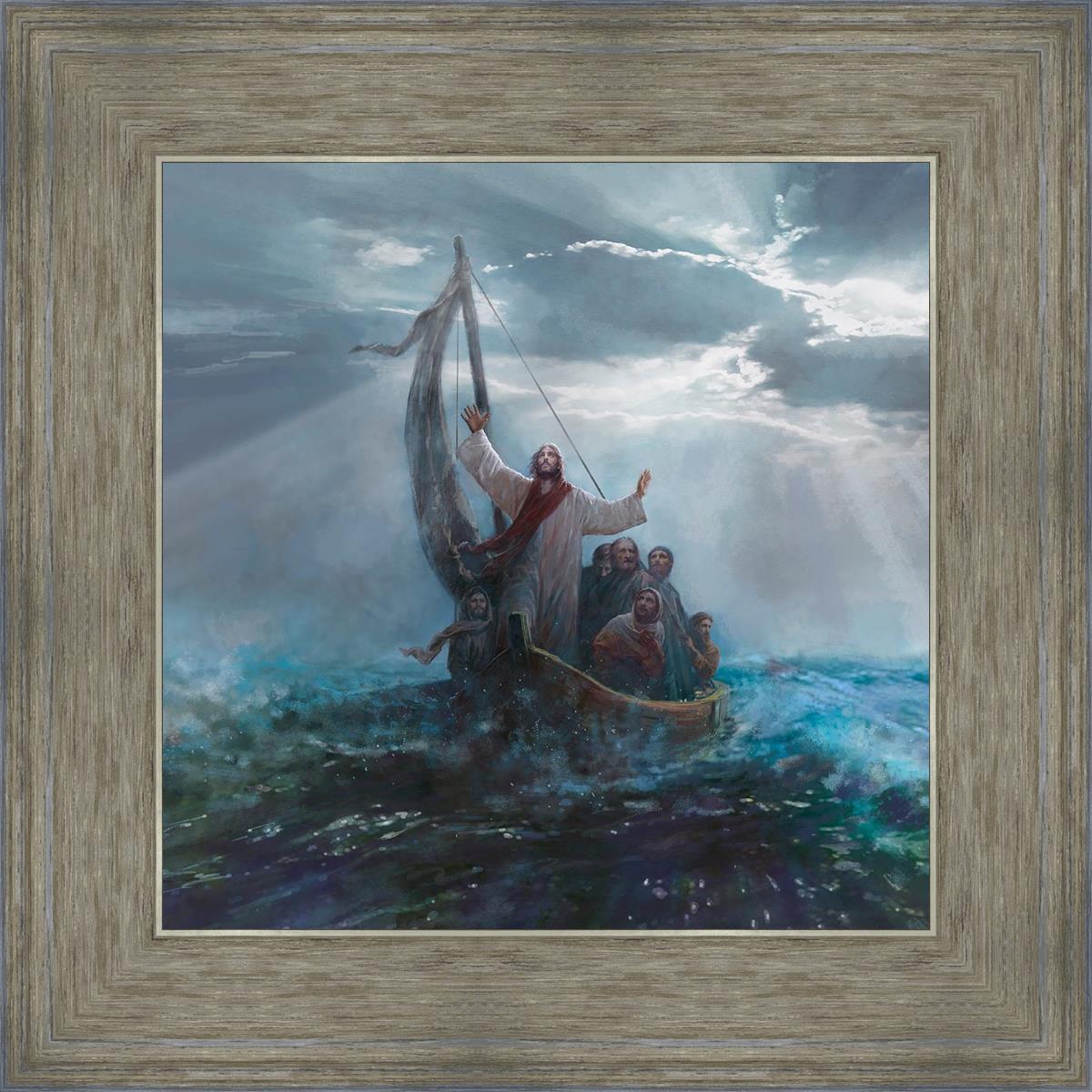 "Peace Be Still" by Yongsung Kim is a powerful painting depicting Jesus on a boat in the midst of a storm, emanating peace and calm.