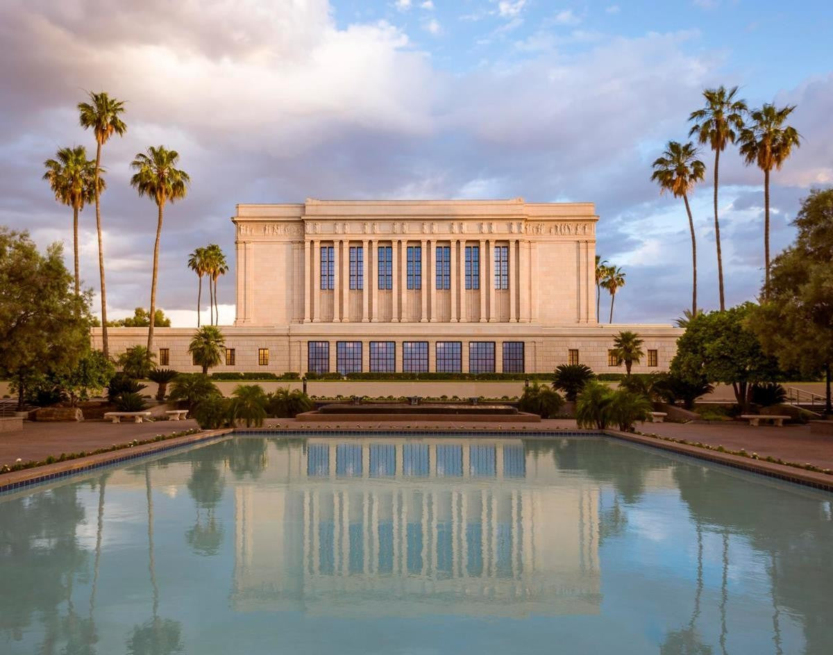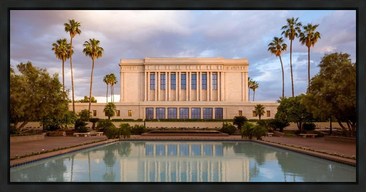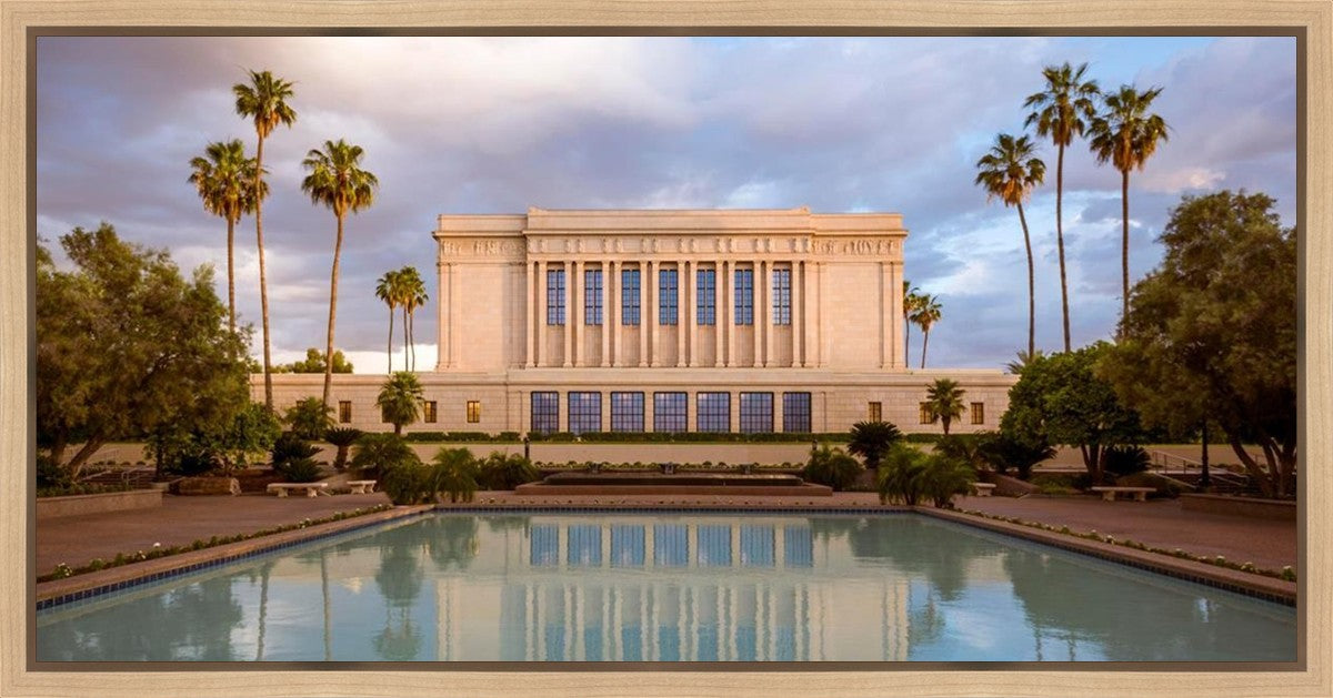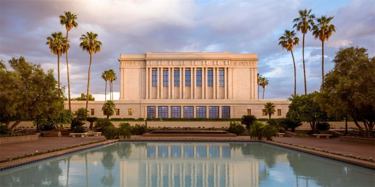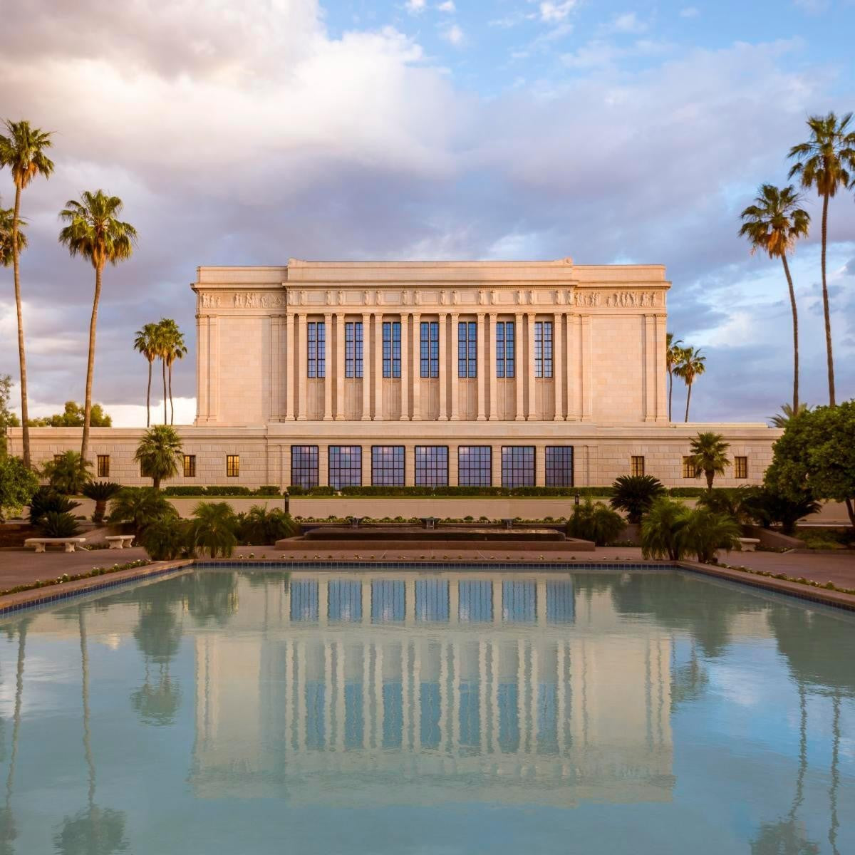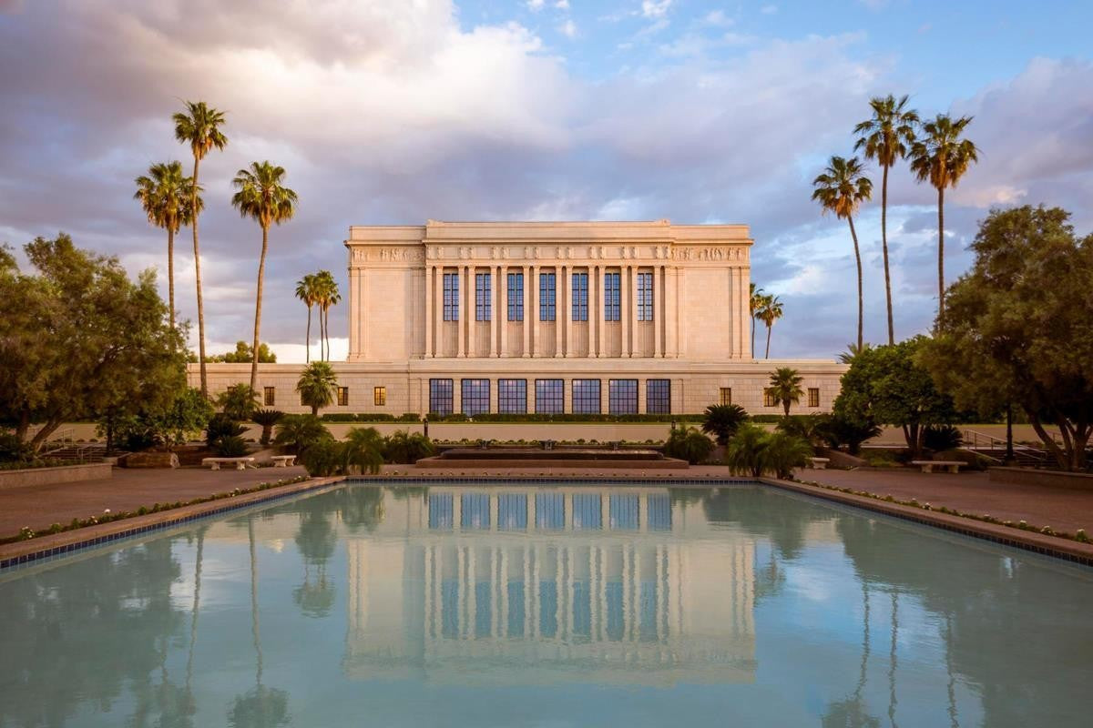 A peaceful garden view of the Mesa, Arizona temple at sunset