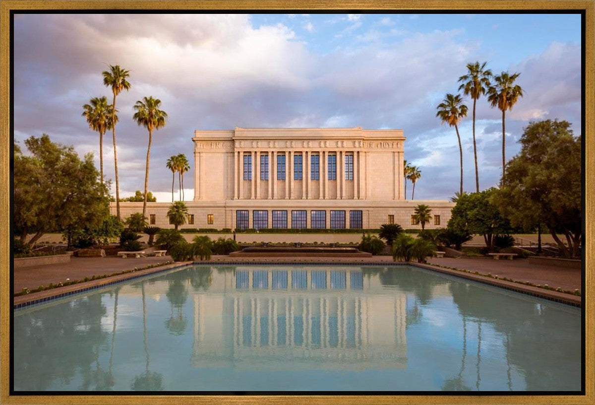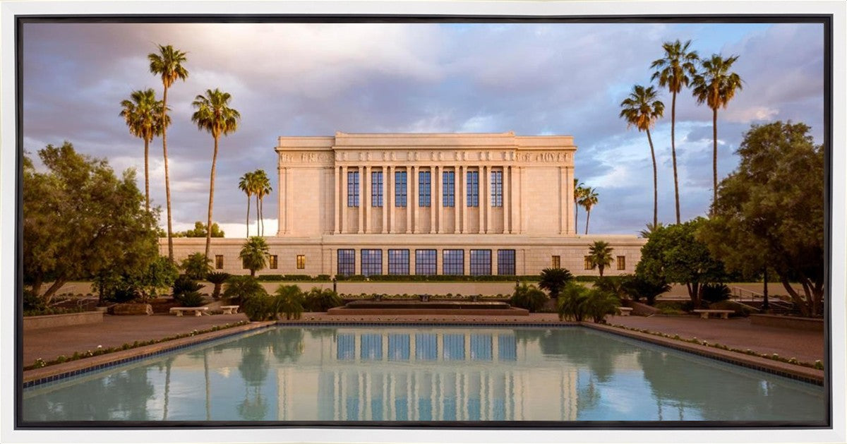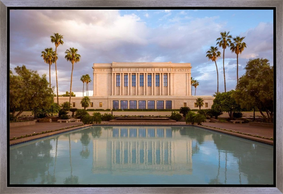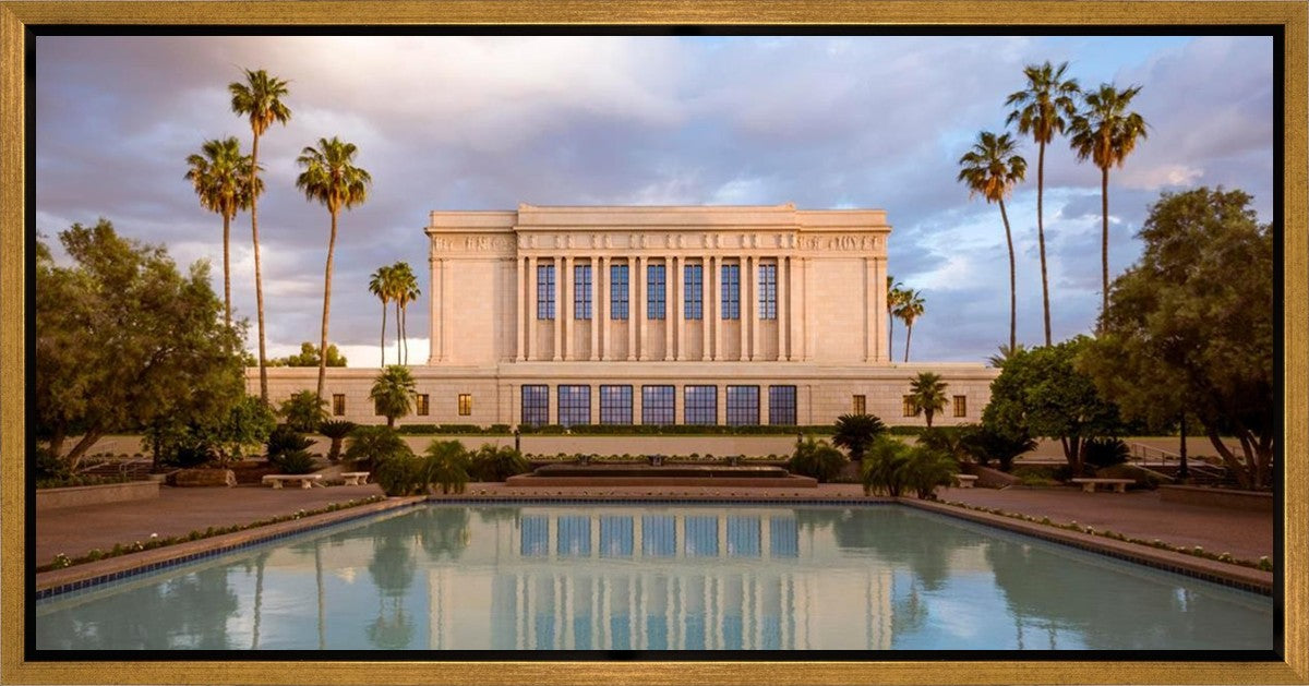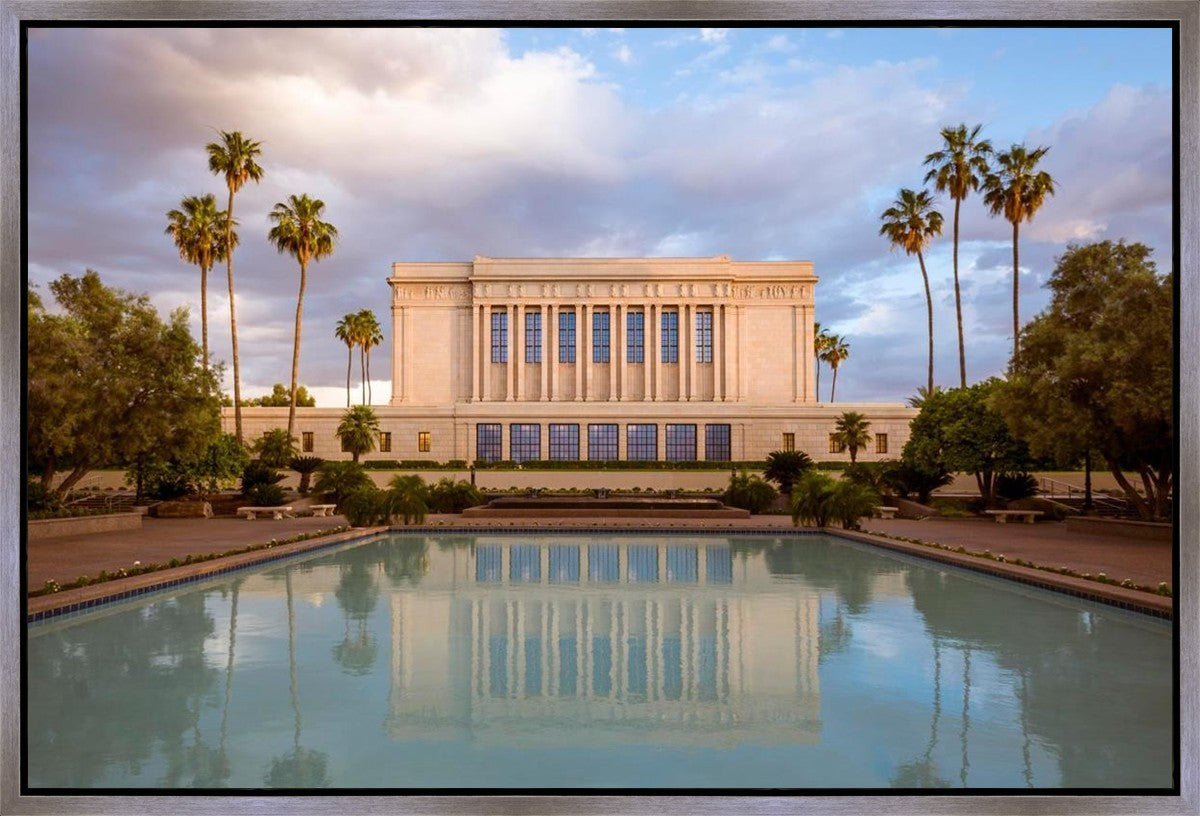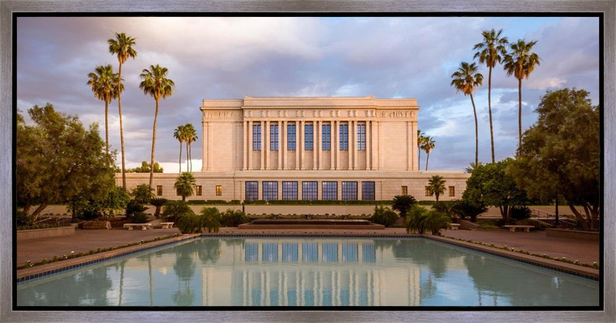A peaceful garden view of the Mesa, Arizona temple at sunset