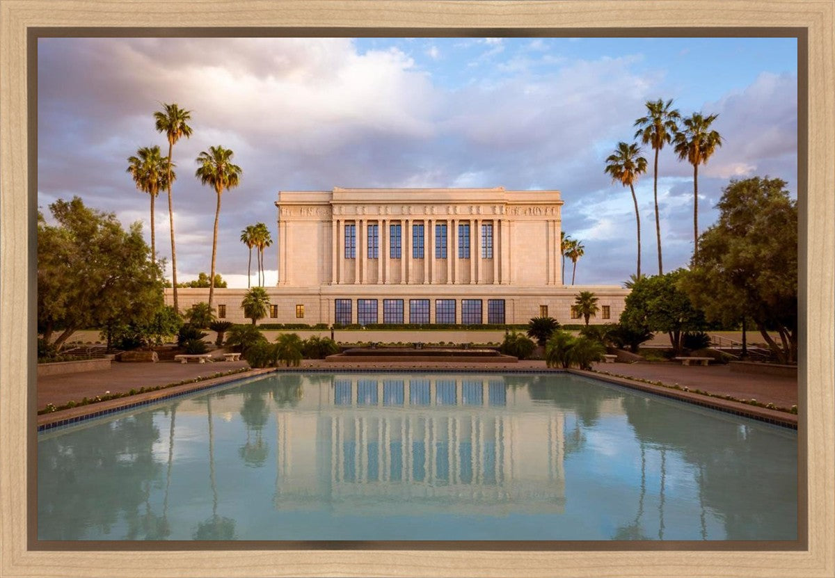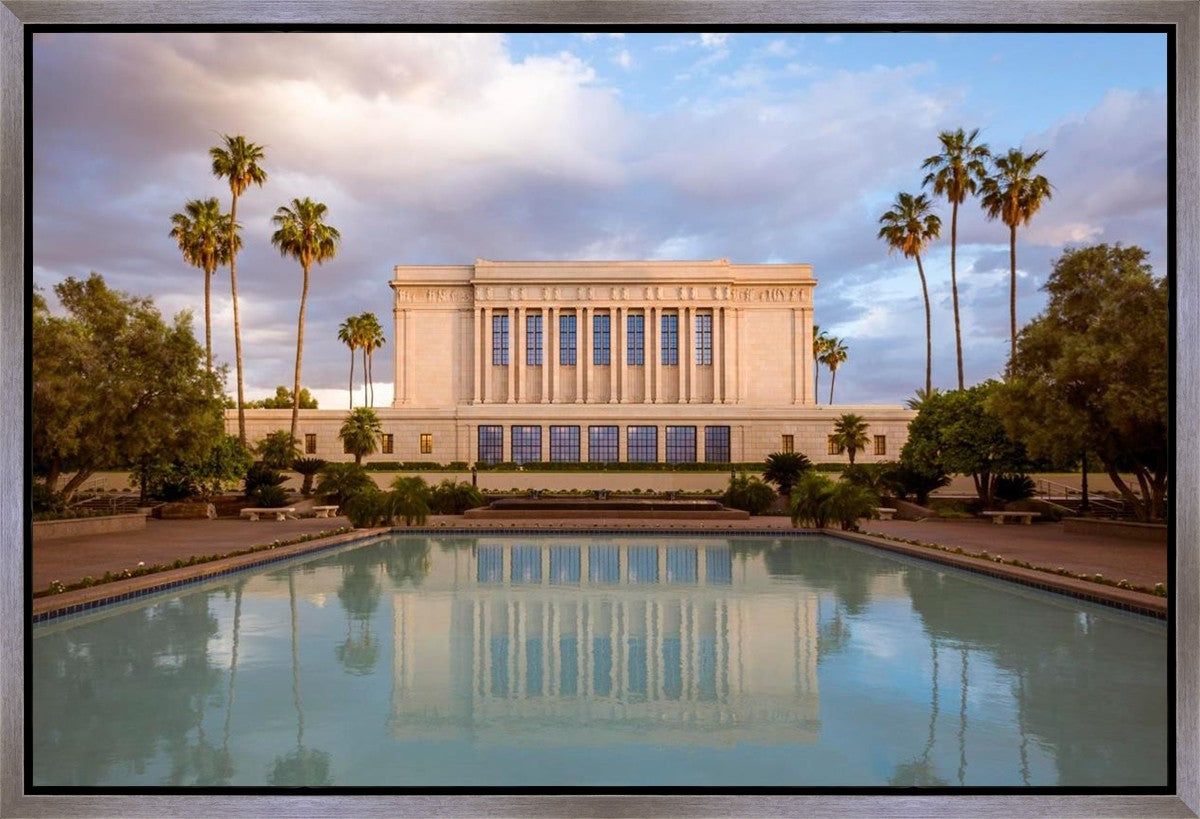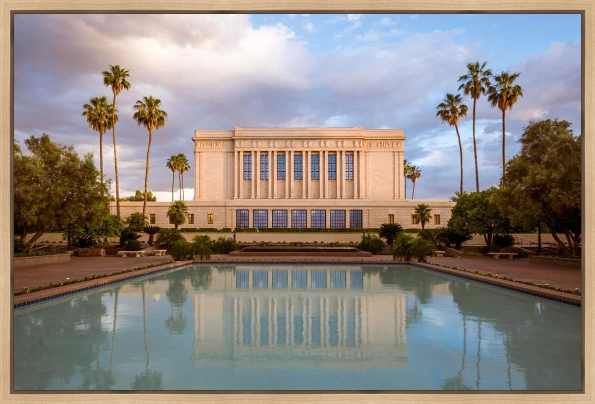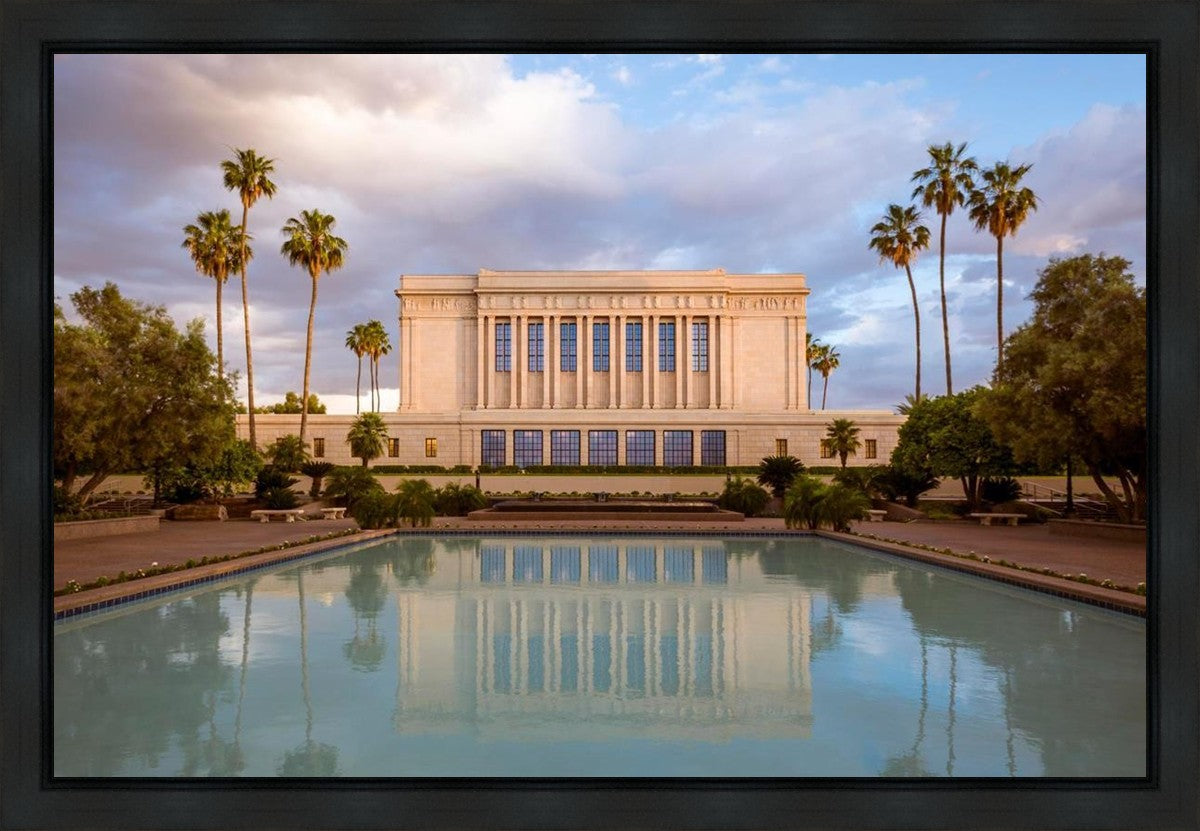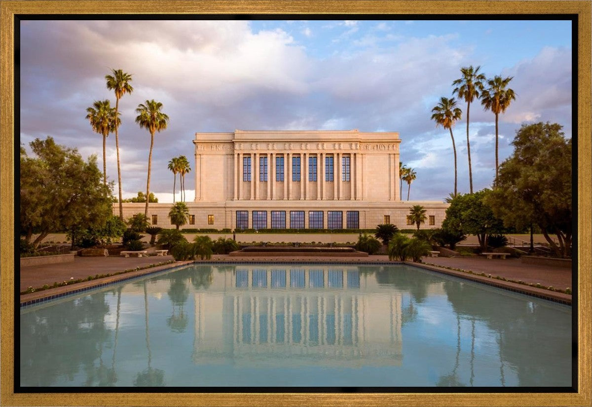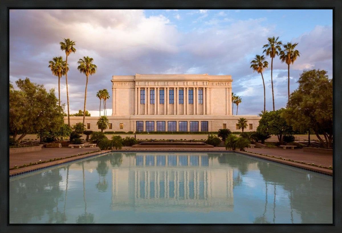 A peaceful garden view of the Mesa, Arizona temple at sunset